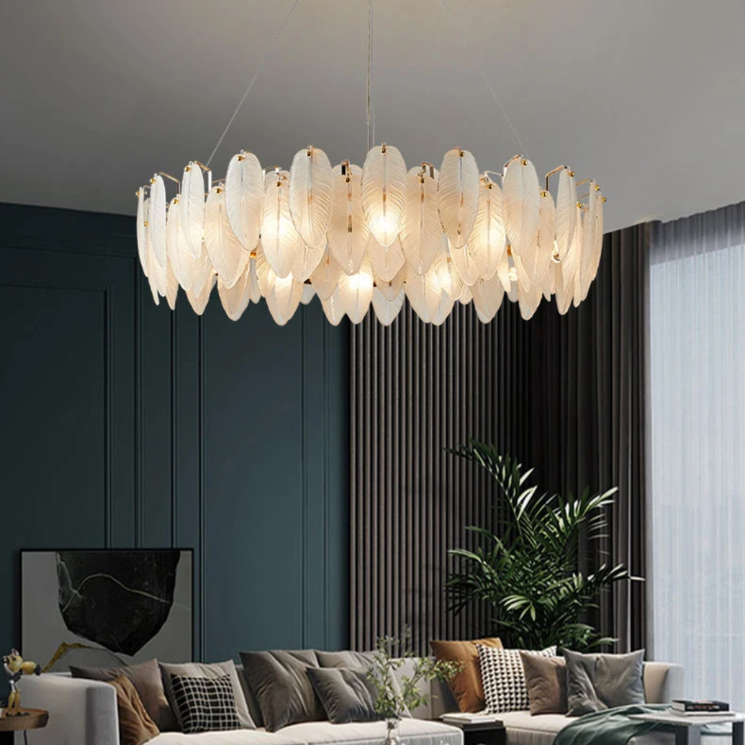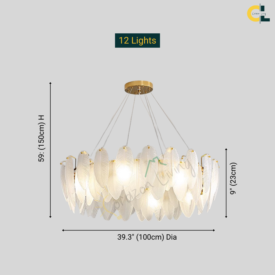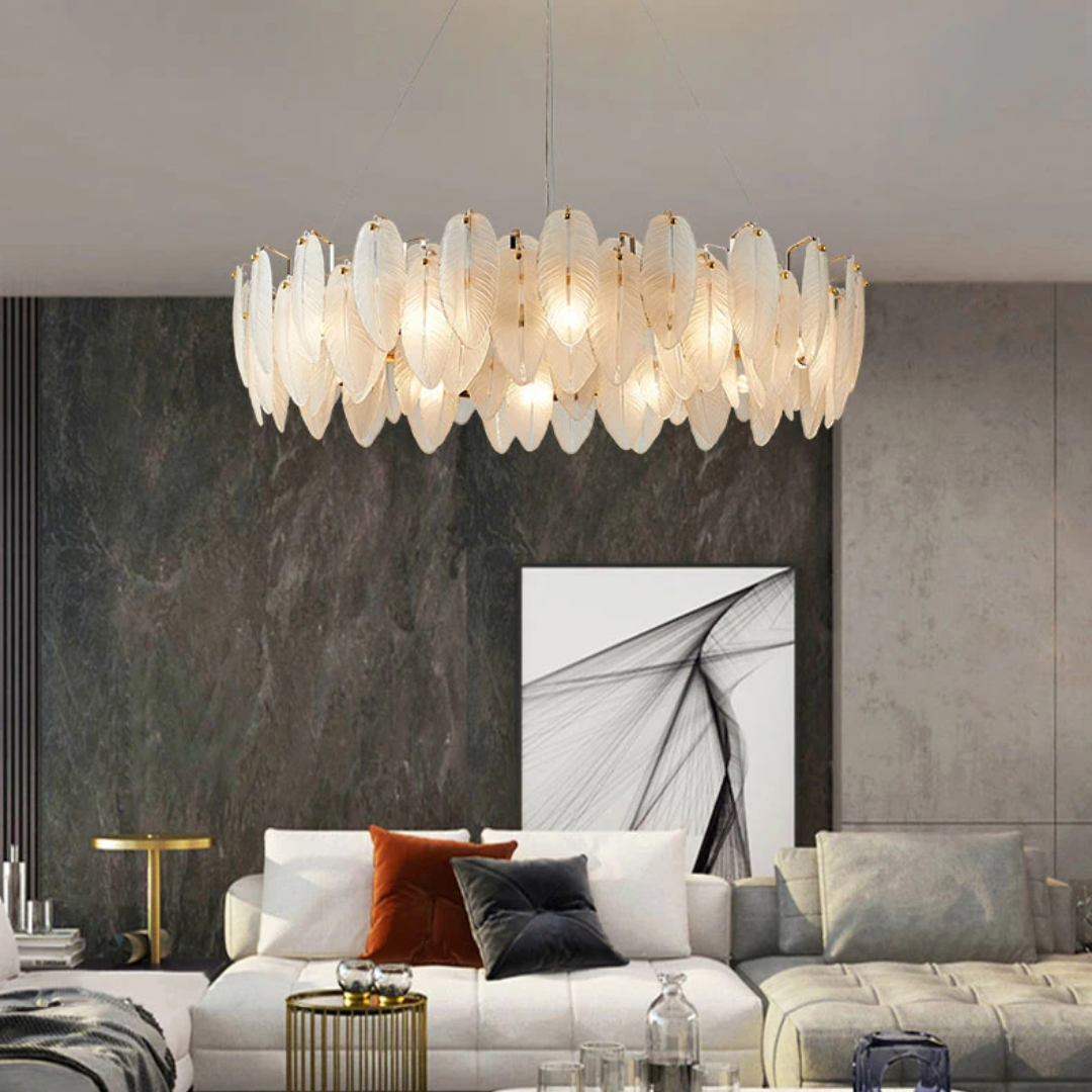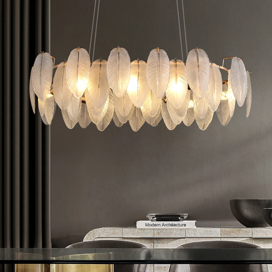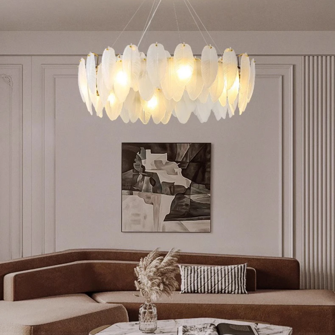 The Odette Modern Feather Crystal Chandelier brings a touch of refined artistry to your home. Featuring hand-crafted glass feather panels arranged in a circular and rectangular design, this chandelier diffuses a warm, inviting glow while adding sophistication to any modern interior.