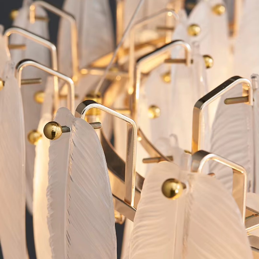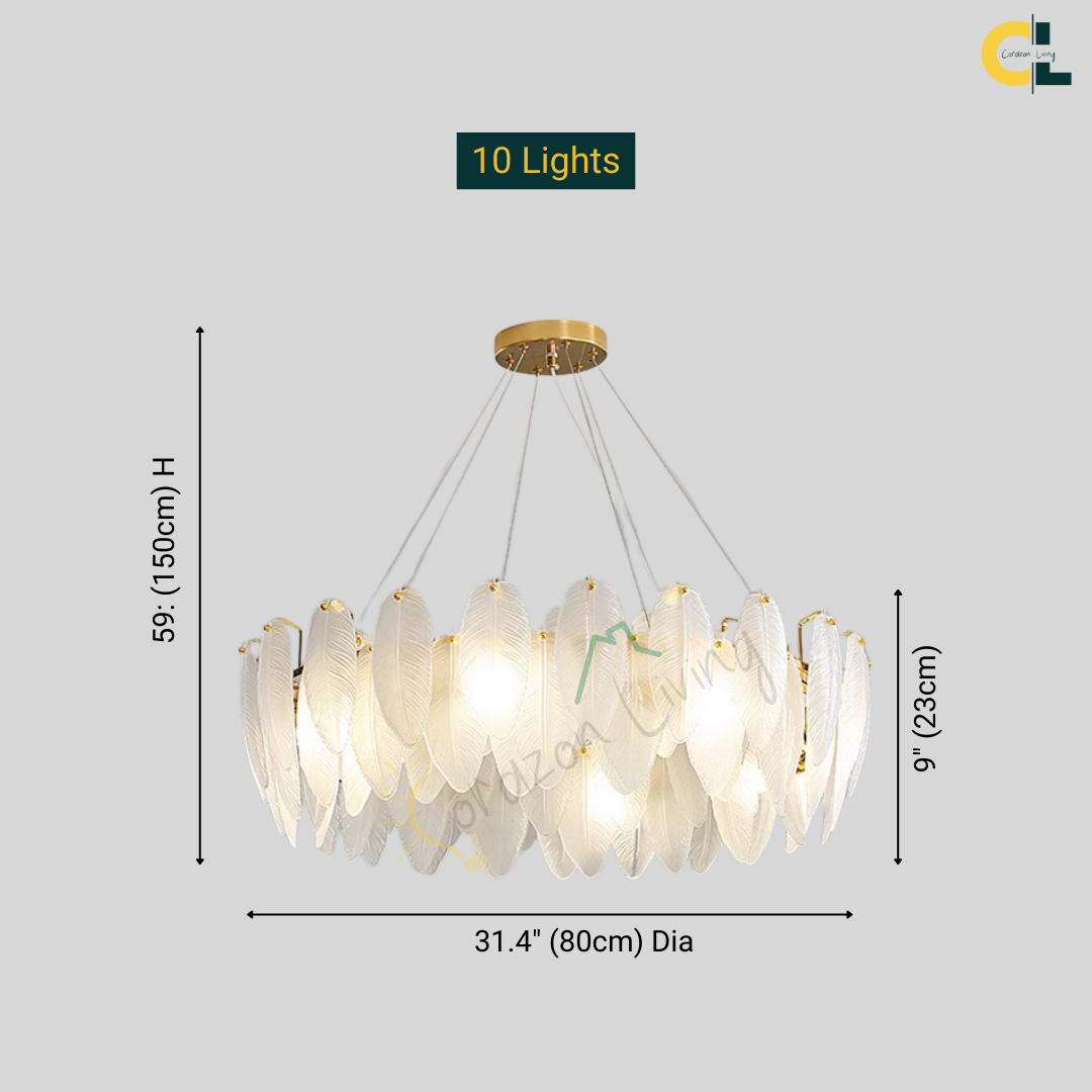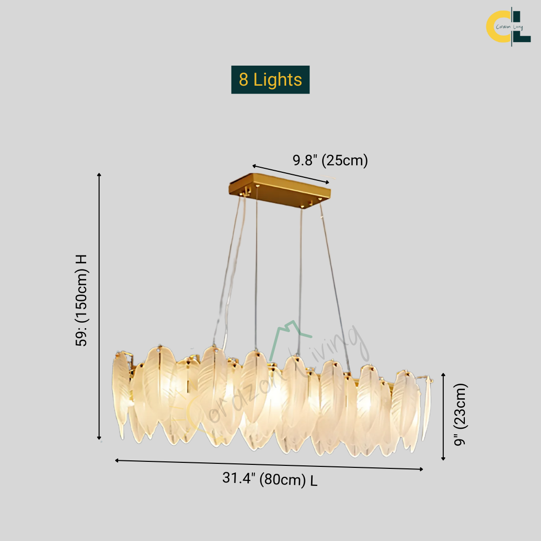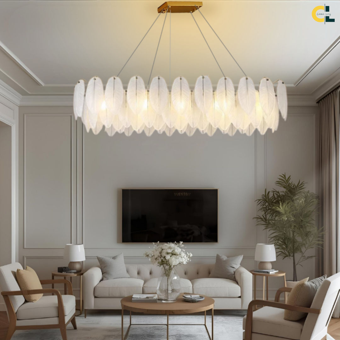 The Odette Modern Feather Crystal Chandelier brings a touch of refined artistry to your home. Featuring hand-crafted glass feather panels arranged in a circular and rectangular design, this chandelier diffuses a warm, inviting glow while adding sophistication to any modern interior.