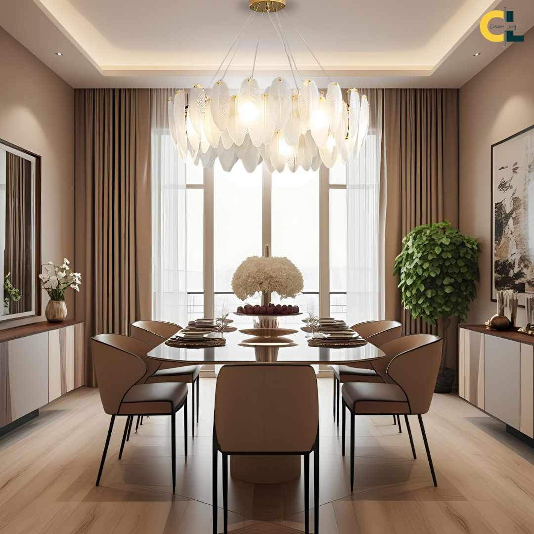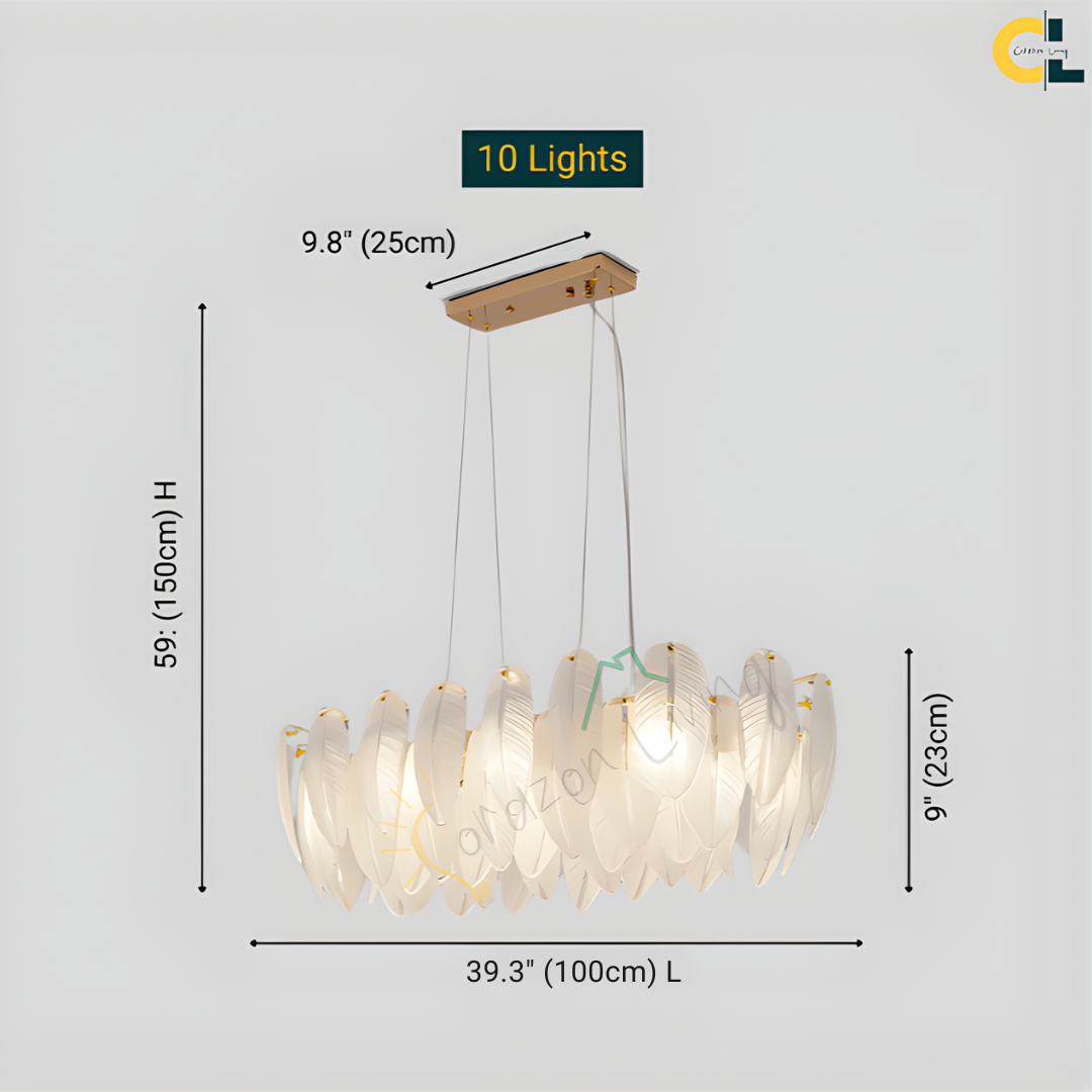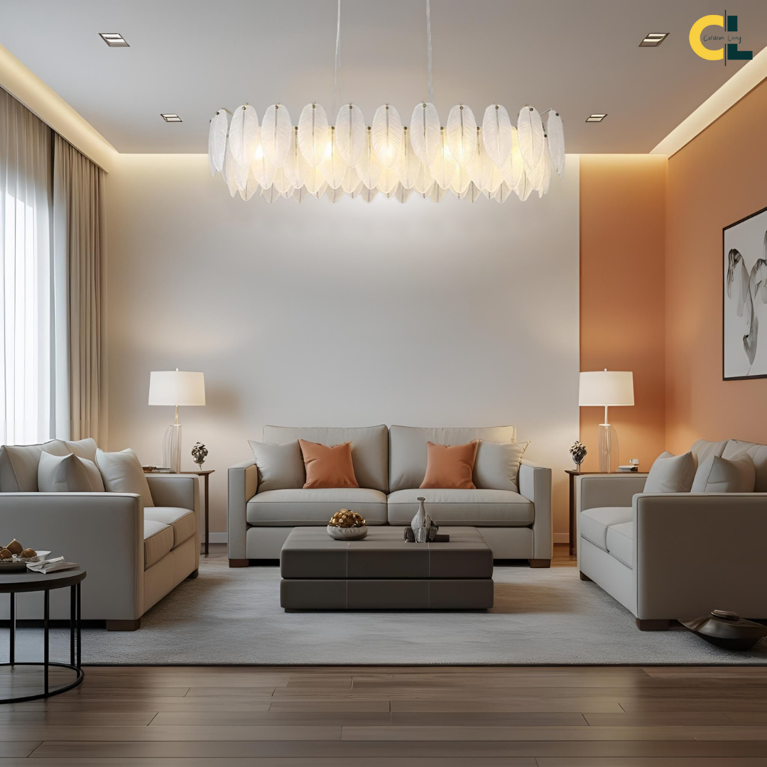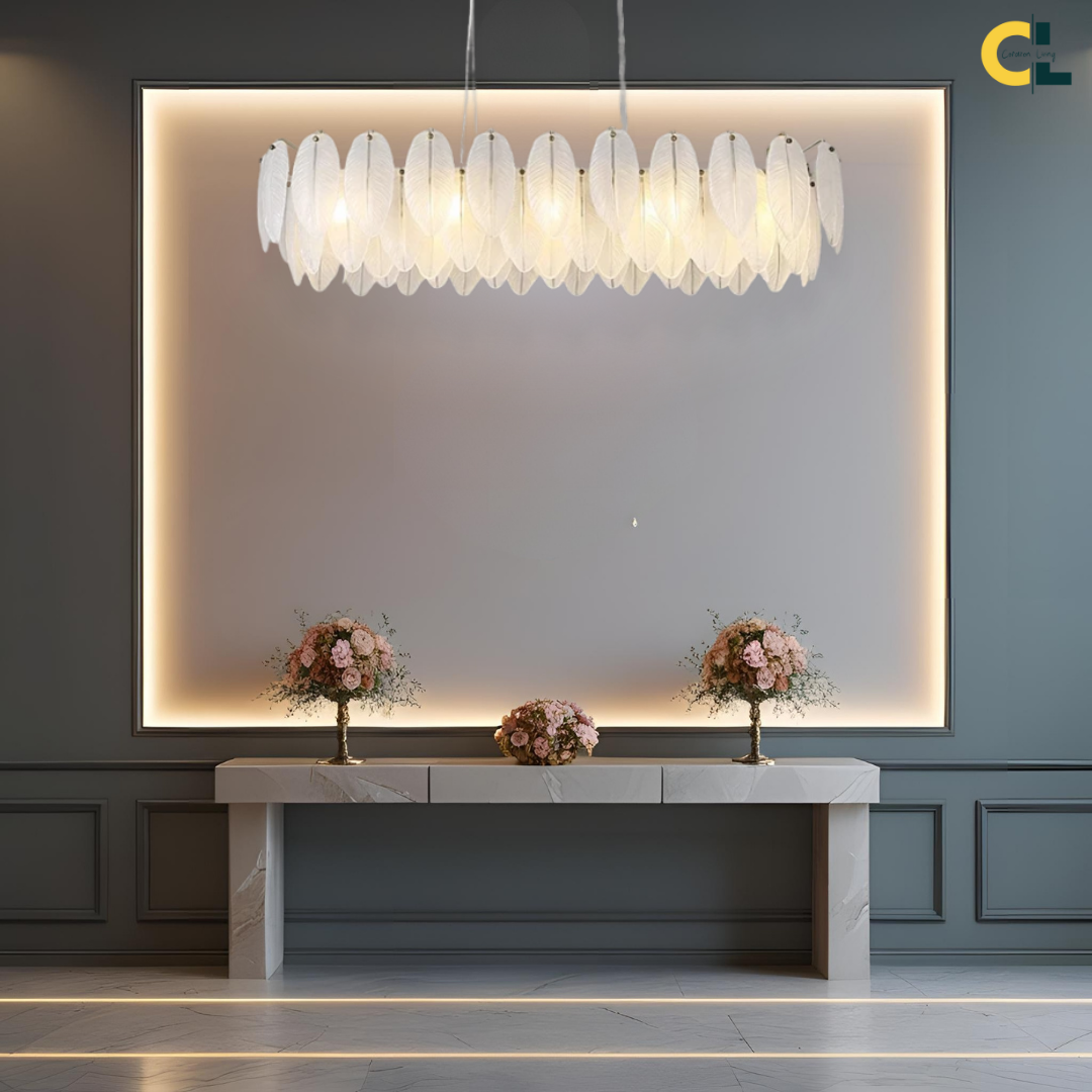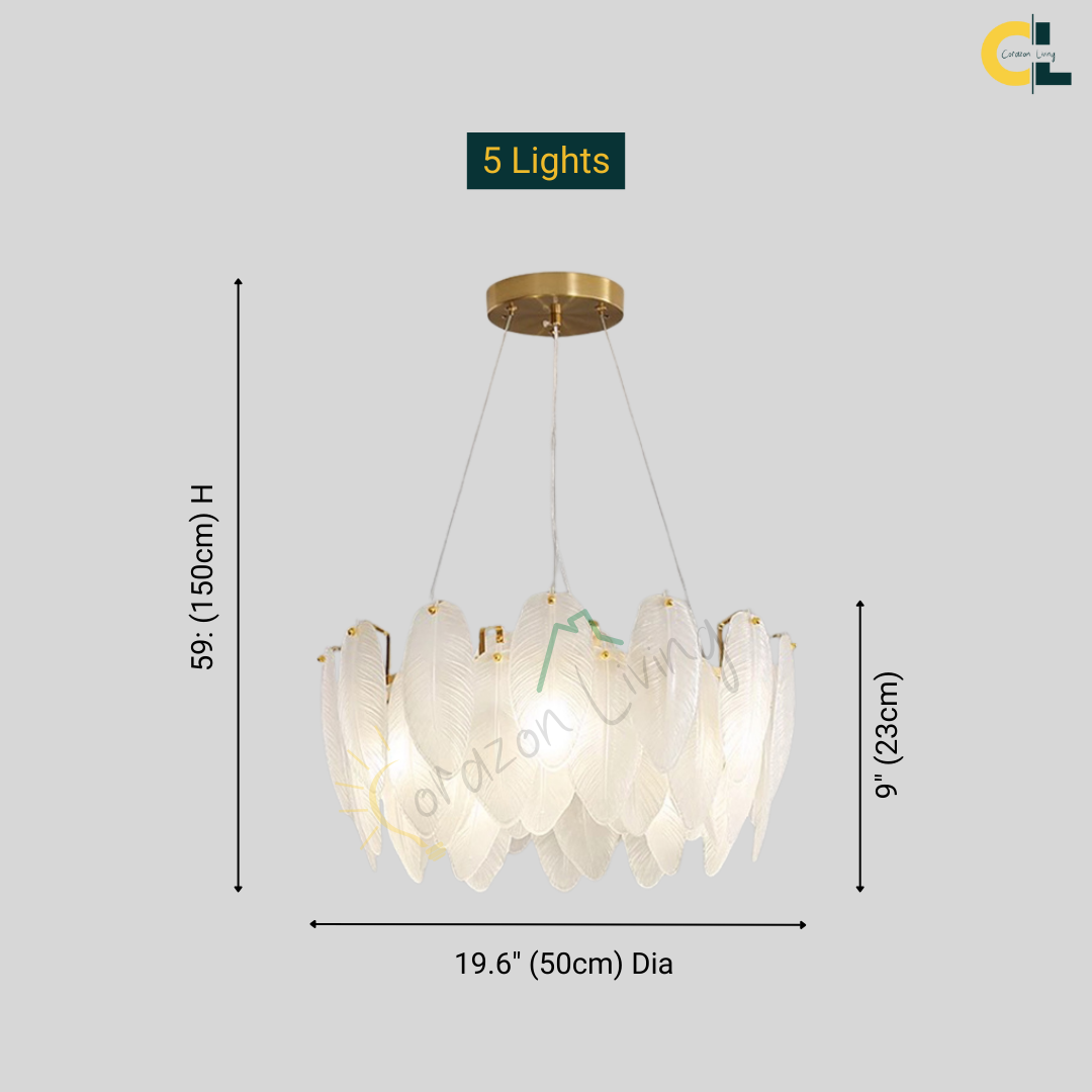 The Odette Modern Feather Crystal Chandelier brings a touch of refined artistry to your home. Featuring hand-crafted glass feather panels arranged in a circular and rectangular design, this chandelier diffuses a warm, inviting glow while adding sophistication to any modern interior.