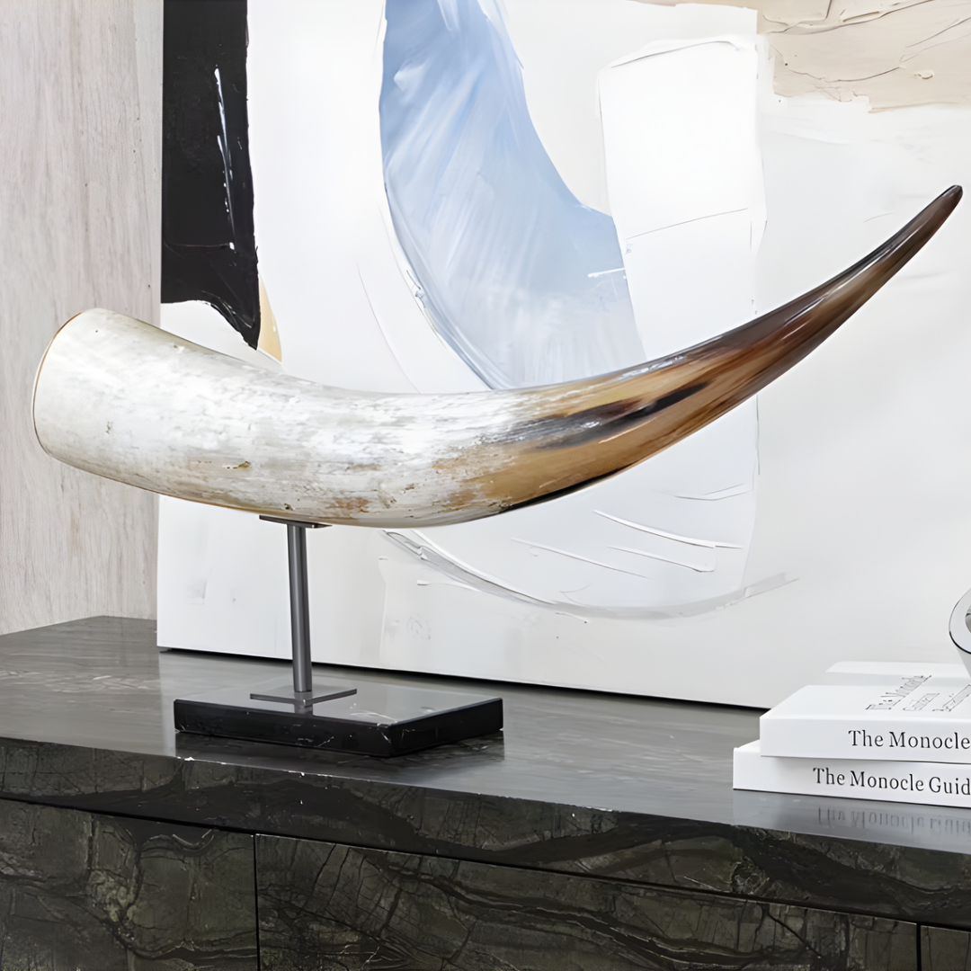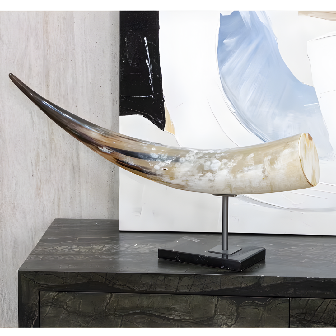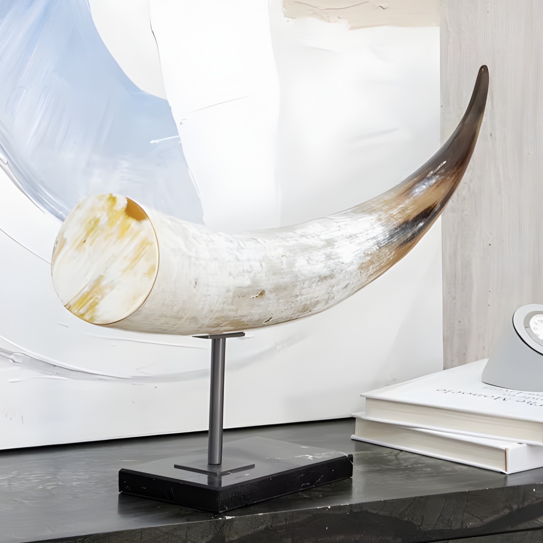 Handmade natural ox horn ornament on a marble base for luxury decor