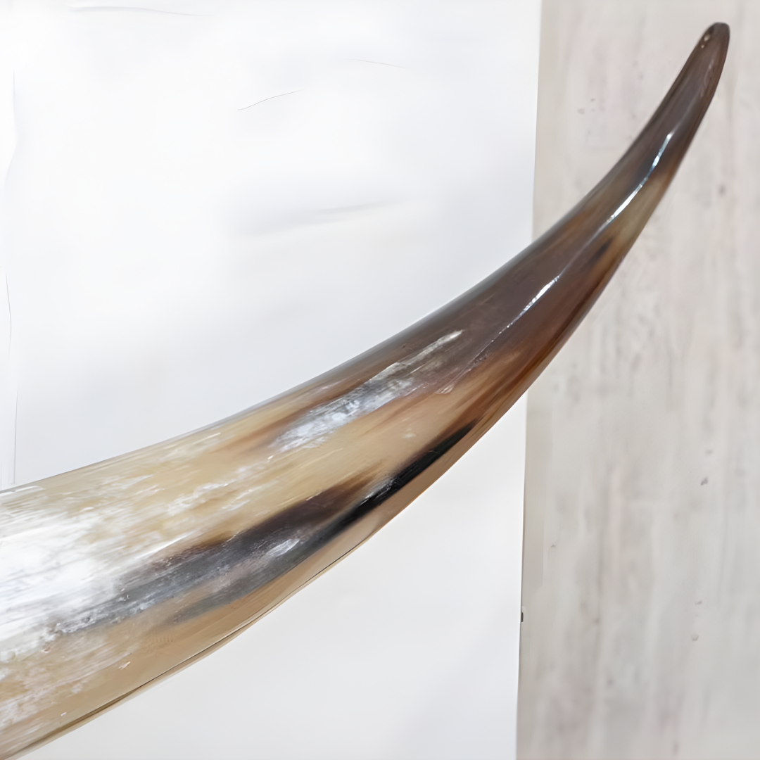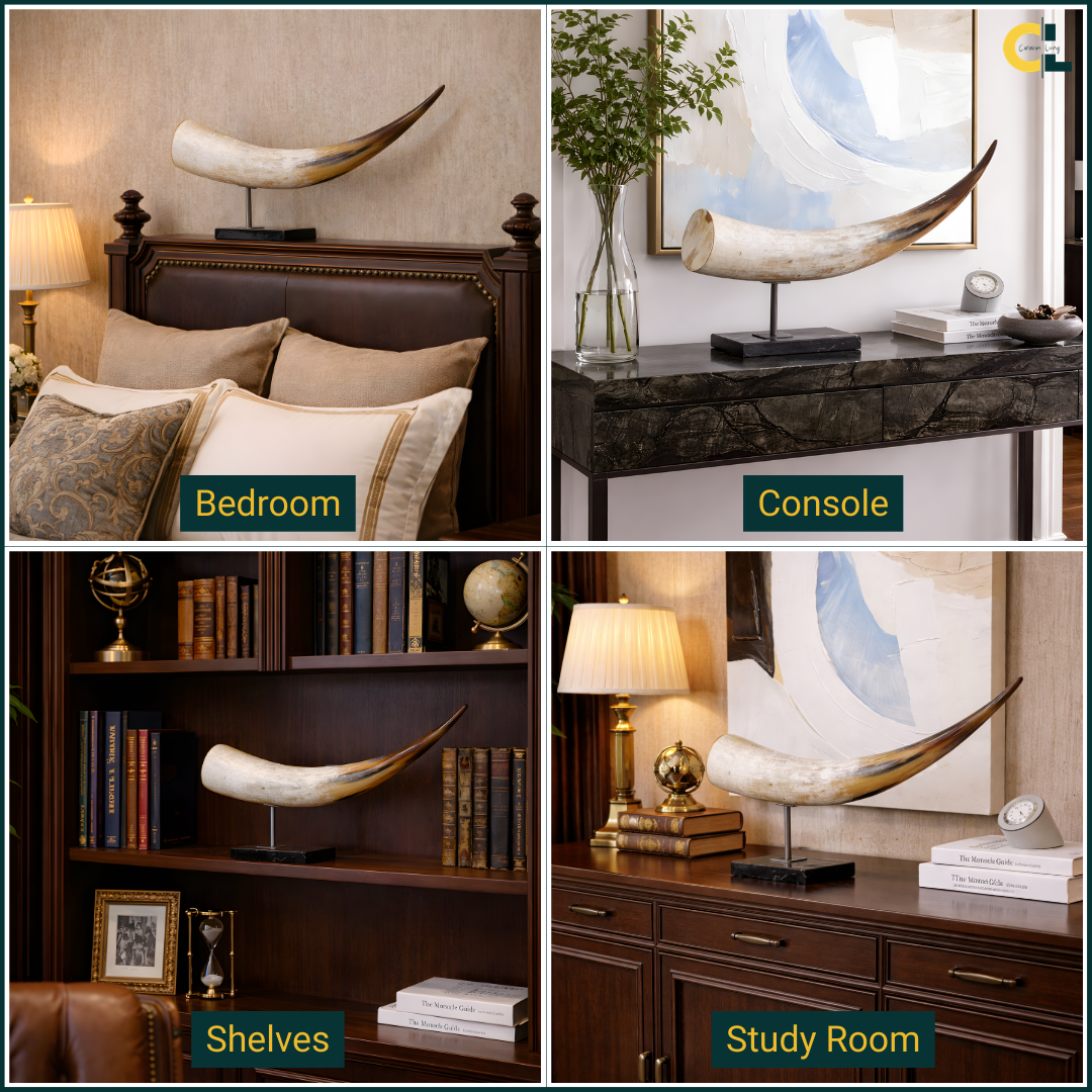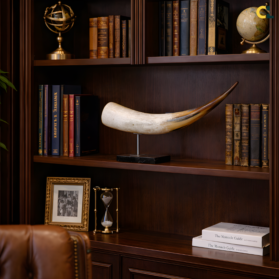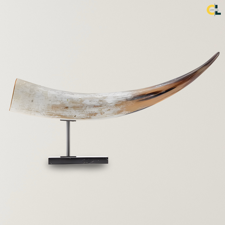 Handmade natural ox horn ornament on a marble base for luxury decor