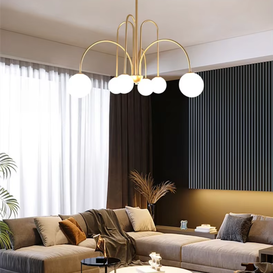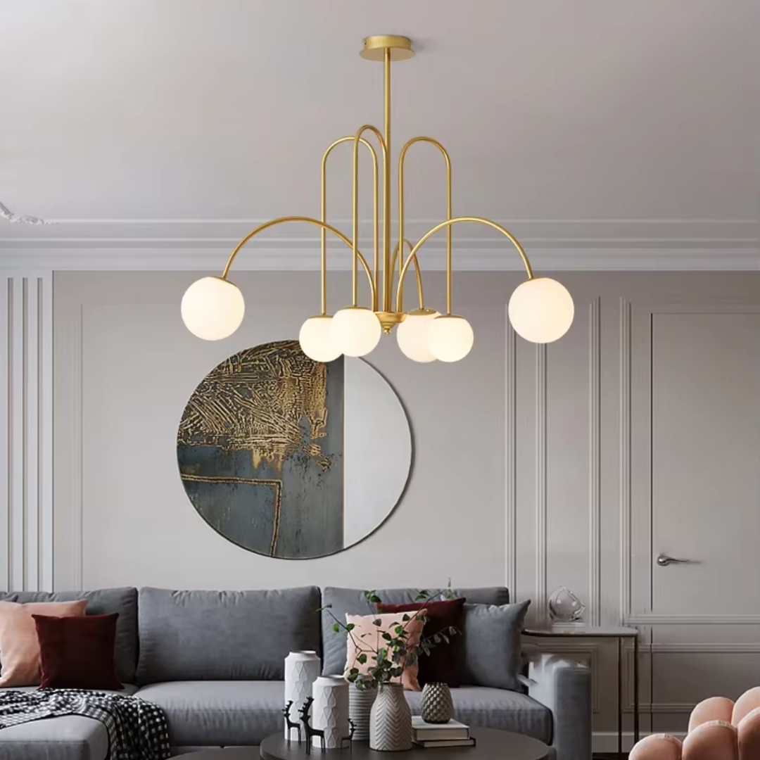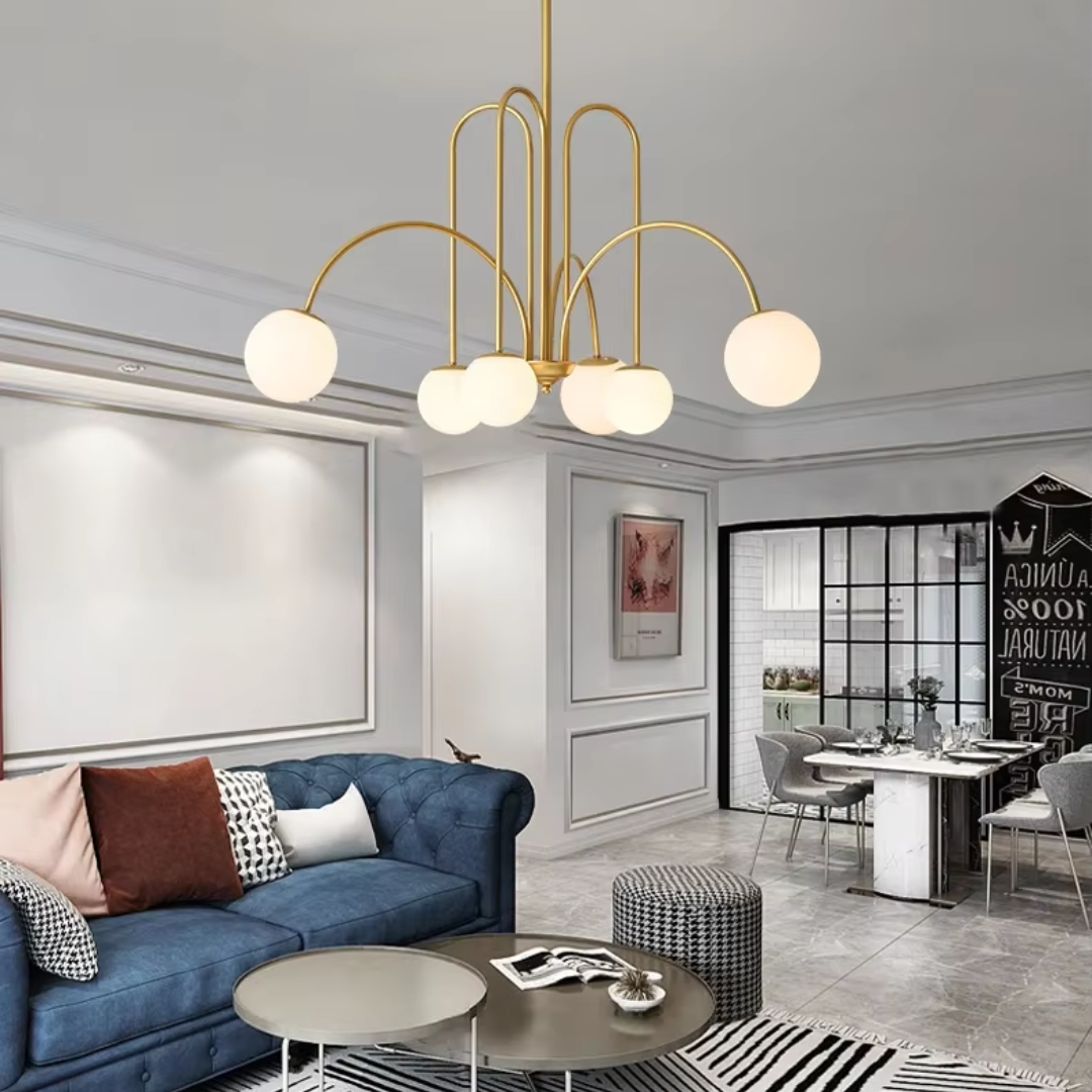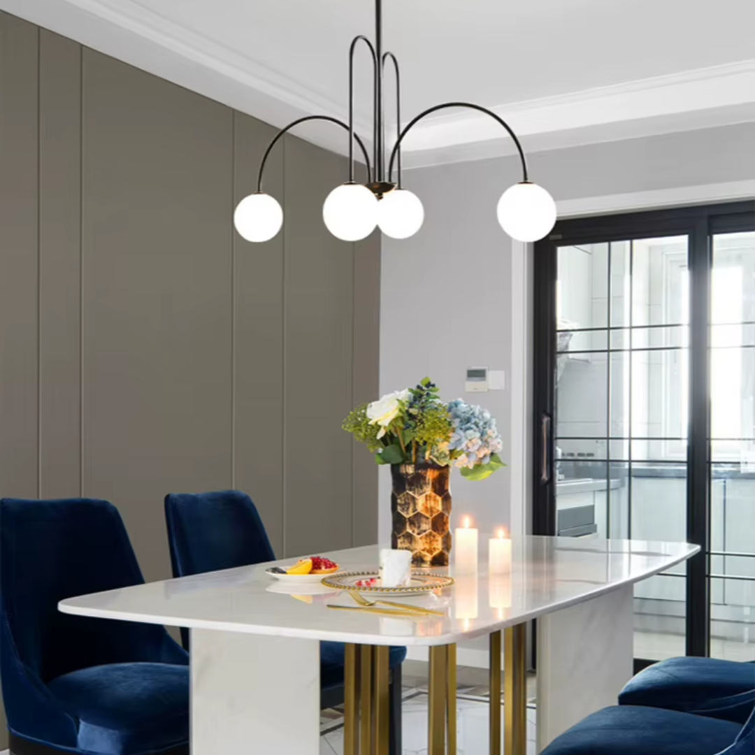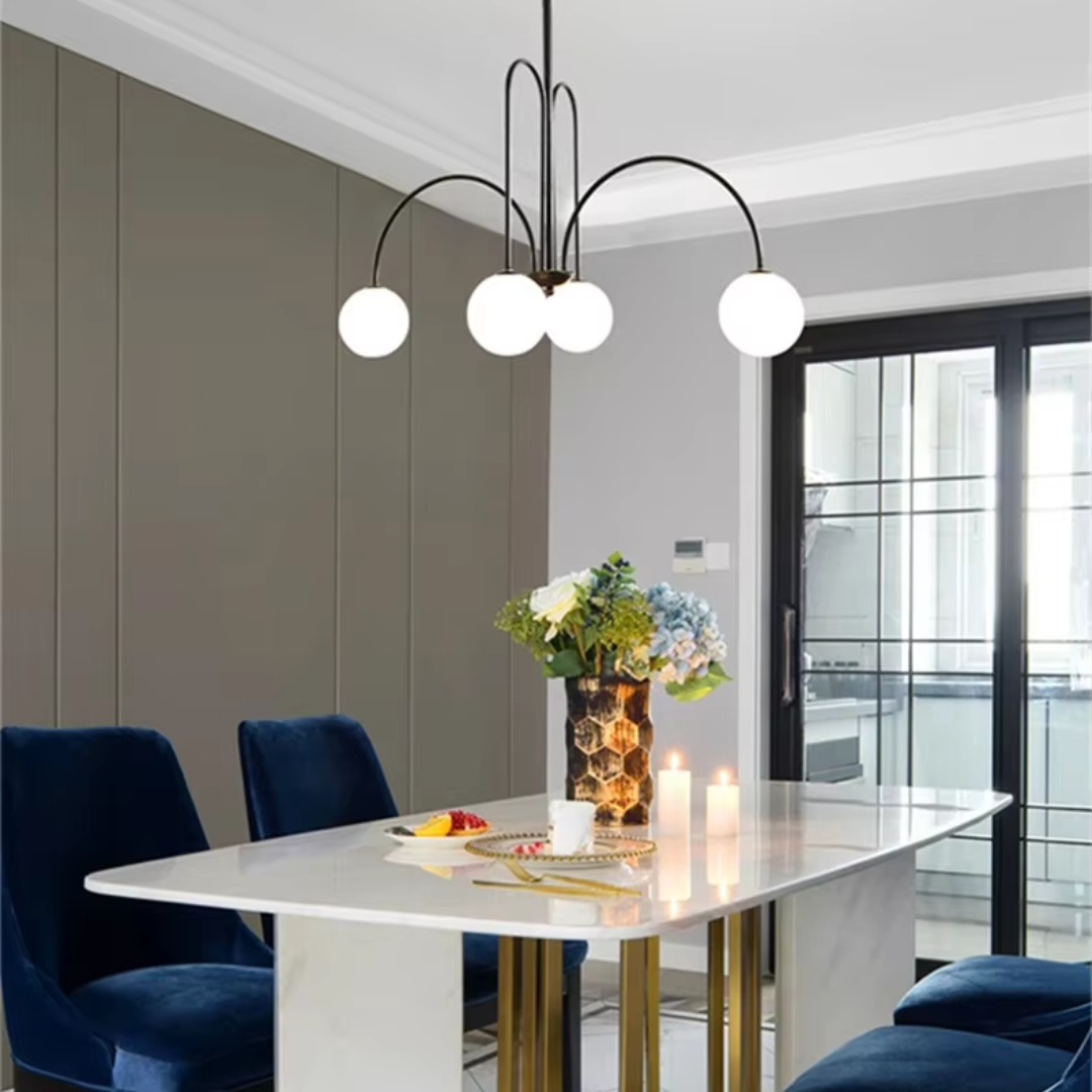 A vintage Nordic-inspired chandelier featuring milky glass globes and a sleek metal frame, blending timeless elegance with warm, ambient illumination.
