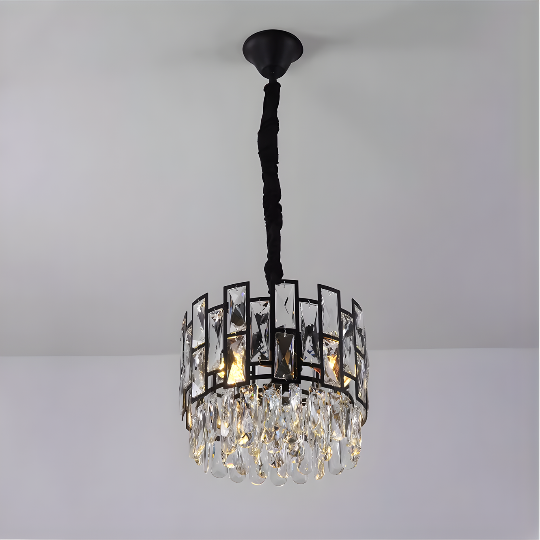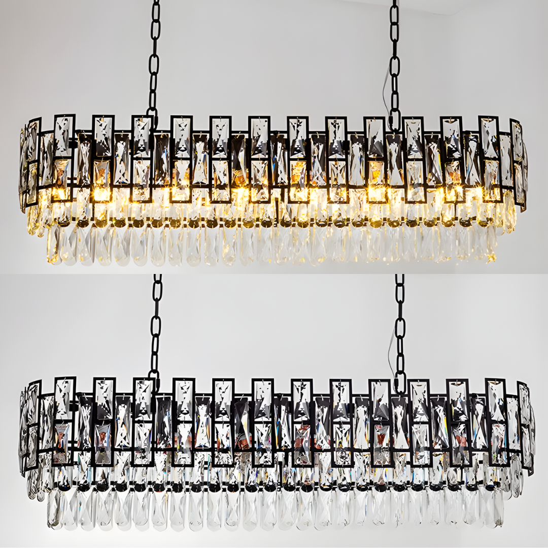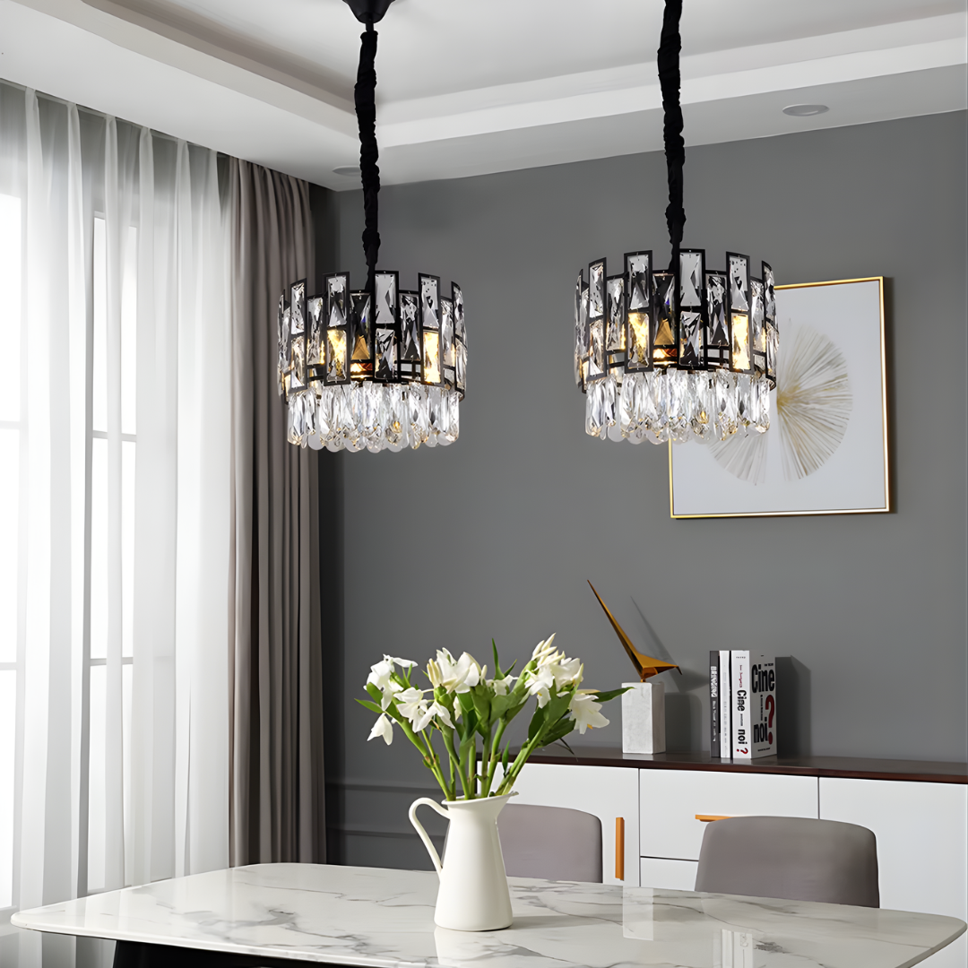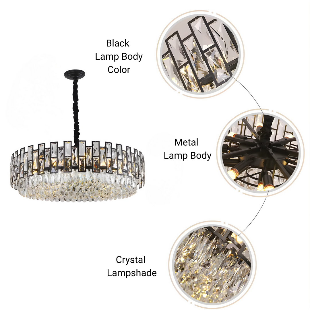 A modern black metal and crystal chandelier with dimmable LED lighting in warm or cool tones, delivering elegant ambiance and sophisticated style for any interior.