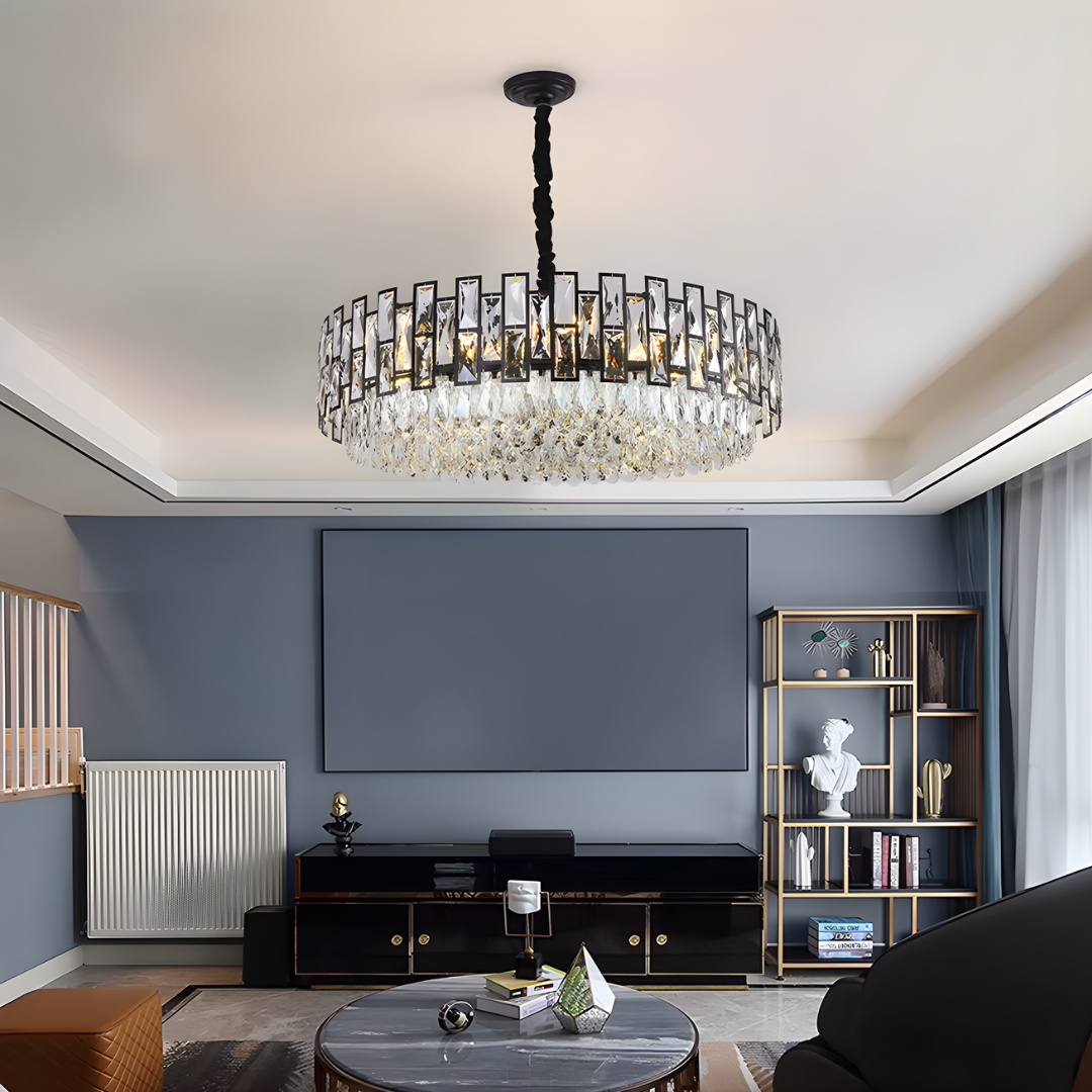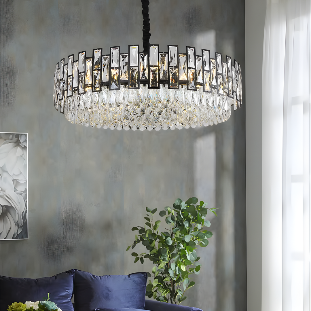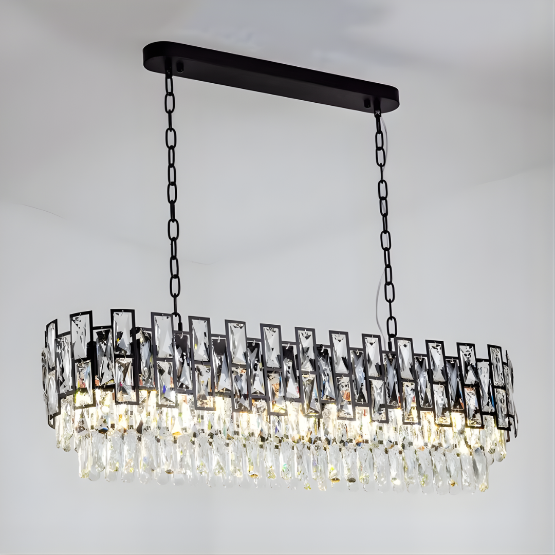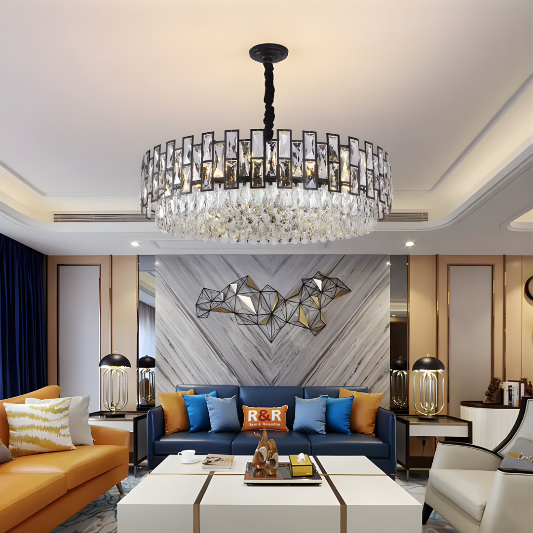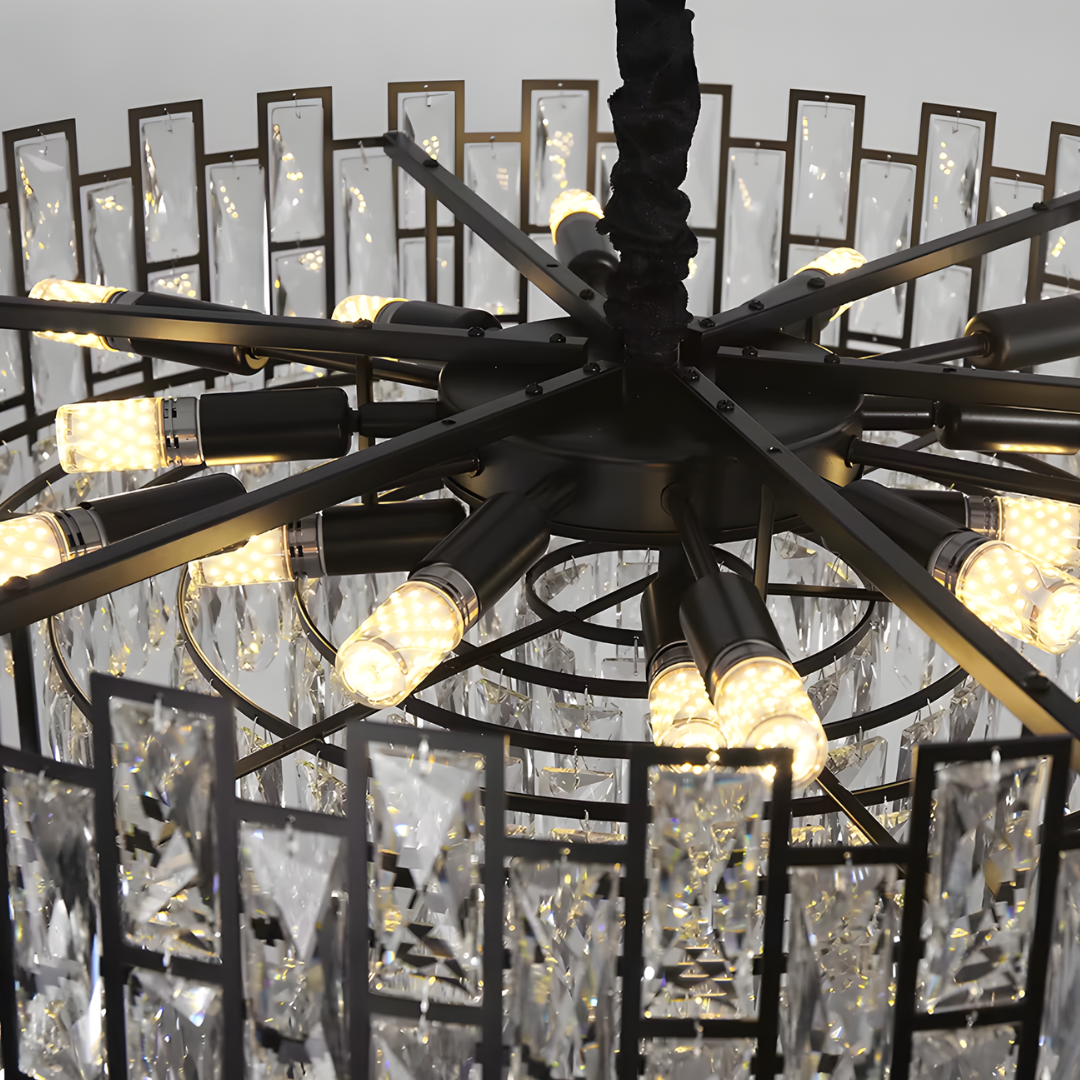 A modern black metal and crystal chandelier with dimmable LED lighting in warm or cool tones, delivering elegant ambiance and sophisticated style for any interior.