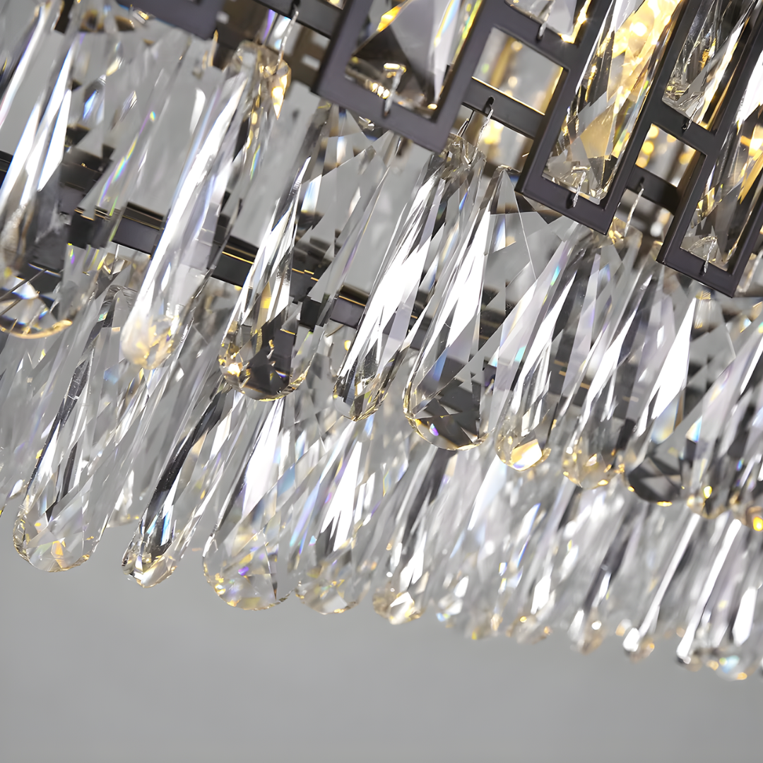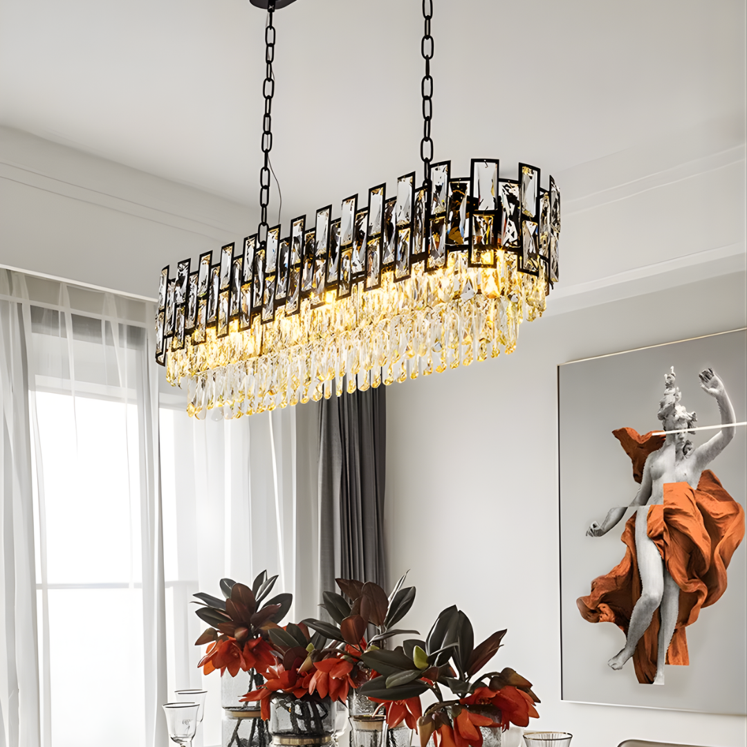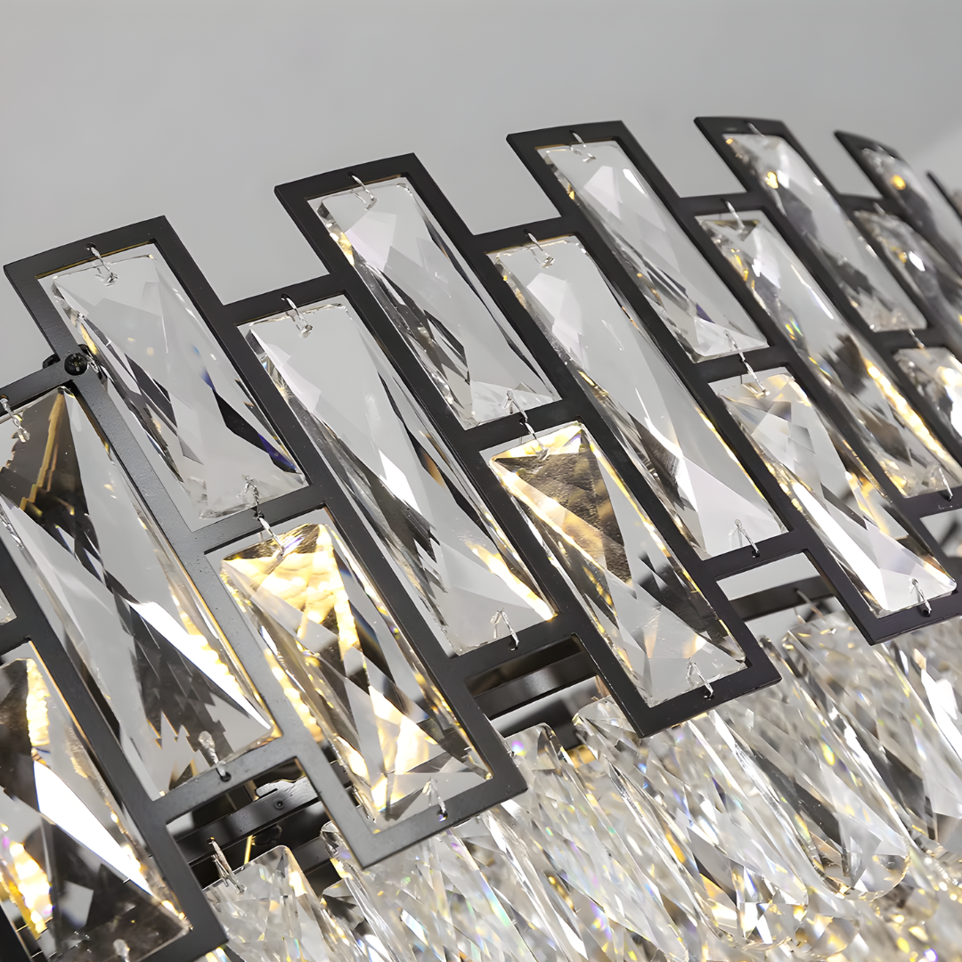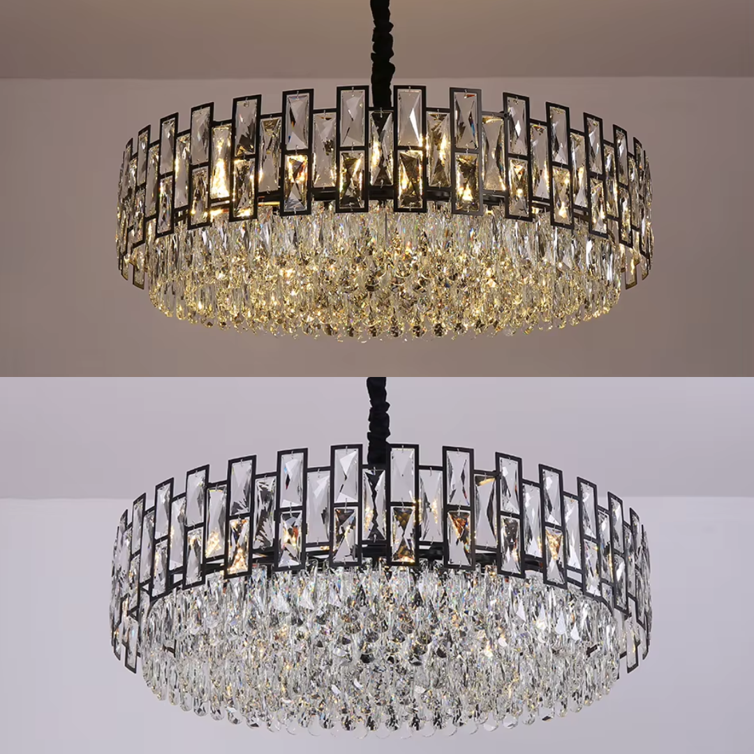 A modern black metal and crystal chandelier with dimmable LED lighting in warm or cool tones, delivering elegant ambiance and sophisticated style for any interior.
