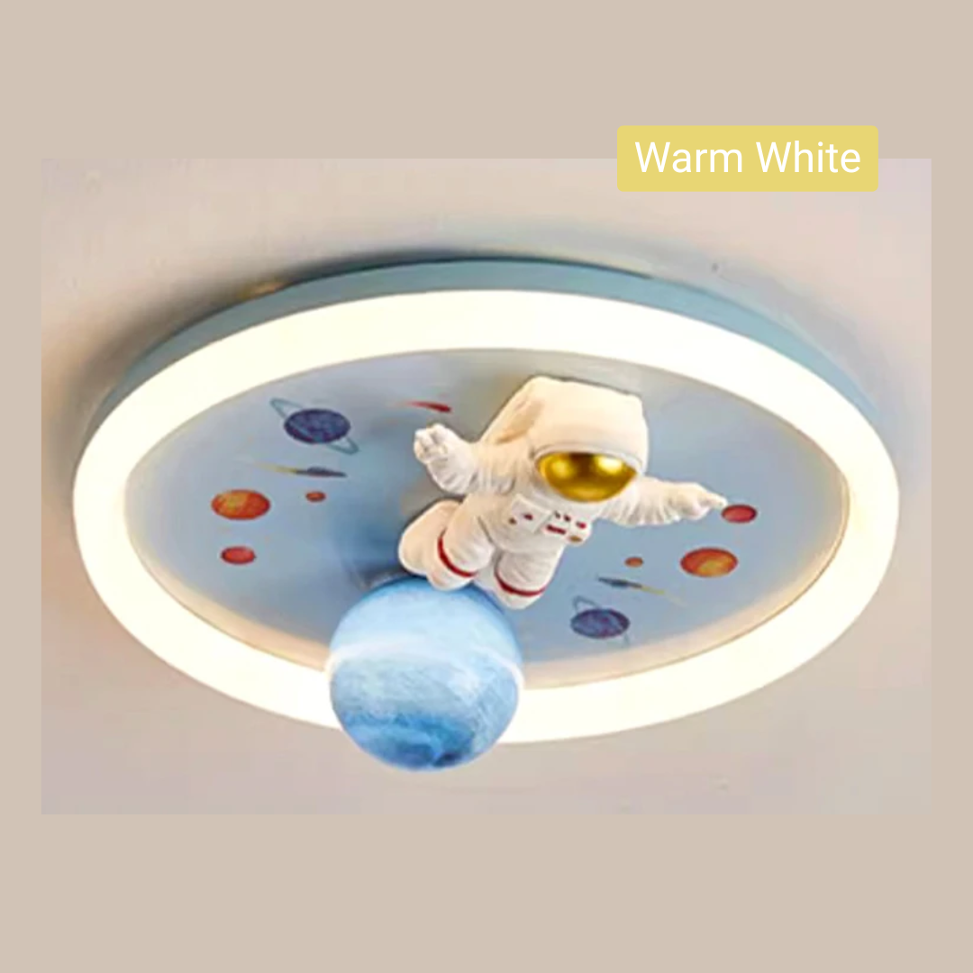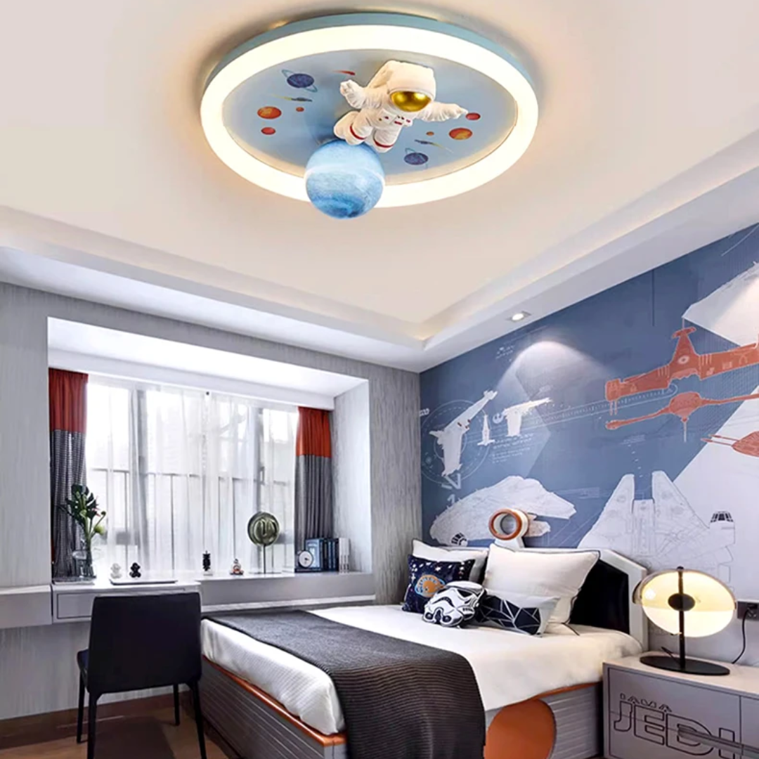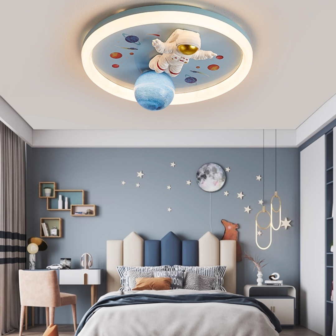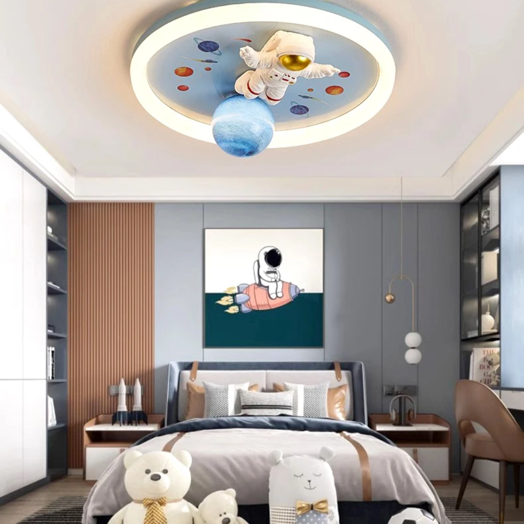 This LED ceiling light features playful astronaut and planet designs, bringing a fun, space-themed ambiance to any child’s room.
