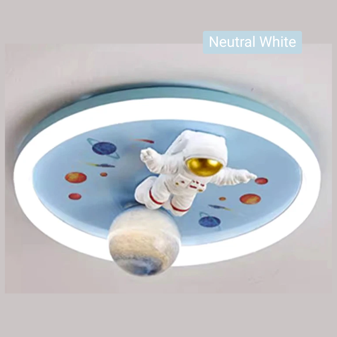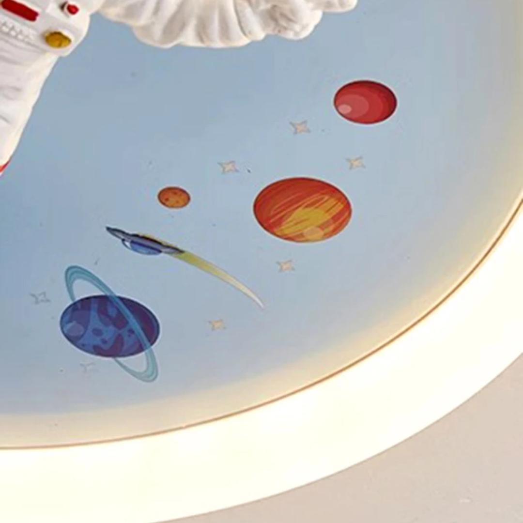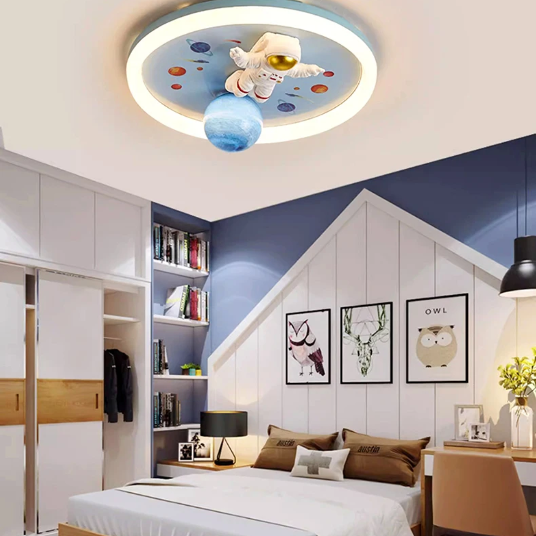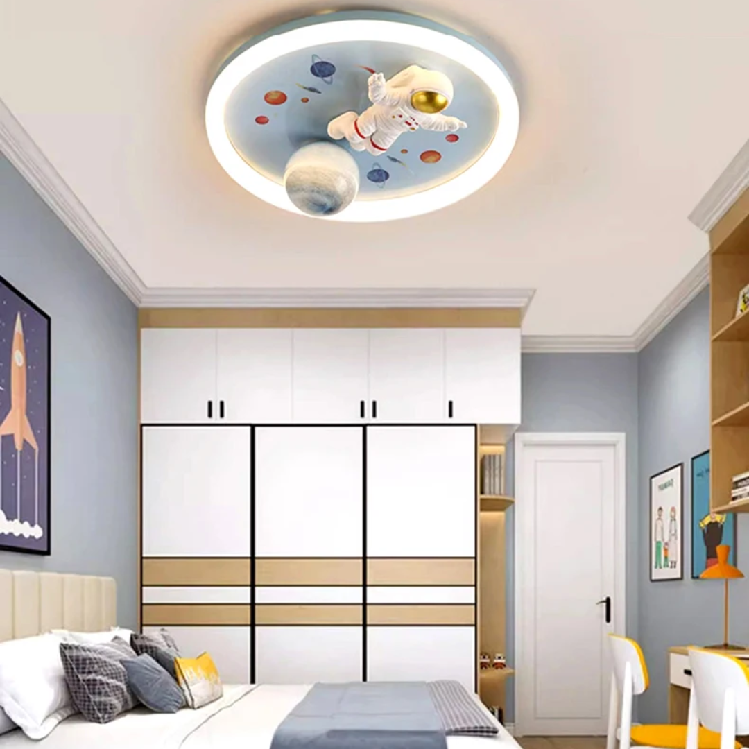 This LED ceiling light features playful astronaut and planet designs, bringing a fun, space-themed ambiance to any child’s room.