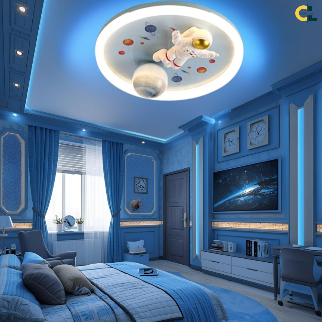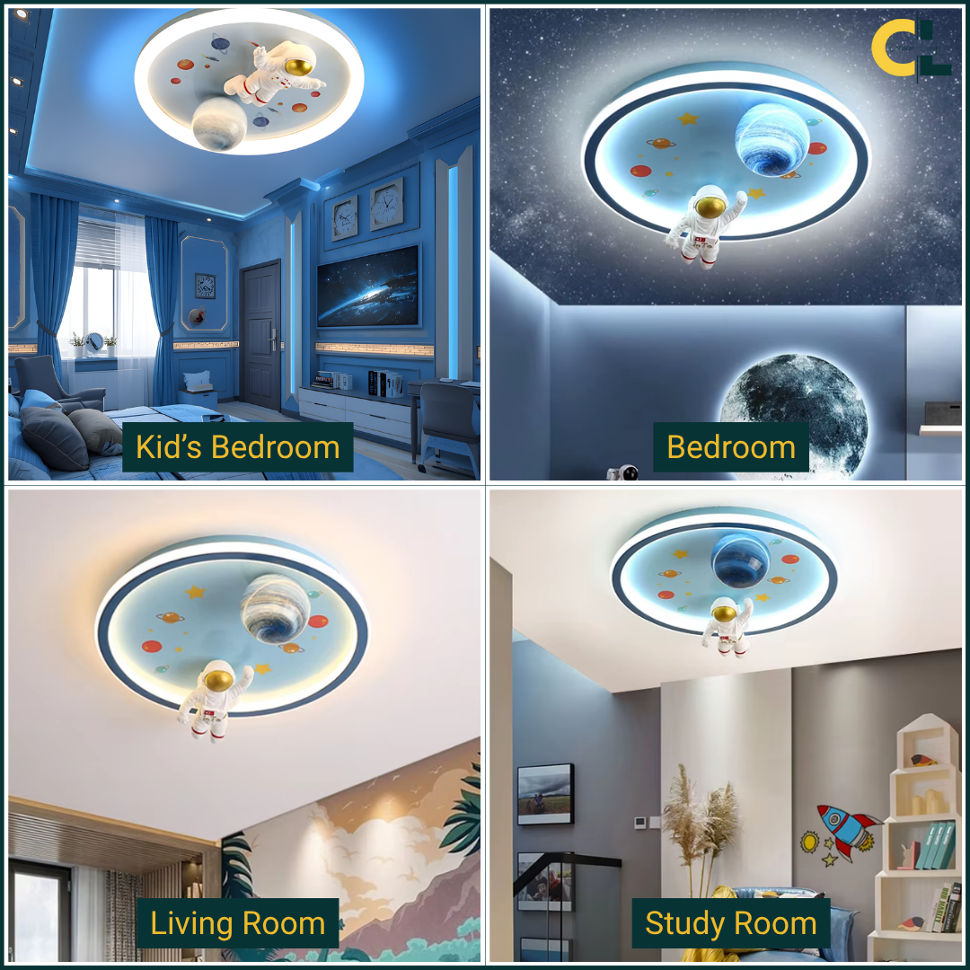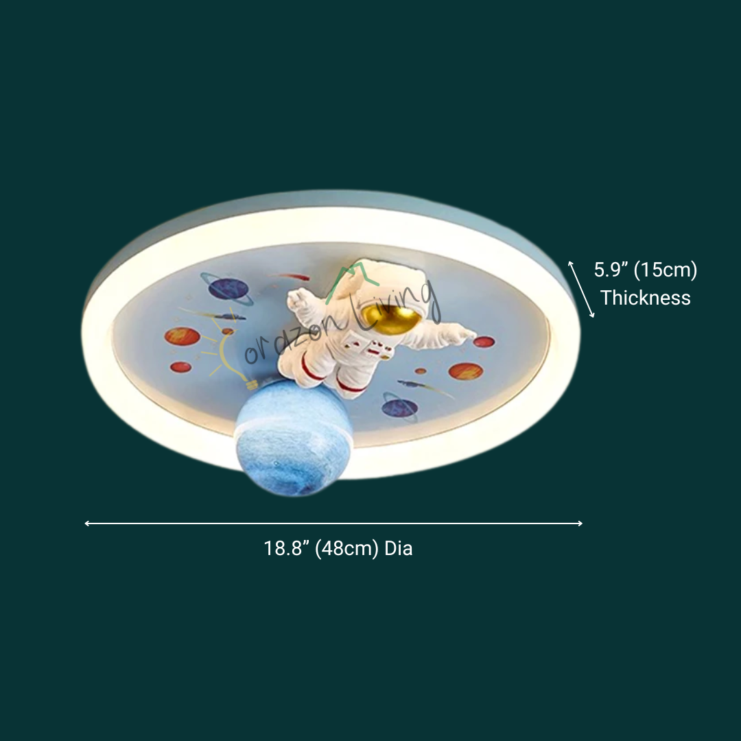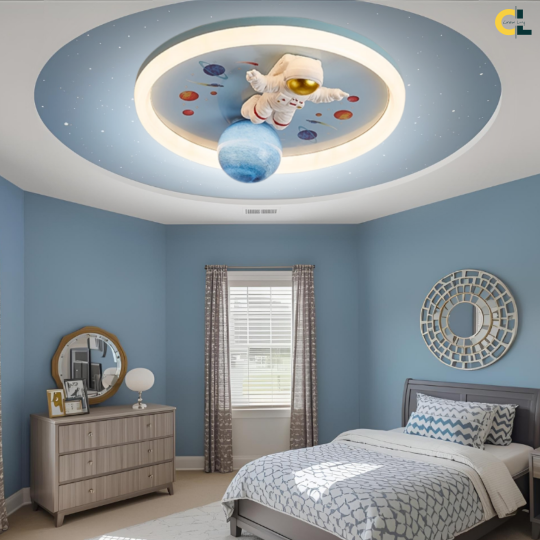 This LED ceiling light features playful astronaut and planet designs, bringing a fun, space-themed ambiance to any child’s room.