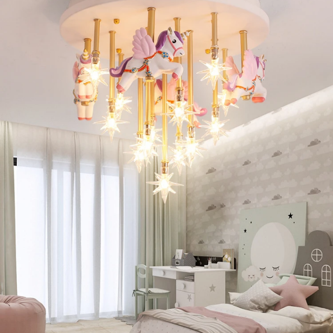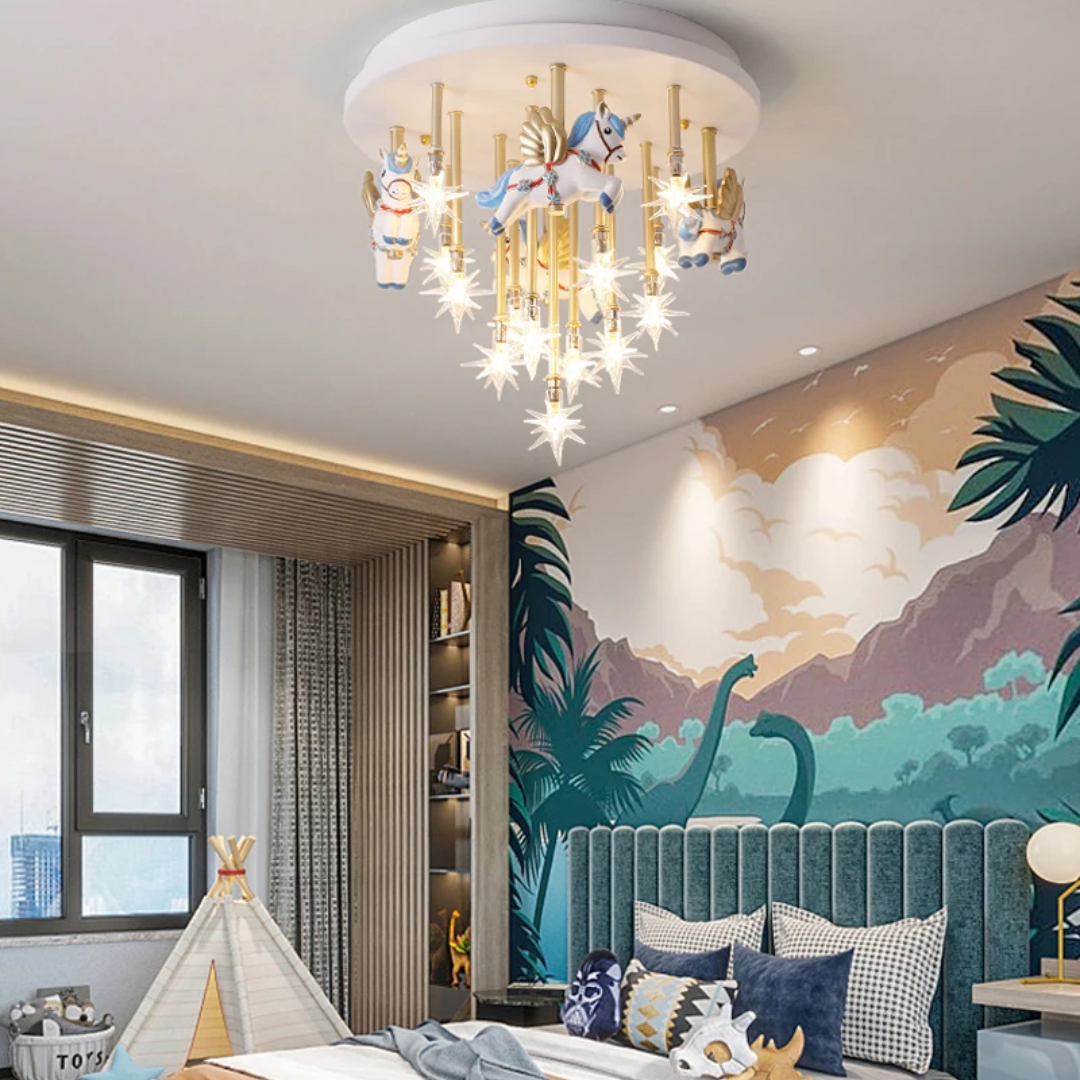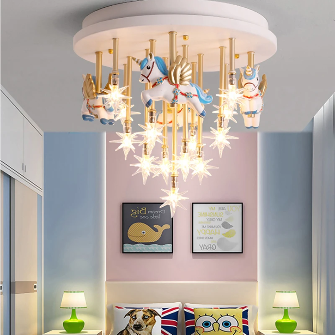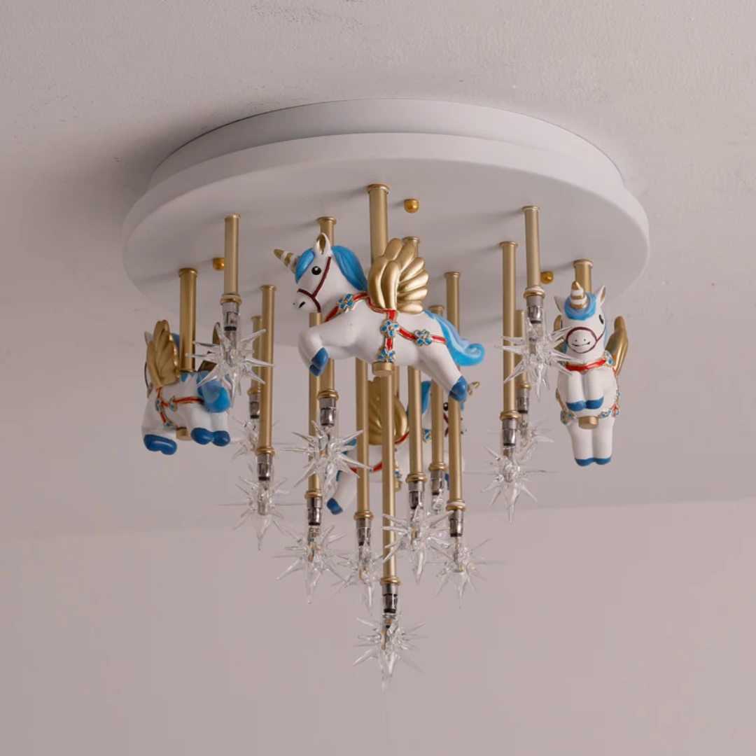 Bring fun and imagination to your child’s room with the whimsical merry-go-round horse ceiling light, combining charming design with bright lighting.
