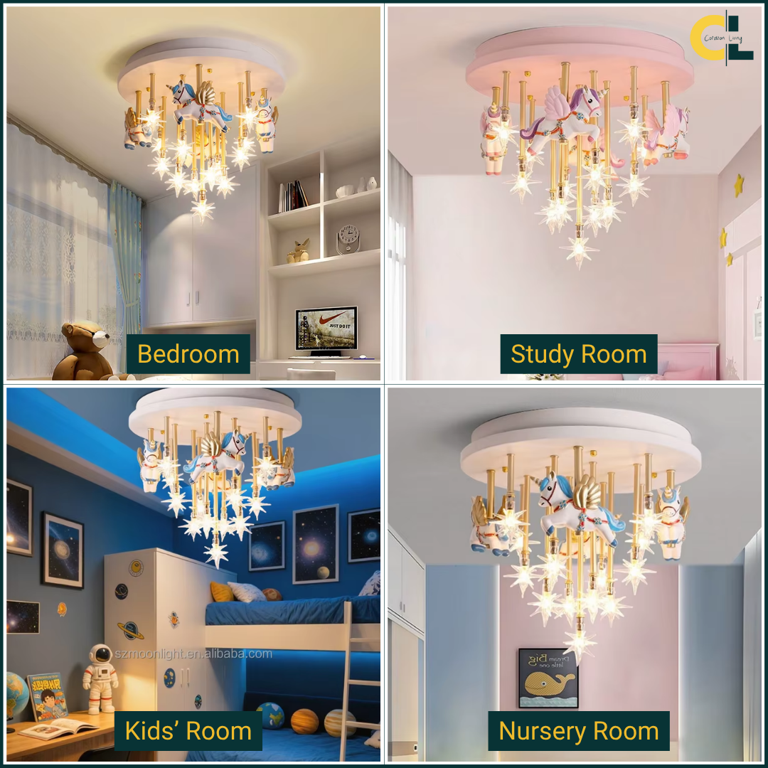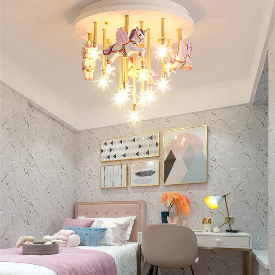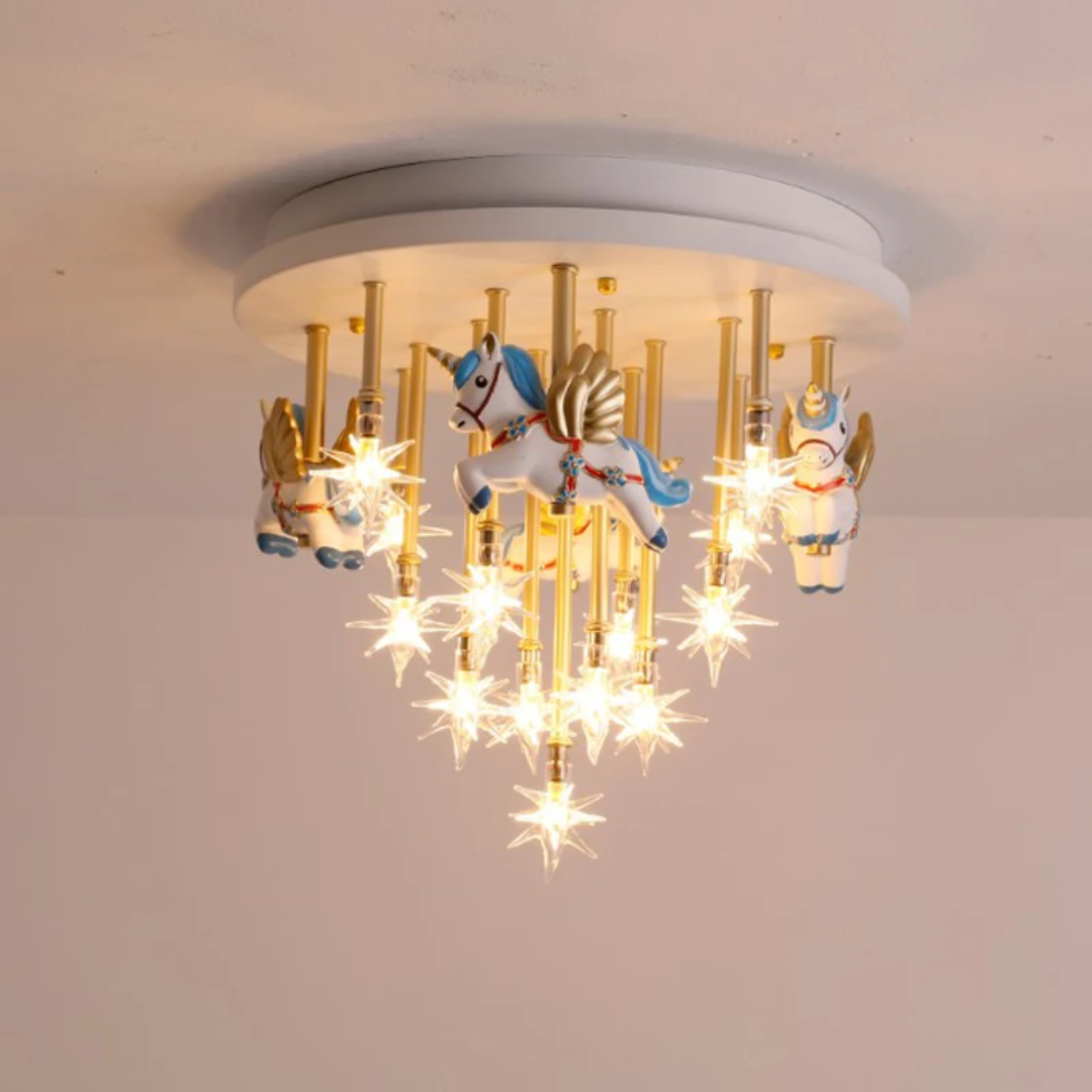 Bring fun and imagination to your child’s room with the whimsical merry-go-round horse ceiling light, combining charming design with bright lighting.