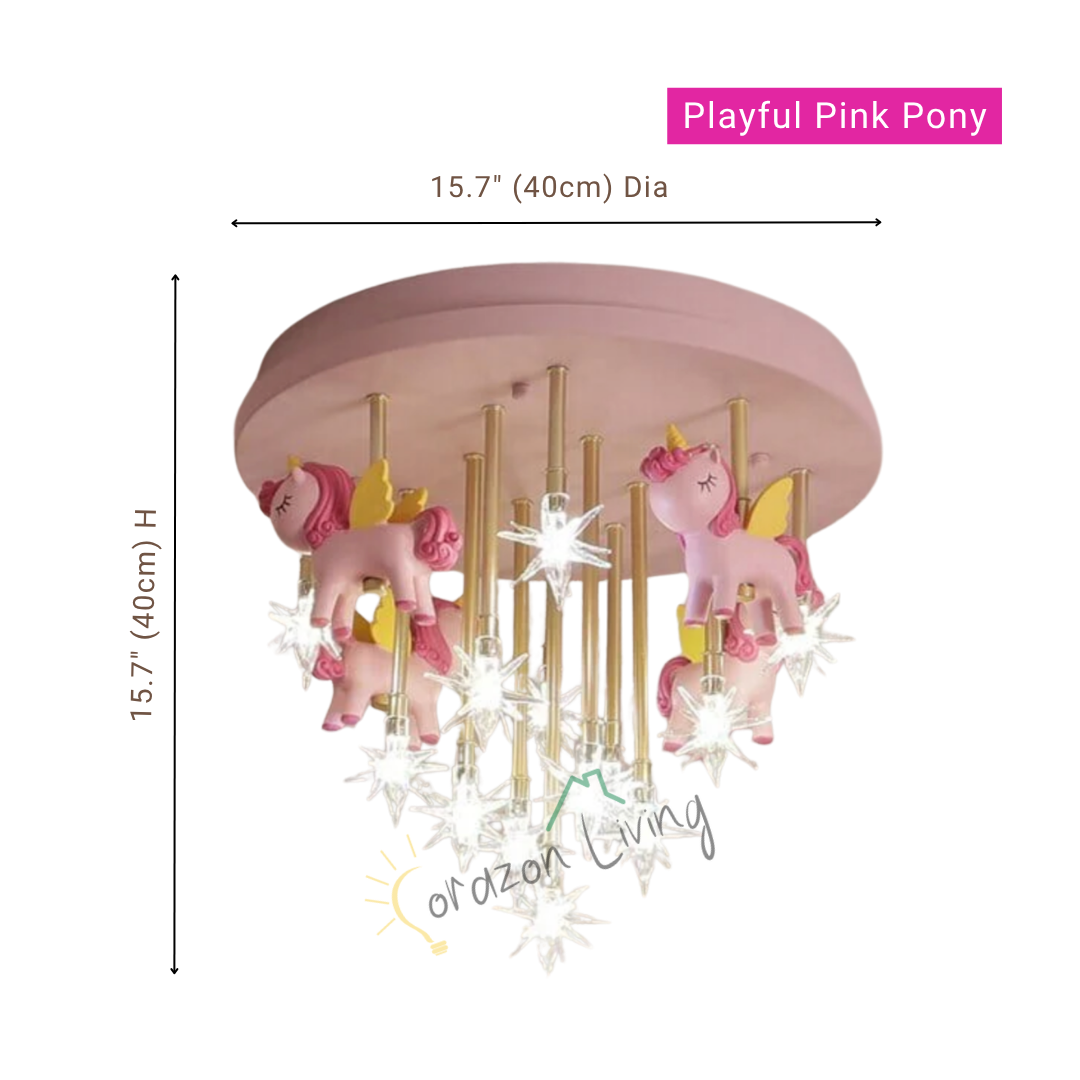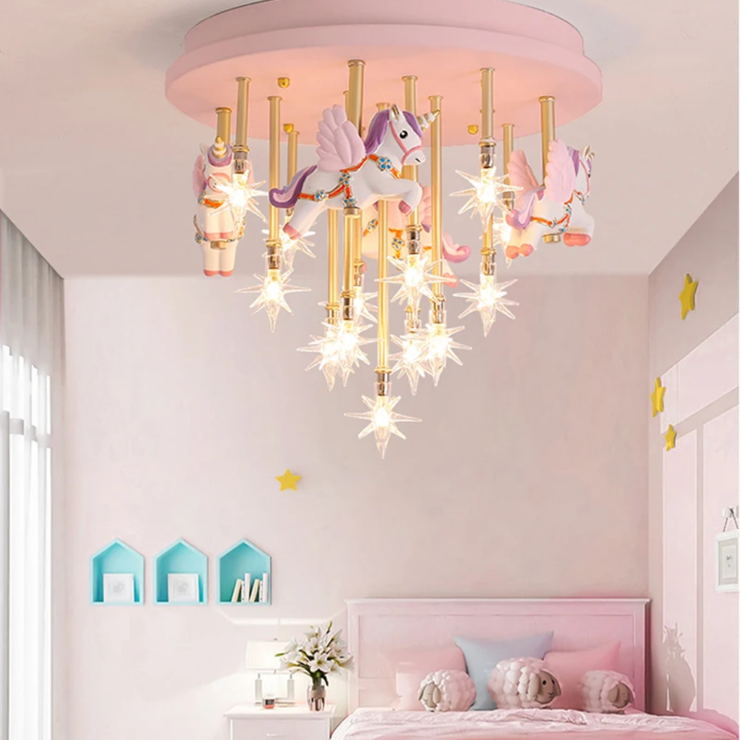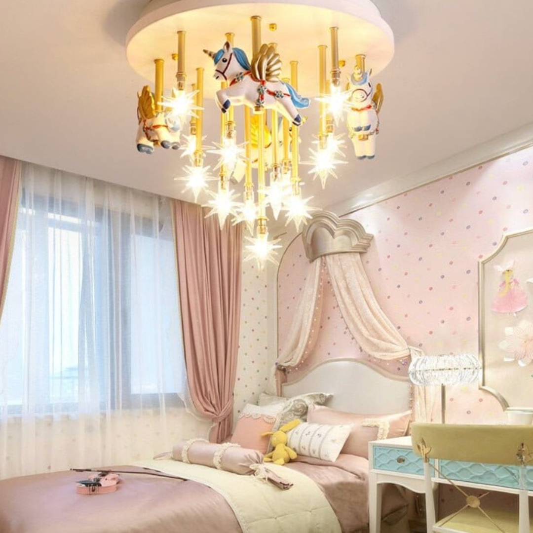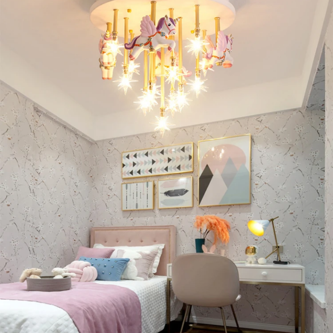 Bring fun and imagination to your child’s room with the whimsical merry-go-round horse ceiling light, combining charming design with bright lighting.
