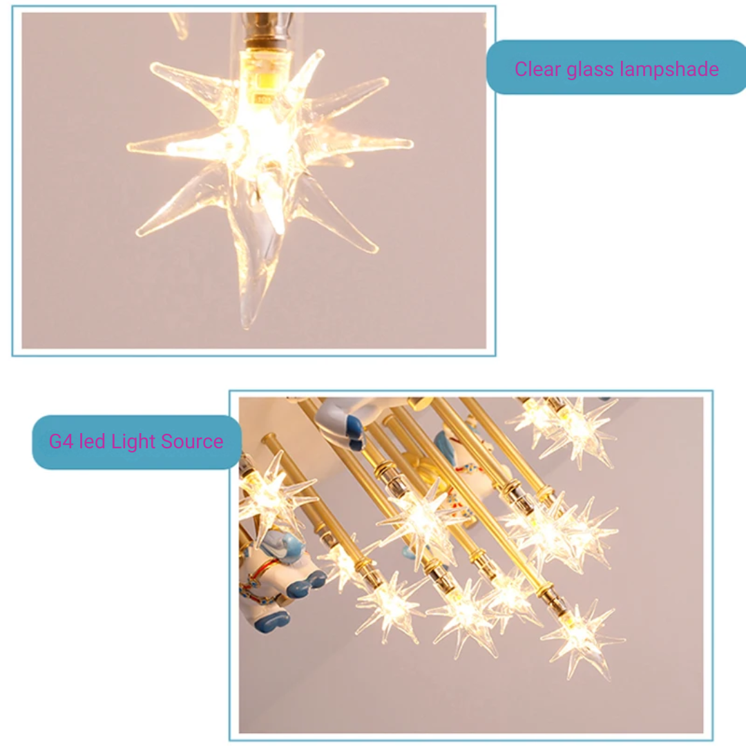 Bring a magical touch to your child’s room with the Starlight Carousel Ceiling Light, a delightful blend of whimsical charm, art deco elegance, and fairy tale wonder. Featuring a merry-go-round design with charming horse figures and twinkling star-shaped lights, it creates a captivating focal point your little one will adore. Crafted from high-quality resin with a paint-baked iron body, it offers durability, rust resistance, and lasting beauty.