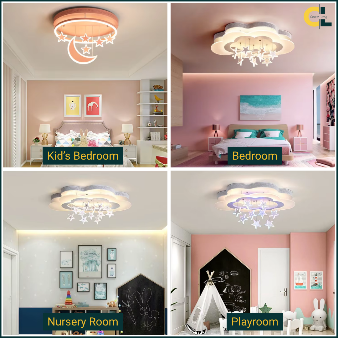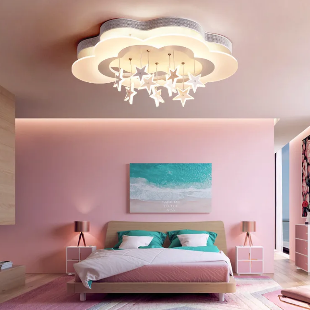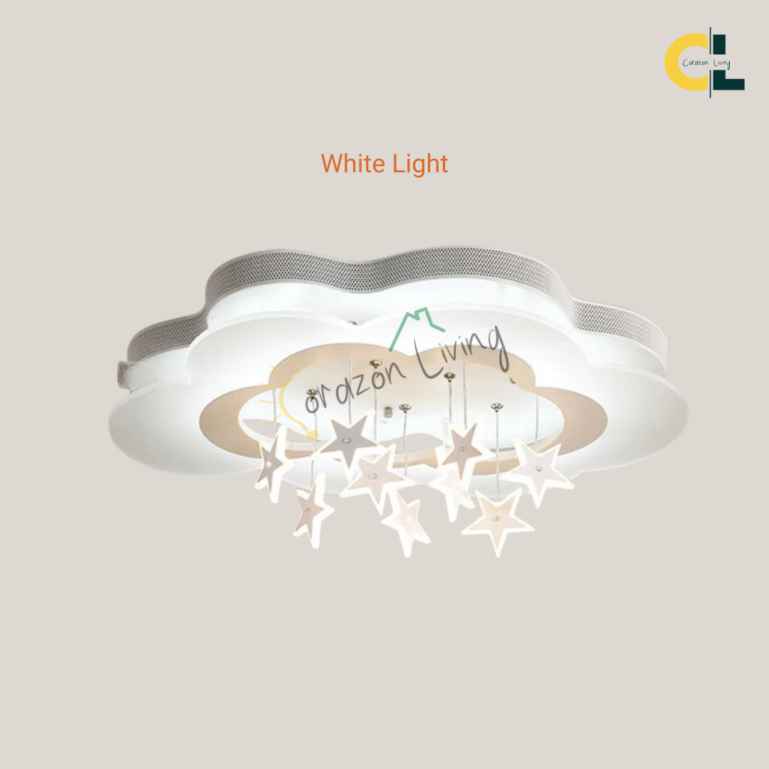 LED ceiling light features a whimsical white cloud design with hanging stars, creating a dreamy and enchanting ambiance for any room.