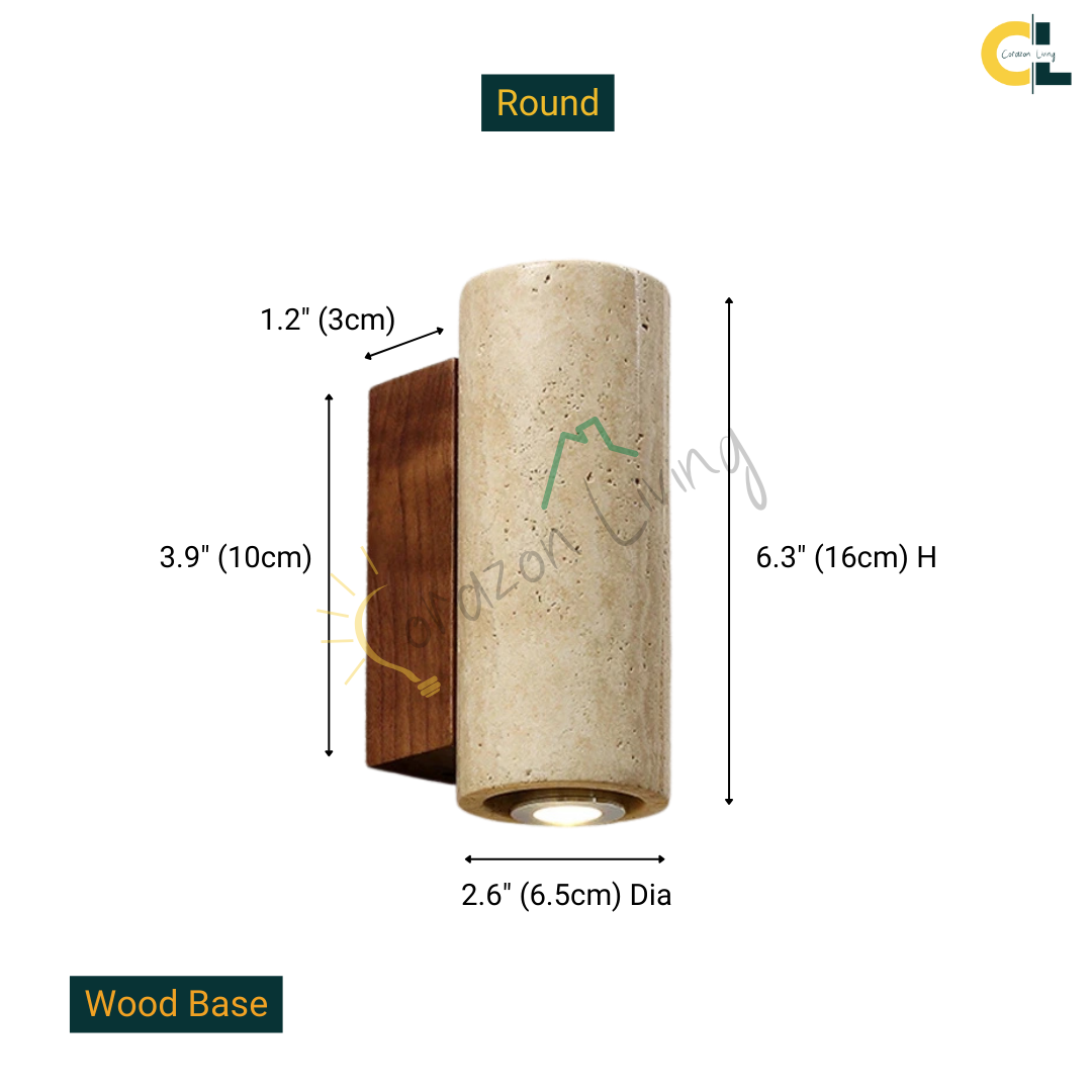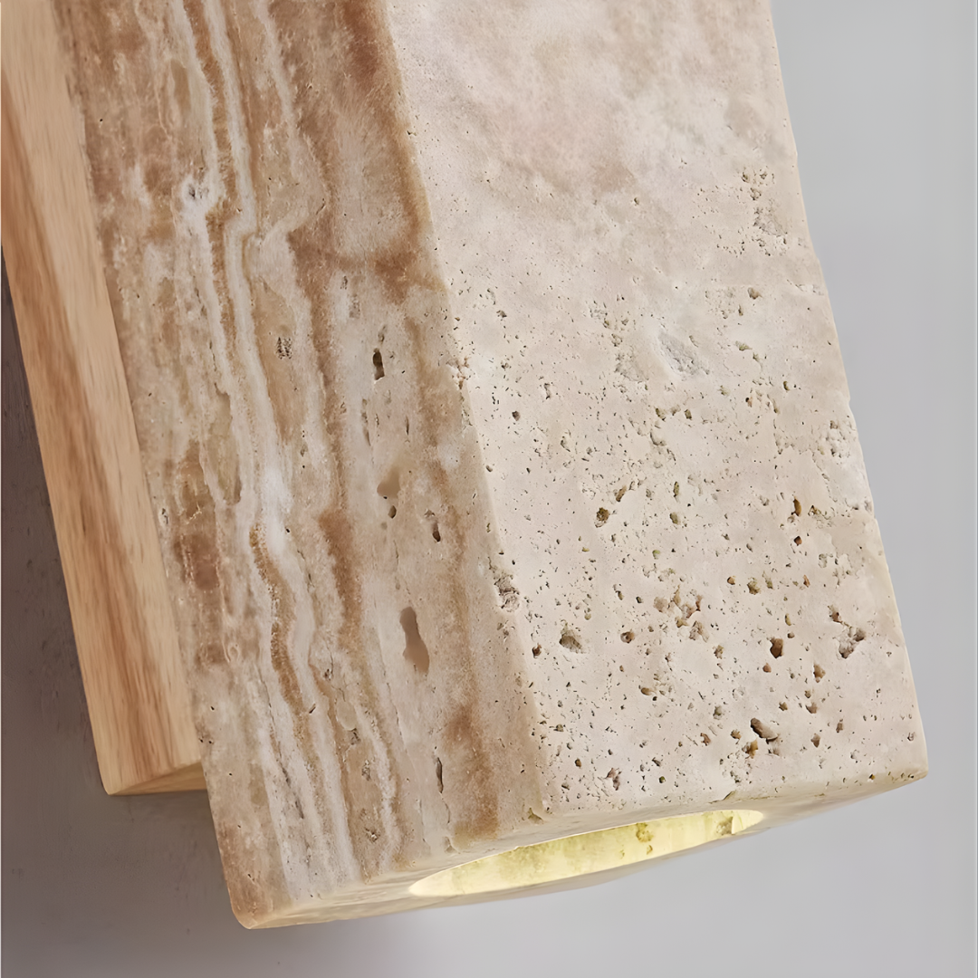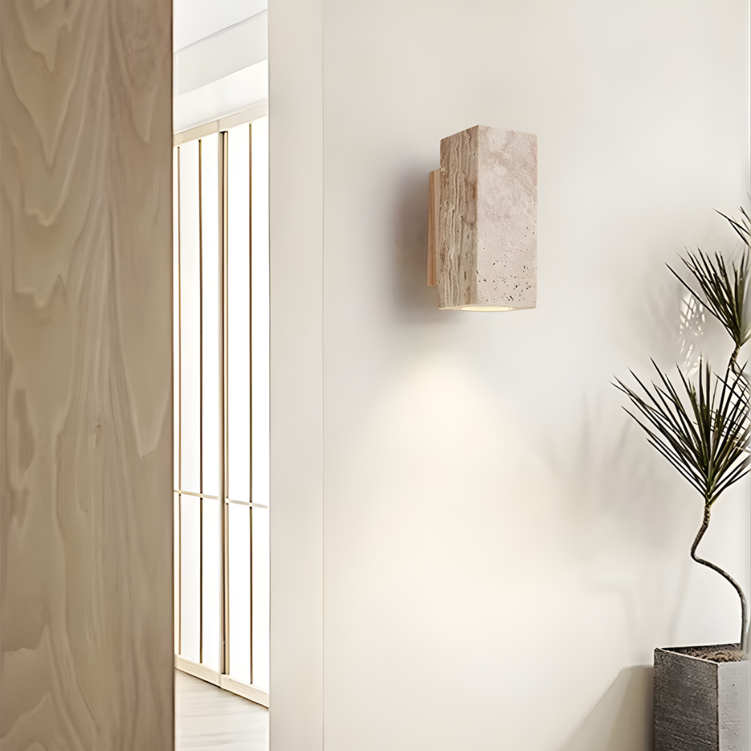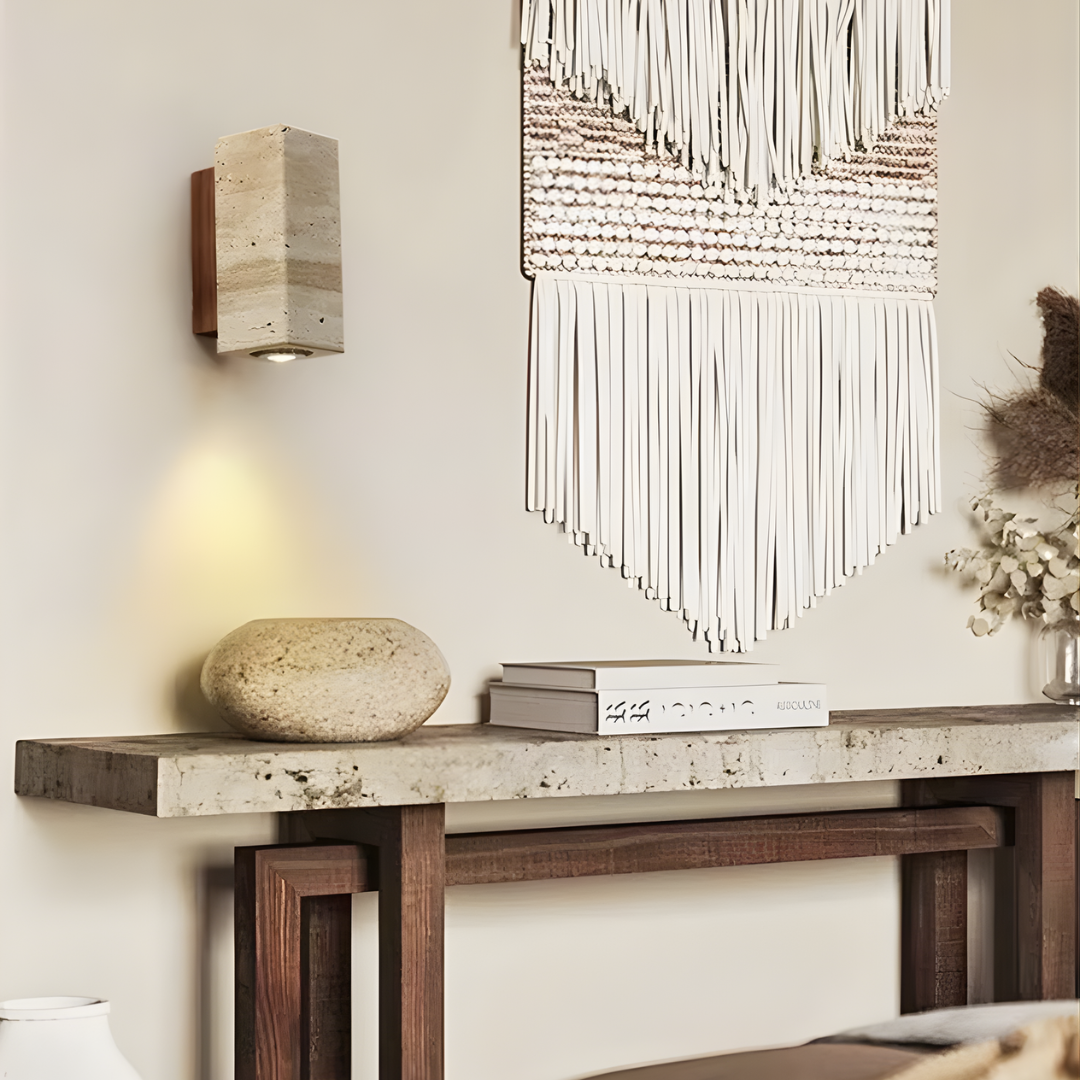 A Japandi-inspired wall lamp combining natural wood, metal, and stone with warm, customizable lighting for a cozy, elegant atmosphere.