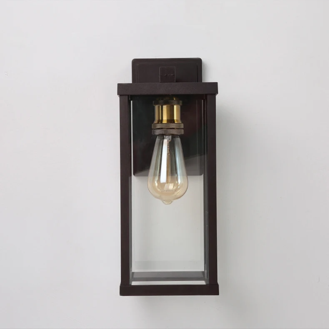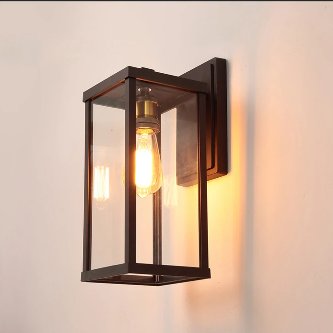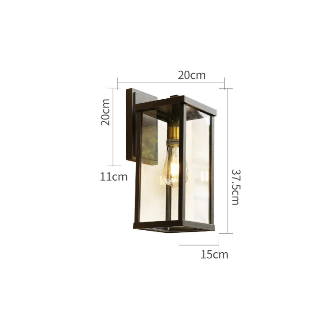 Enhance your outdoor lighting with Torchin wall sconce. Featuring a square frame and a clear glass shade, this fixture delivers both style and durability. Designed with dusk-to-dawn functionality, it automatically turns on at night and off at sunrise- perfect for porches, patios, entryways, and more.