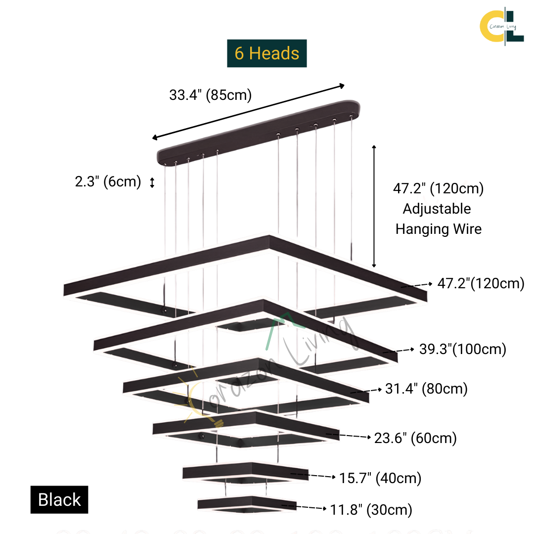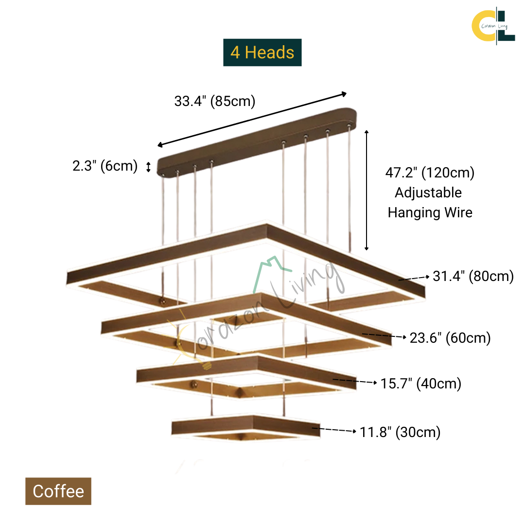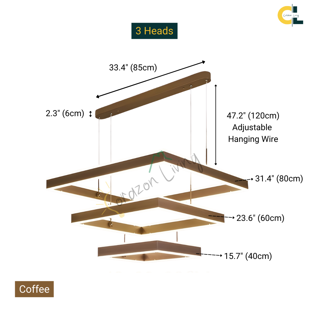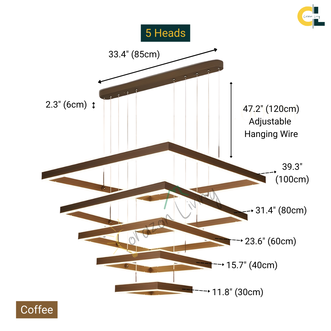 The Valerian Chandelier enhances any modern interior with its bold geometric silhouette and cascading square design. Crafted from durable aluminum and acrylic, this statement piece is available in Black, Coffee, or Gold, making it a perfect fit for modern living rooms, dining areas, and high-ceiling spaces. Its integrated LED system offers Warm White, Cool White, or Tri-Color Changeable (Remote Dimming with App), allowing you to adjust both color and brightness effortlessly. Available in 1, 2, 3, 4, 5, or 6-head configurations, the Valerian adapts beautifully to compact or expansive layouts.