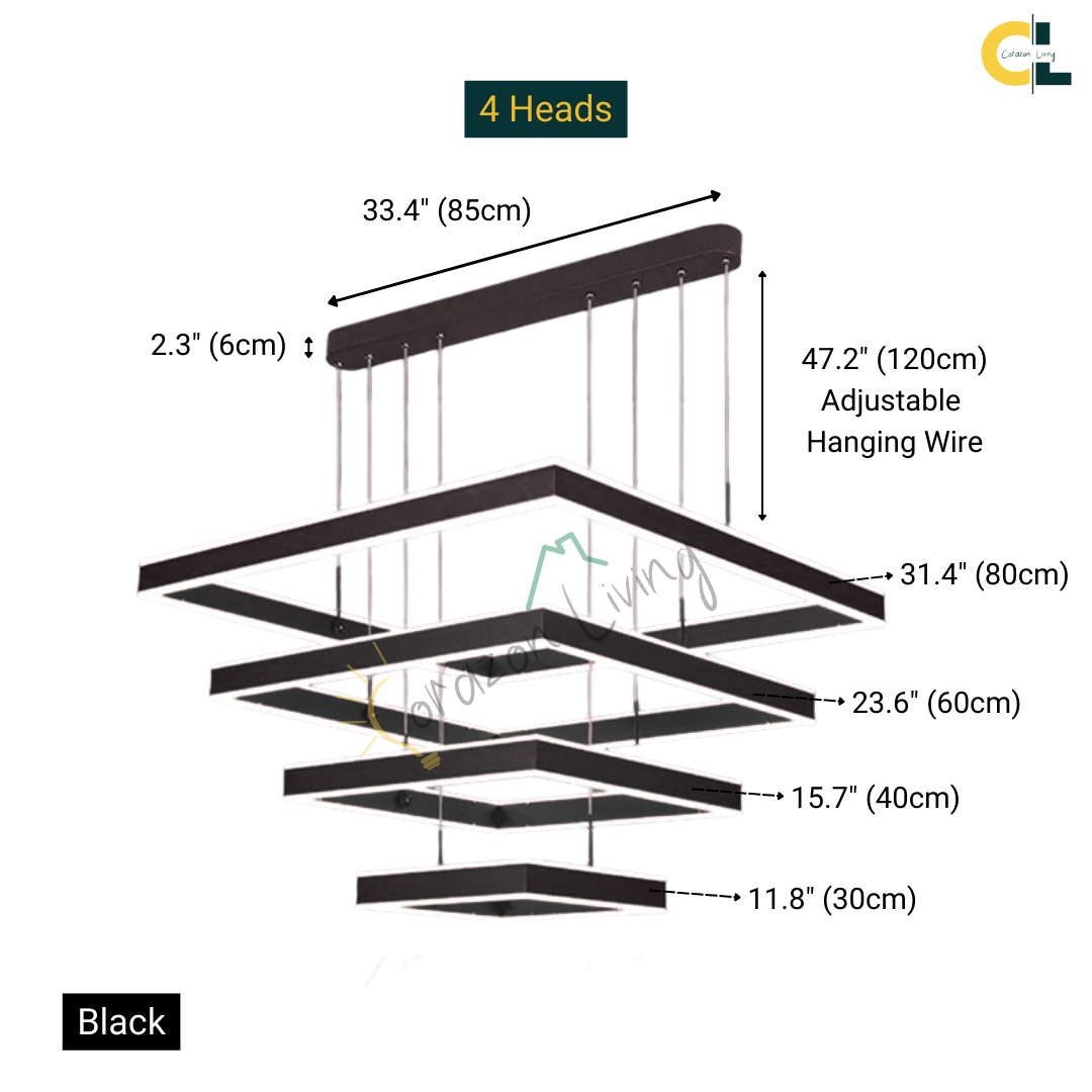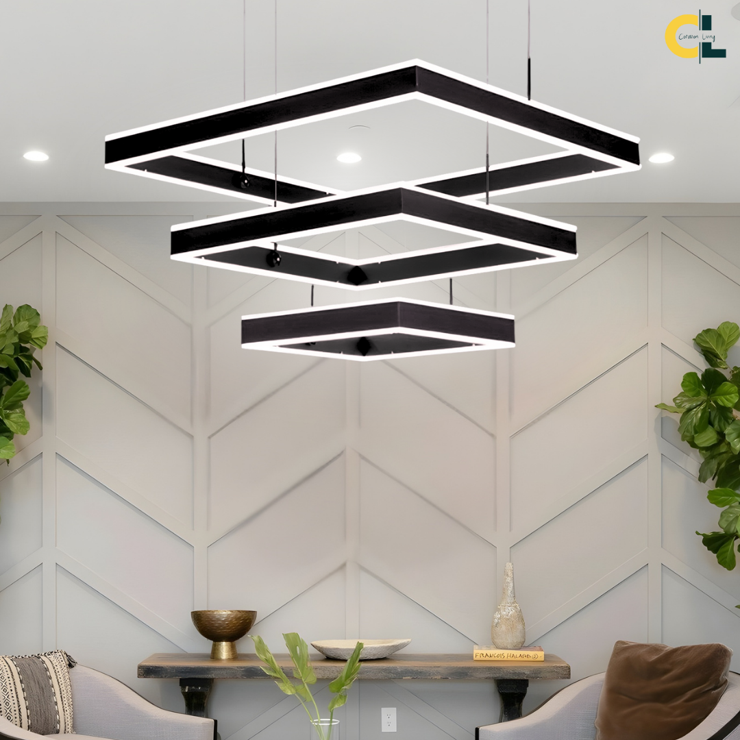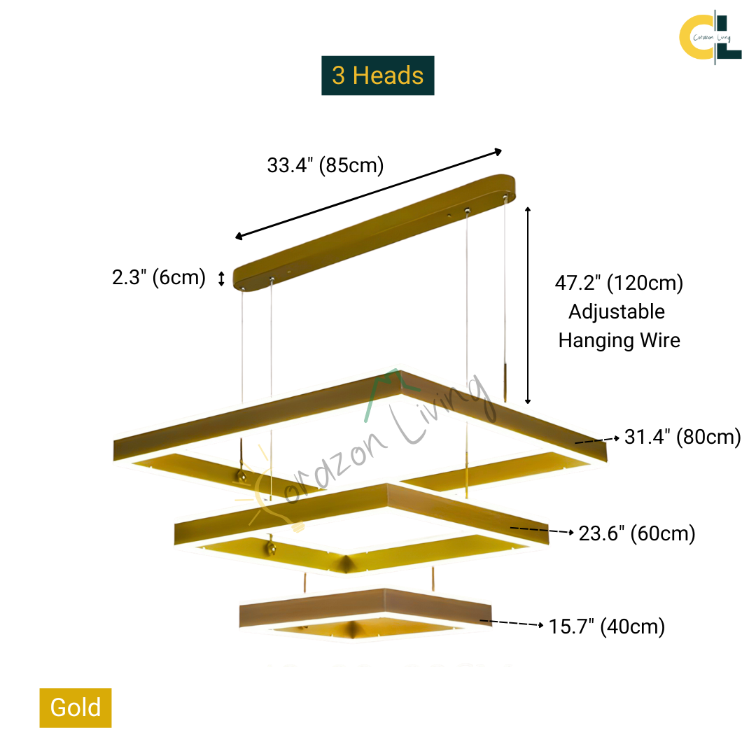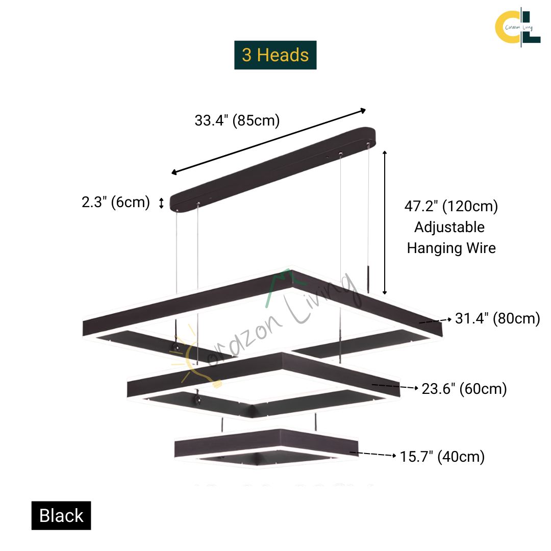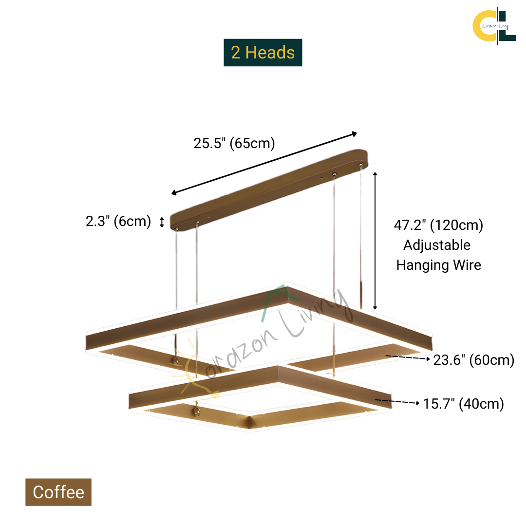 The Valerian Chandelier enhances any modern interior with its bold geometric silhouette and cascading square design. Crafted from durable aluminum and acrylic, this statement piece is available in Black, Coffee, or Gold, making it a perfect fit for modern living rooms, dining areas, and high-ceiling spaces. Its integrated LED system offers Warm White, Cool White, or Tri-Color Changeable (Remote Dimming with App), allowing you to adjust both color and brightness effortlessly. Available in 1, 2, 3, 4, 5, or 6-head configurations, the Valerian adapts beautifully to compact or expansive layouts.