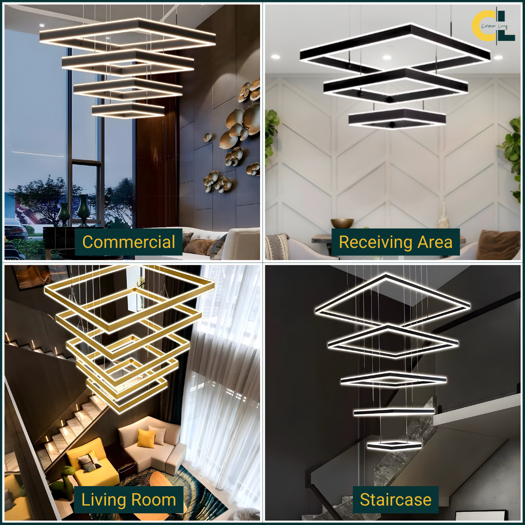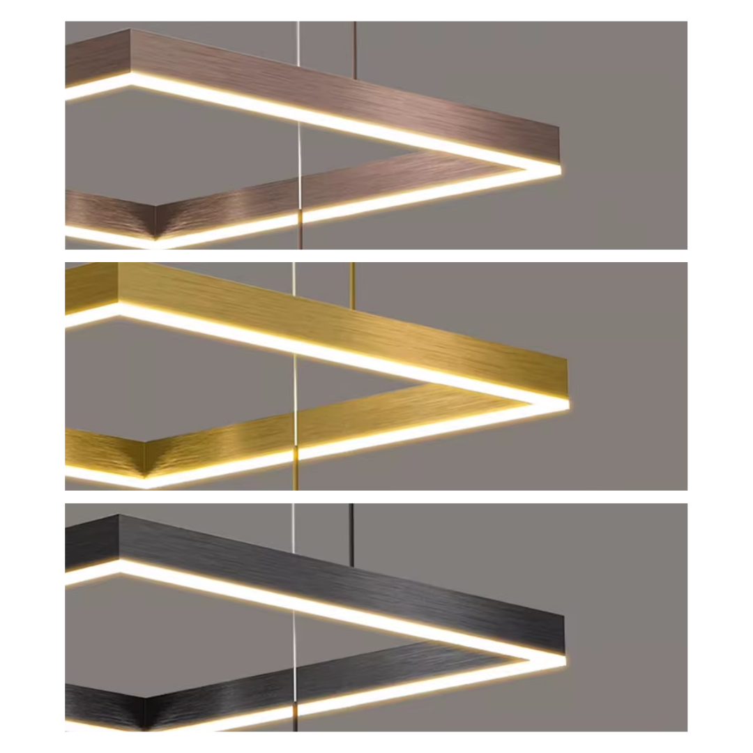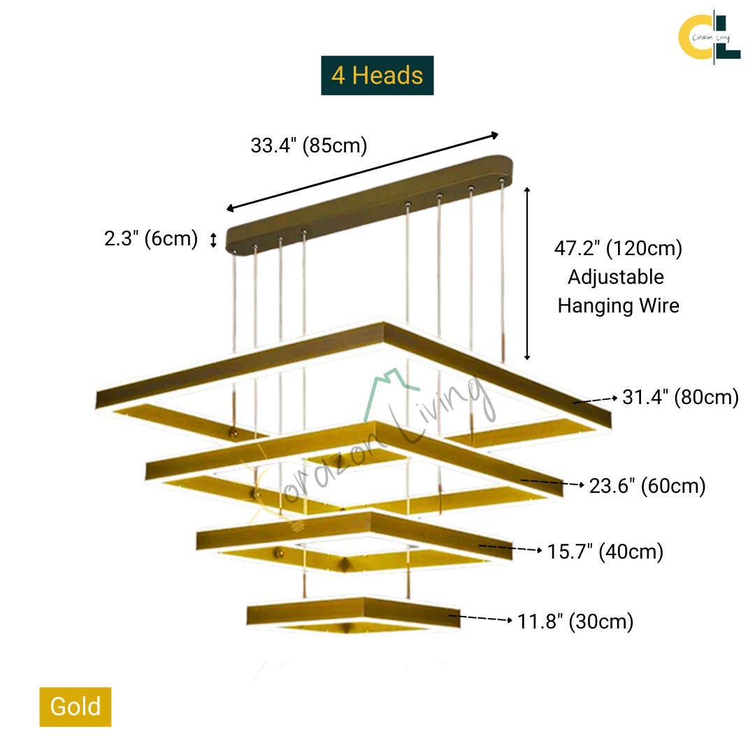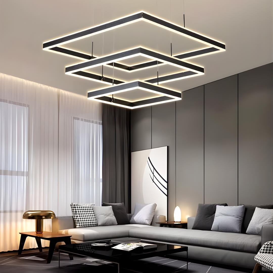 The Valerian Chandelier enhances any modern interior with its bold geometric silhouette and cascading square design. Crafted from durable aluminum and acrylic, this statement piece is available in Black, Coffee, or Gold, making it a perfect fit for modern living rooms, dining areas, and high-ceiling spaces. Its integrated LED system offers Warm White, Cool White, or Tri-Color Changeable (Remote Dimming with App), allowing you to adjust both color and brightness effortlessly. Available in 1, 2, 3, 4, 5, or 6-head configurations, the Valerian adapts beautifully to compact or expansive layouts.
