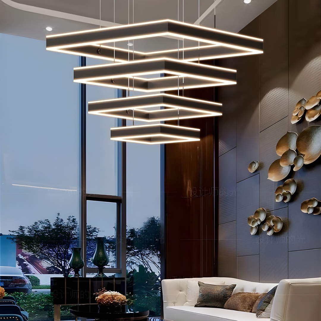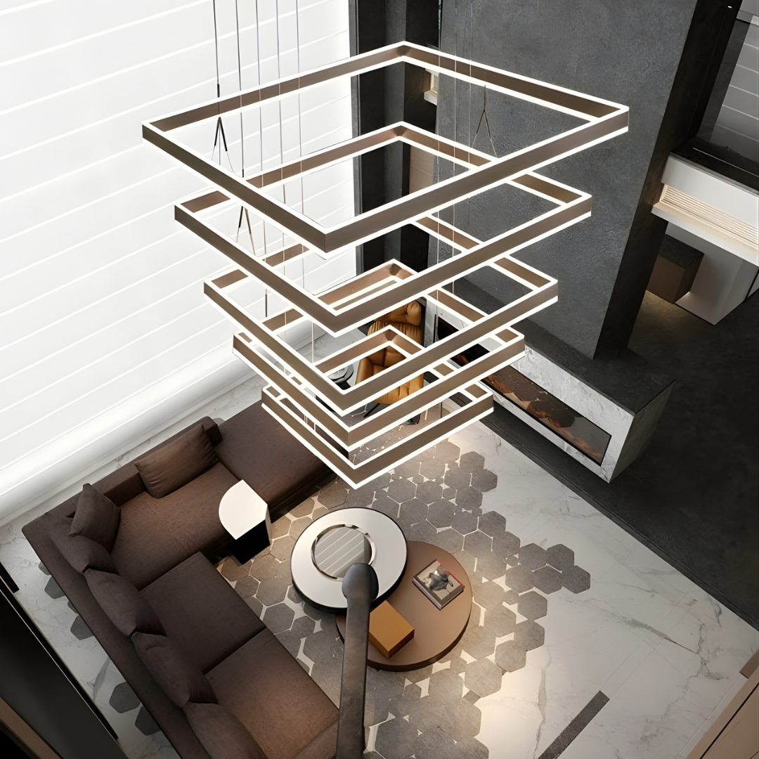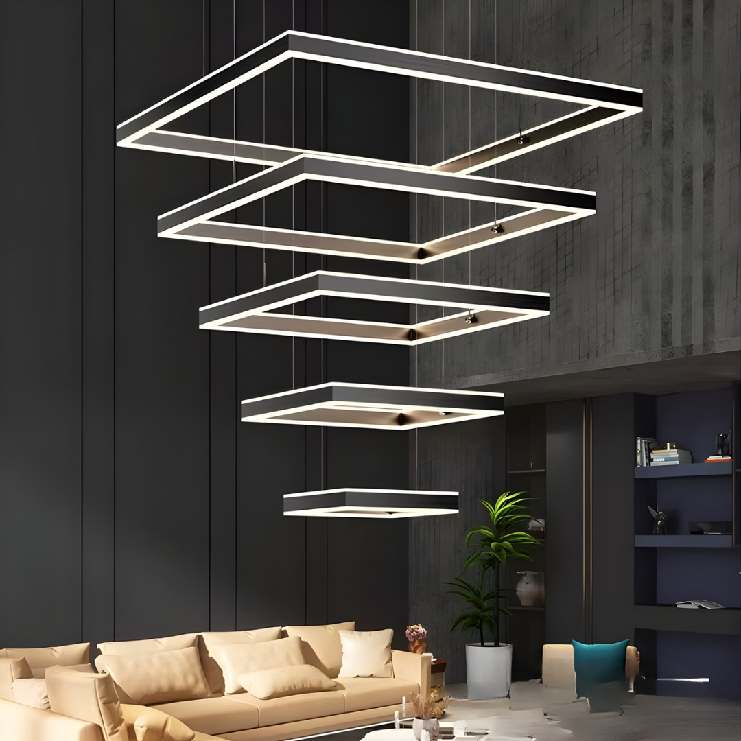 A bold geometric chandelier with cascading square forms, offering customizable LED lighting and versatile configurations for striking modern elegance.