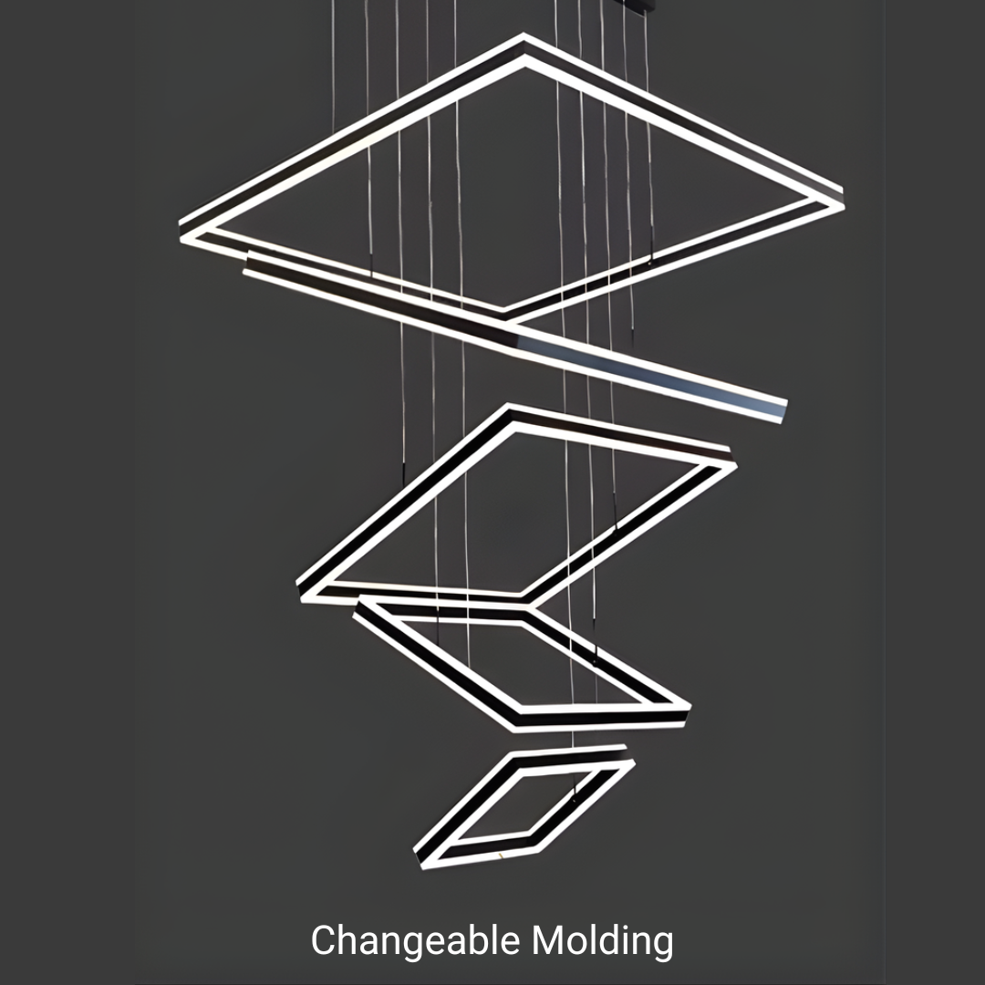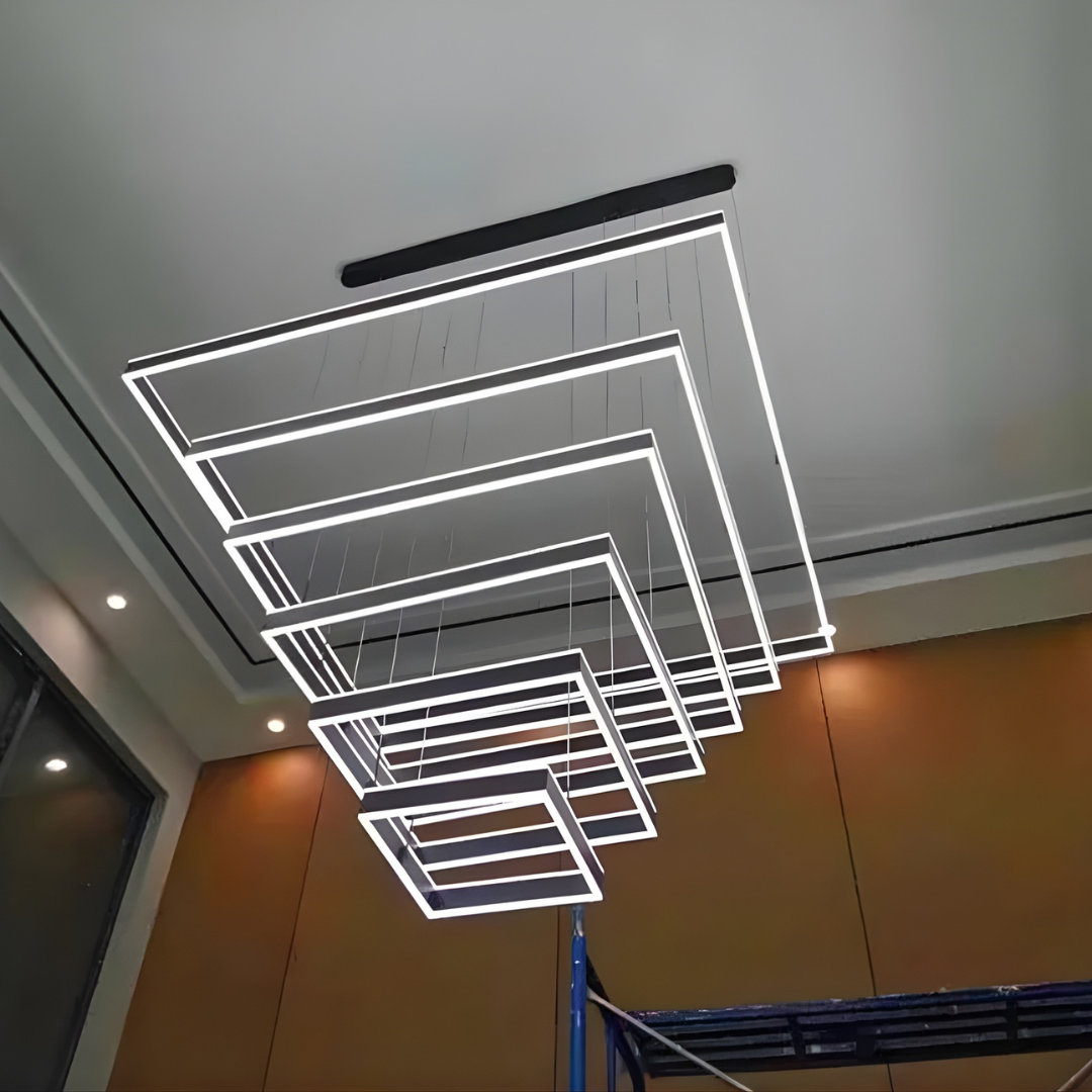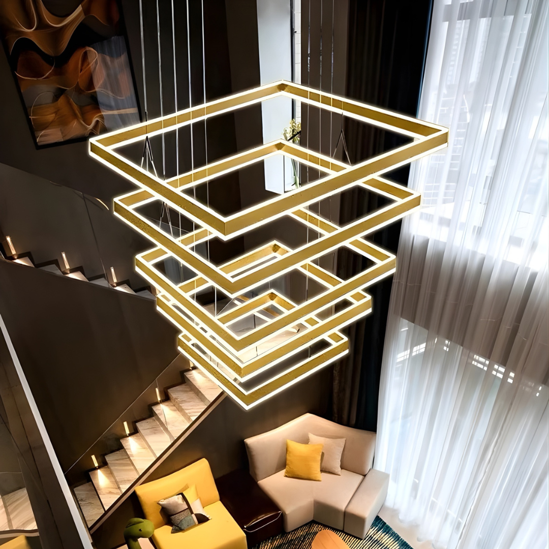 A bold geometric chandelier with cascading square forms, offering customizable LED lighting and versatile configurations for striking modern elegance.
