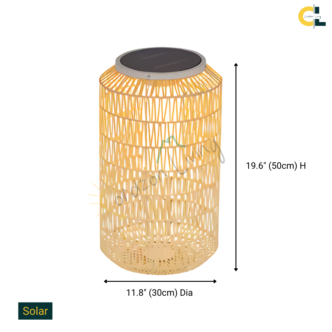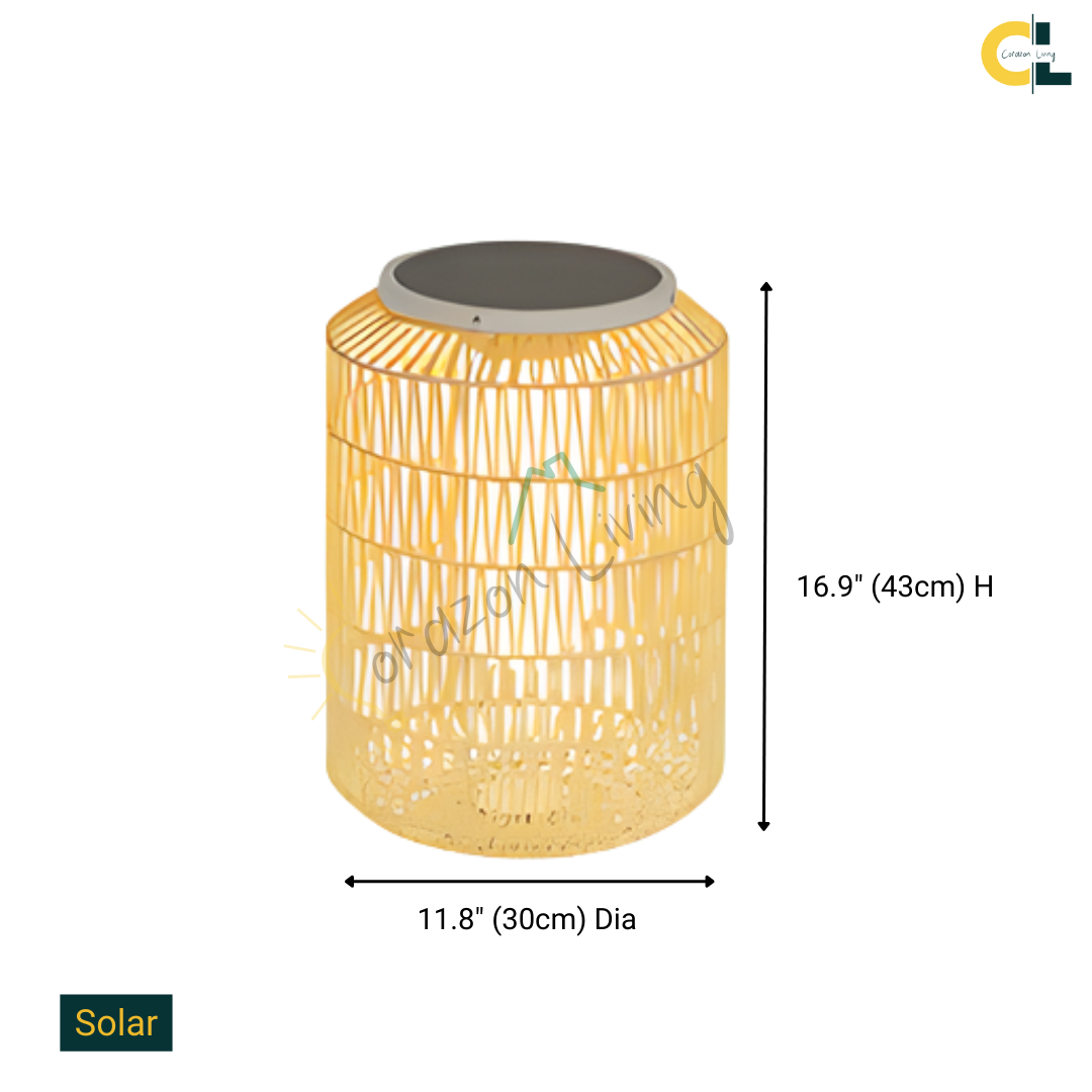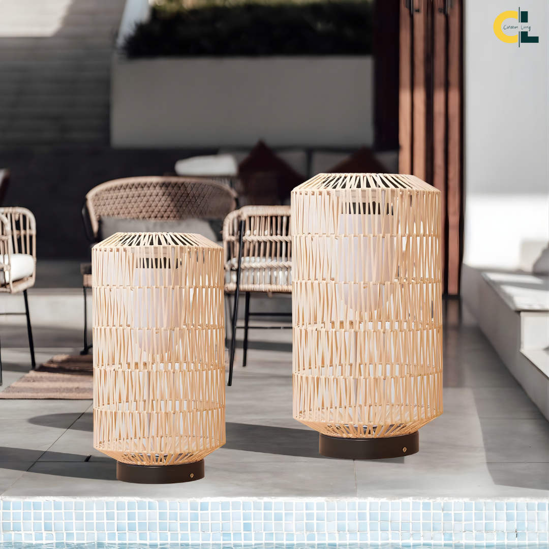 Bring natural warmth and handcrafted charm to your outdoor spaces with Wicklow, a beautifully woven rattan floor lamp designed for elegant exterior living. Each lamp is hand-knitted from durable outdoor rattan, giving it a rustic yet refined character. Available in two model options—Solar or Electrical—Wicklow provides flexible lighting to suit any outdoor setting. With its IP54 waterproof rating, it withstands the elements while creating a soft, ambient glow for patios, gardens, terraces, and poolside areas.