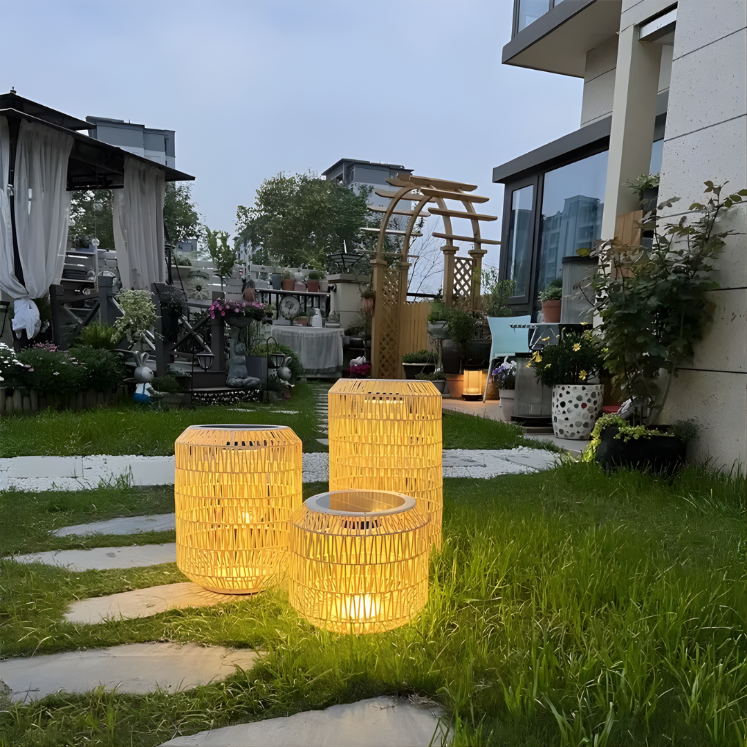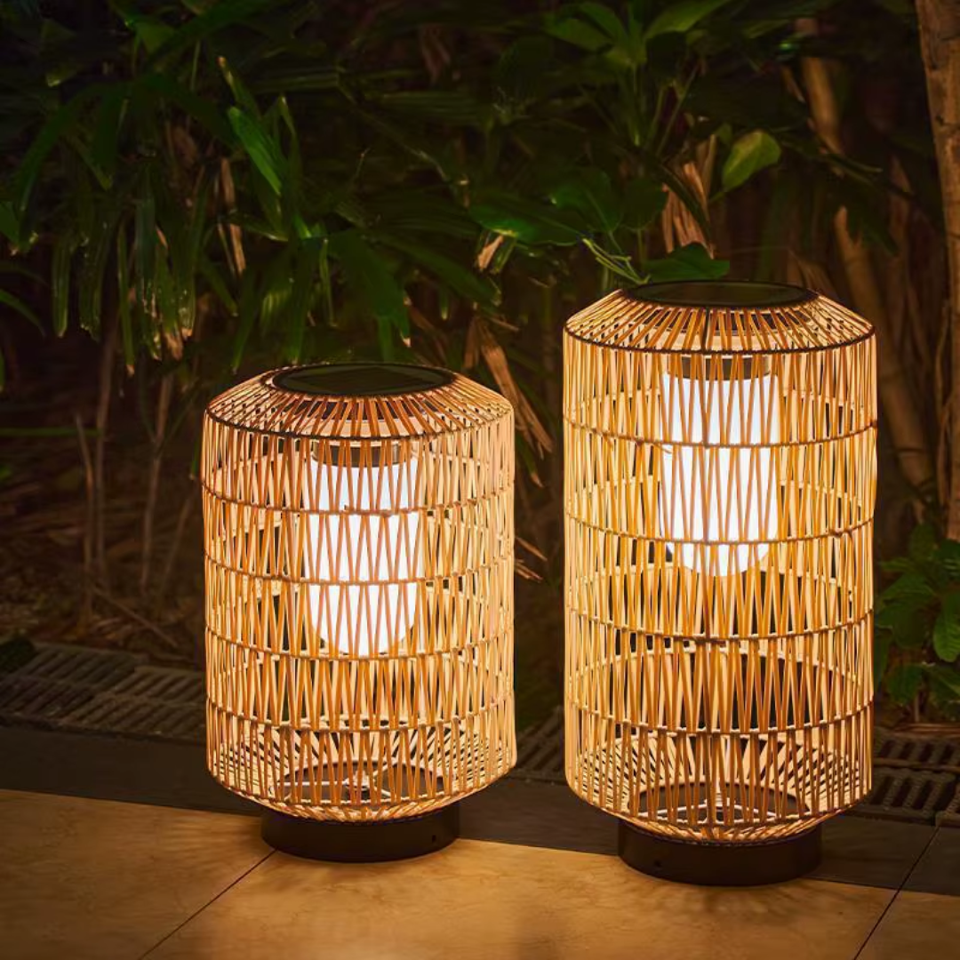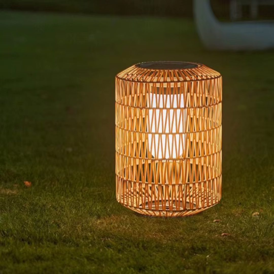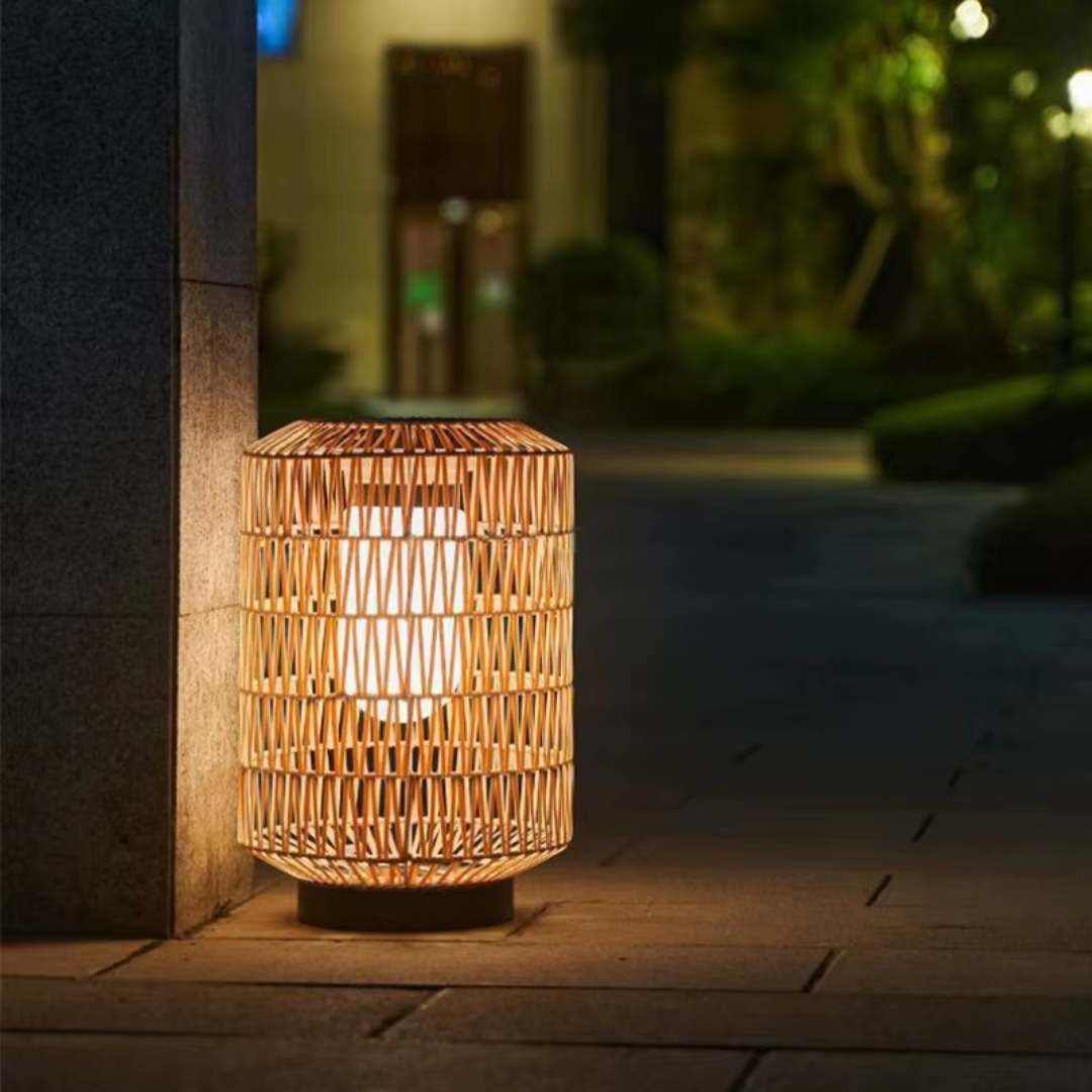 A handcrafted rattan floor lamp offering warm ambient illumination, weather-resistant durability, and flexible solar or electric lighting for relaxed outdoor living.