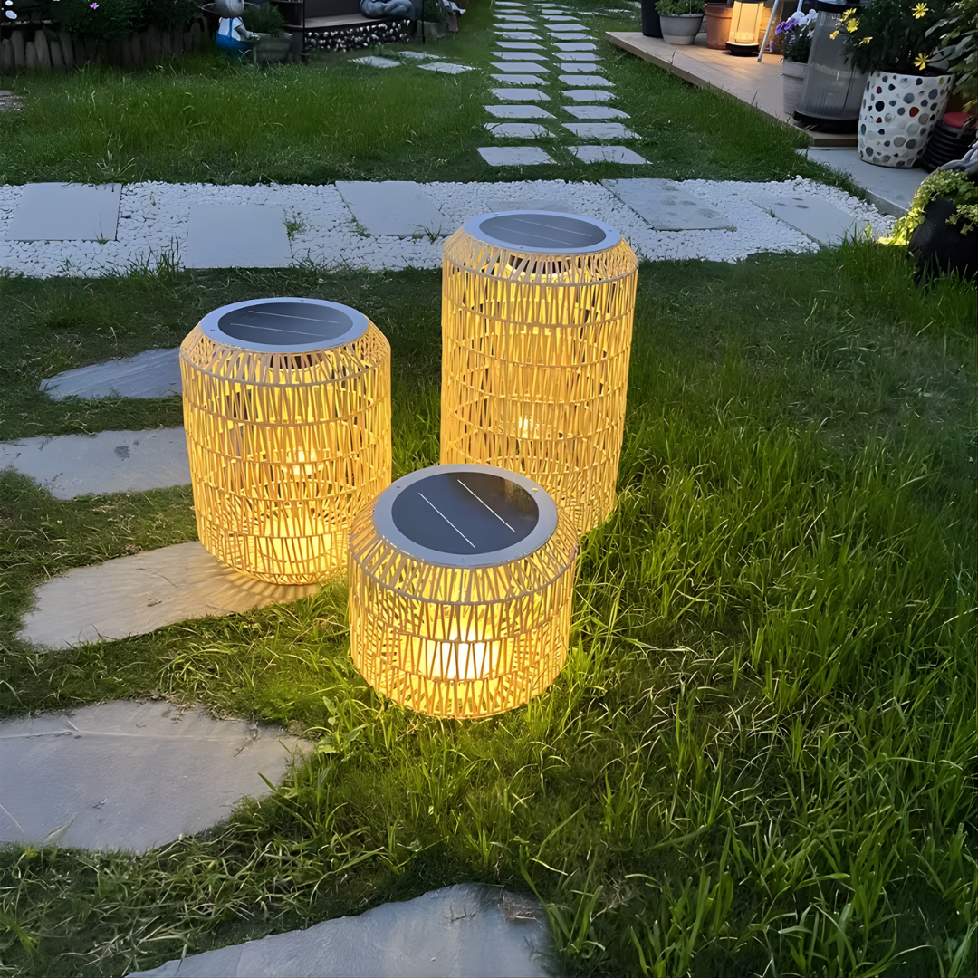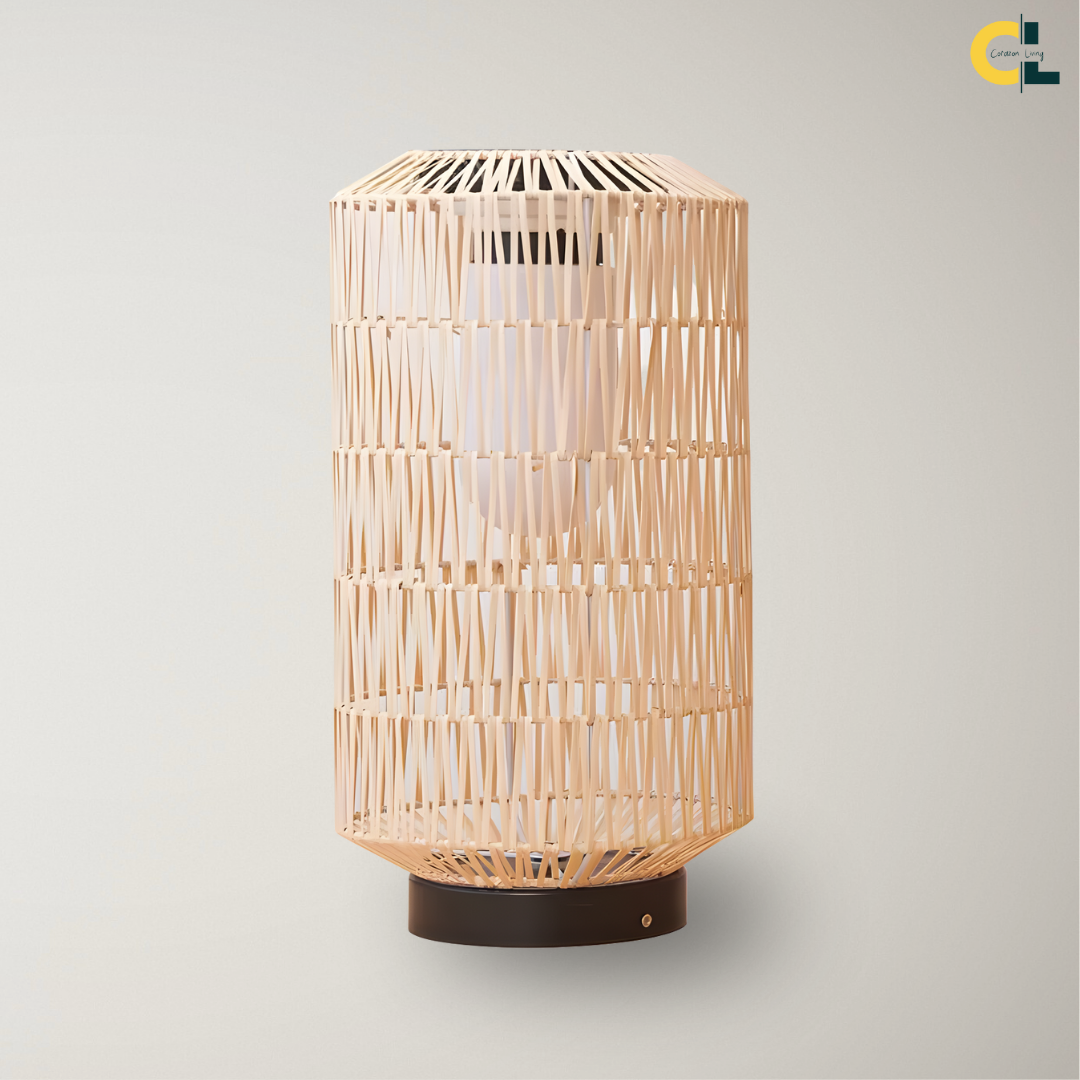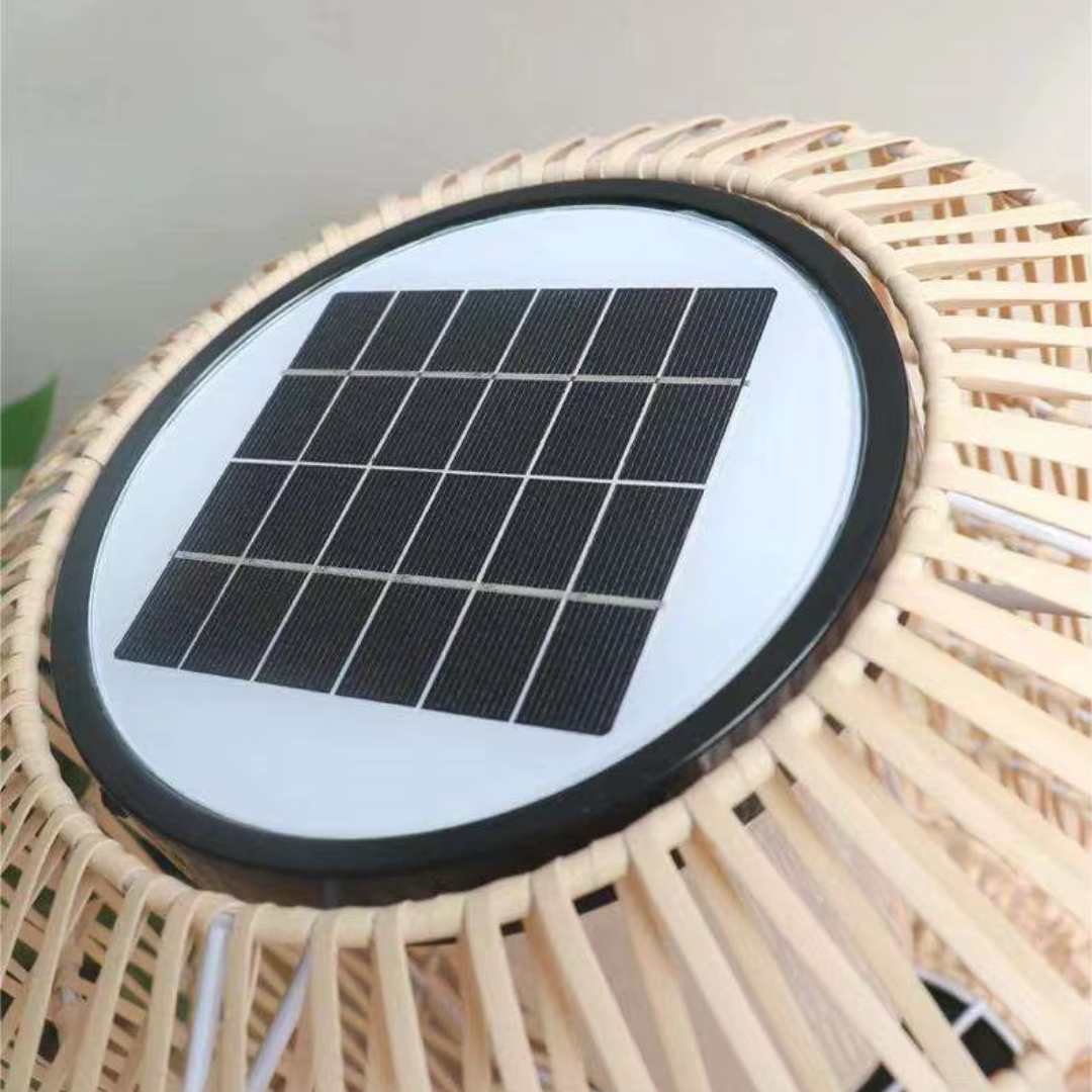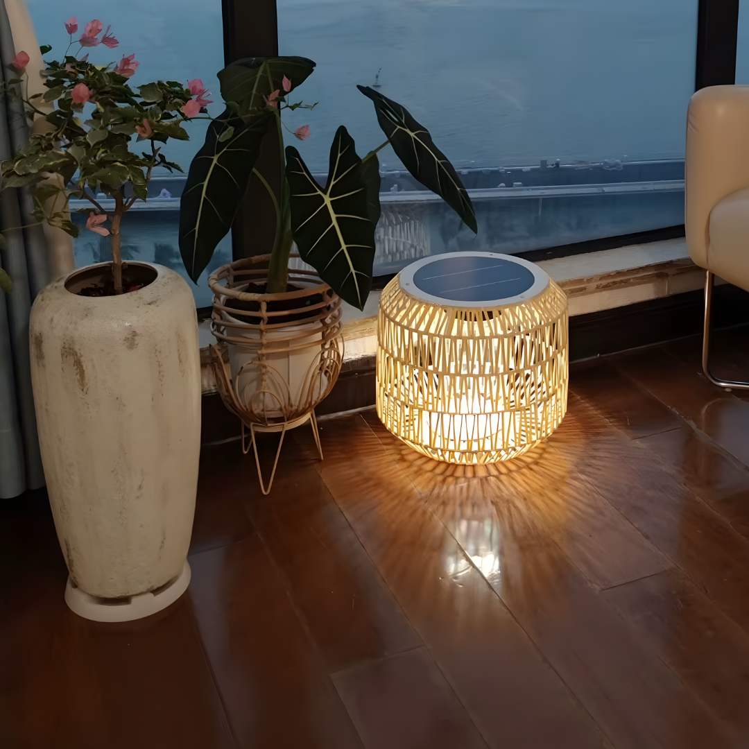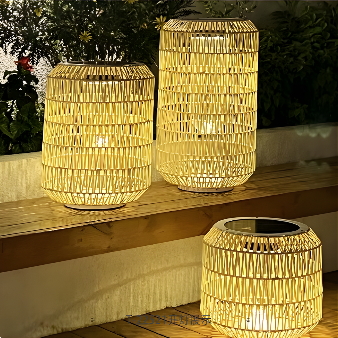 A handcrafted rattan floor lamp offering warm ambient illumination, weather-resistant durability, and flexible solar or electric lighting for relaxed outdoor living.
