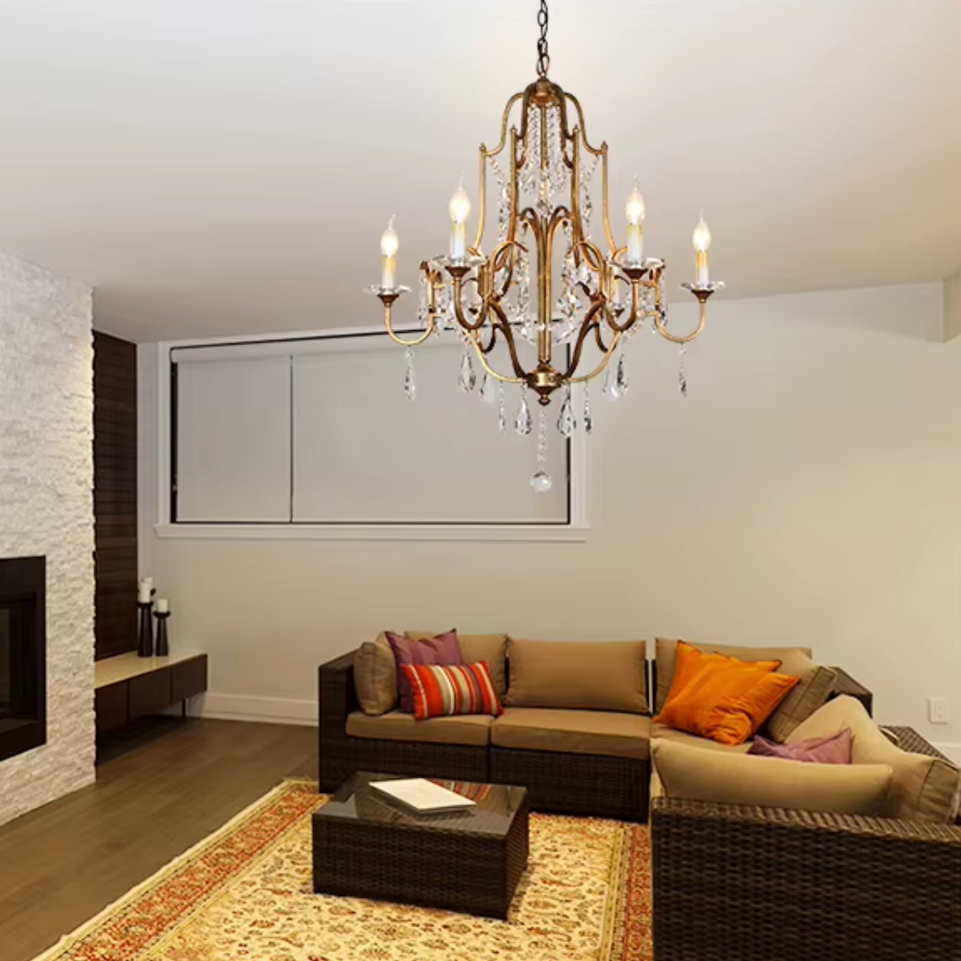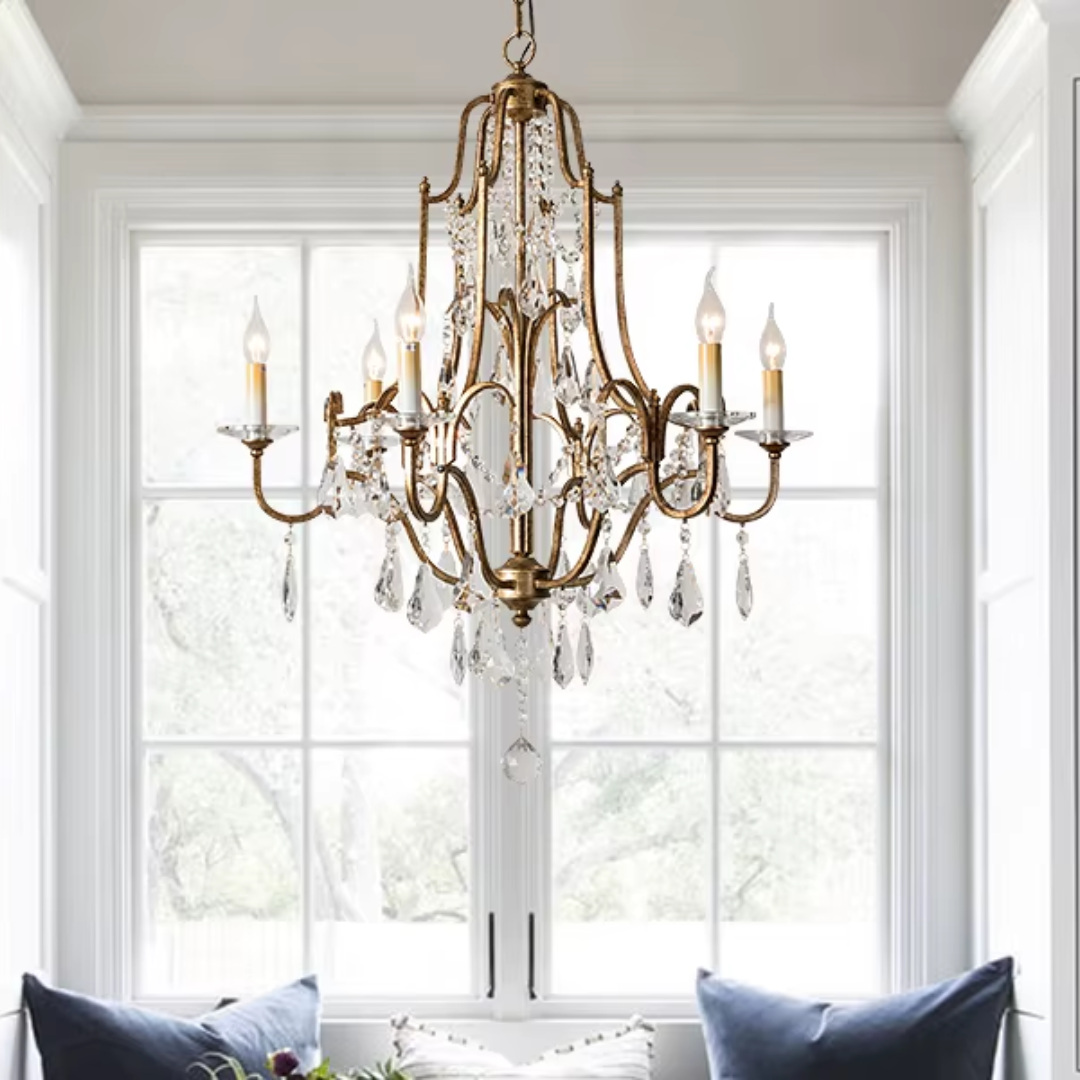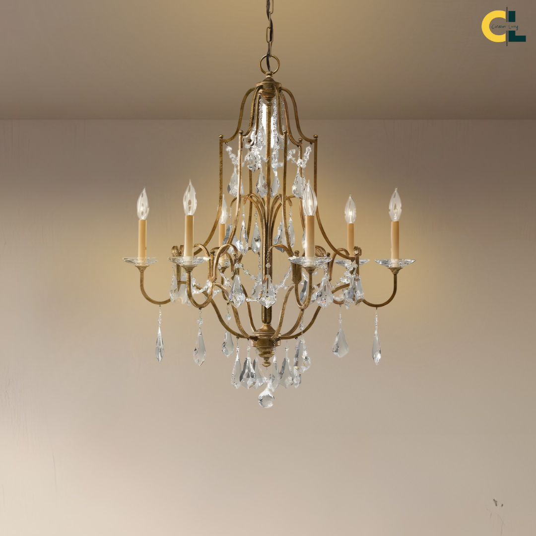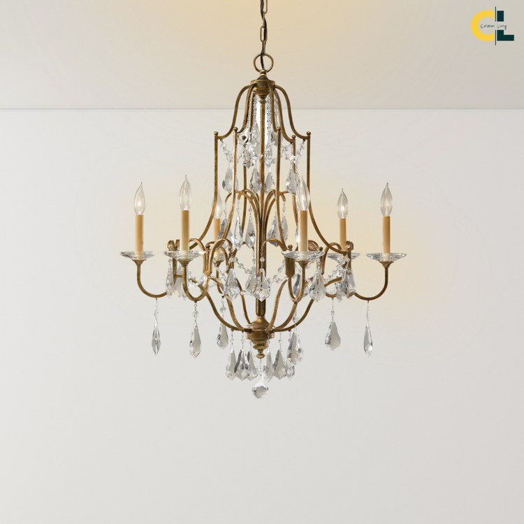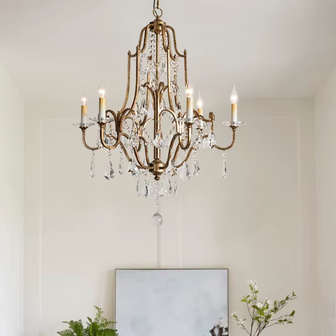 Bring a calm sense of vintage elegance into your space with the Zerine Crystal Chandelier. Inspired by classic French candle lighting, Zerine pairs a refined metal frame in a warm retro gold finish with shimmering crystal drops that catch and soften the light.