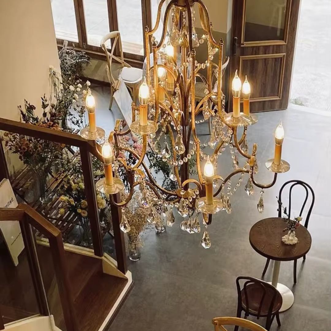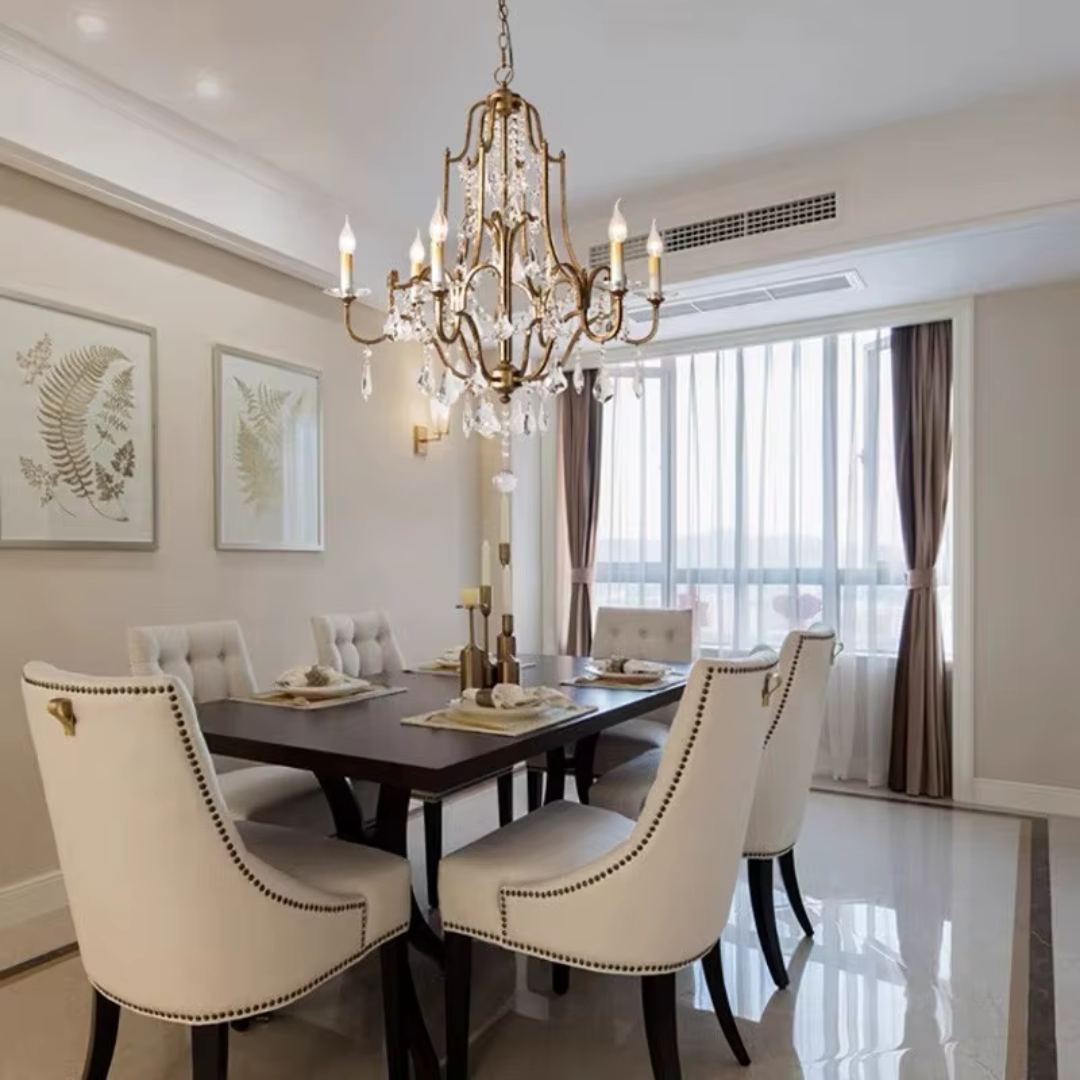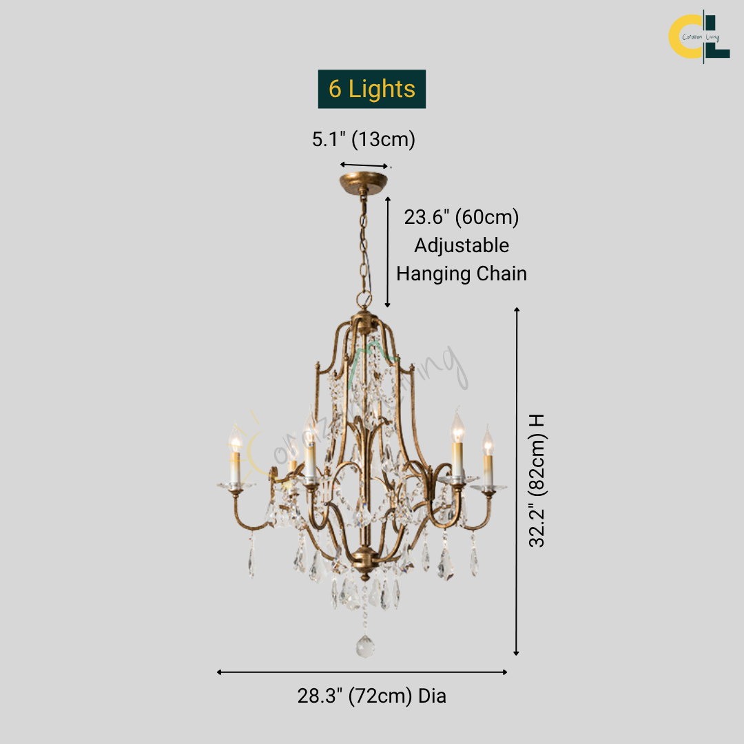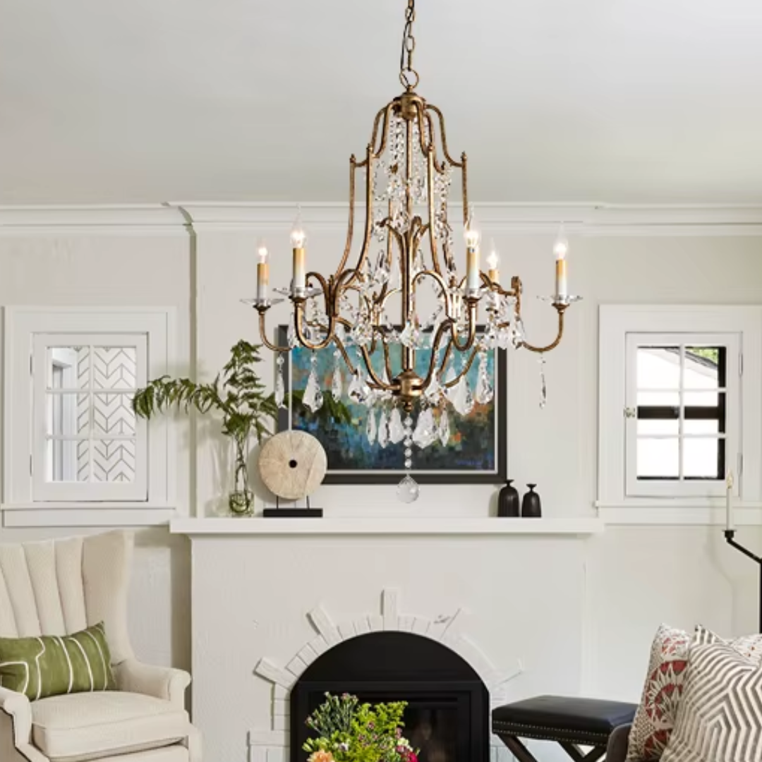 Bring a calm sense of vintage elegance into your space with the Zerine Crystal Chandelier. Inspired by classic French candle lighting, Zerine pairs a refined metal frame in a warm retro gold finish with shimmering crystal drops that catch and soften the light.