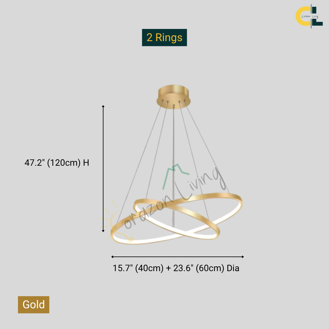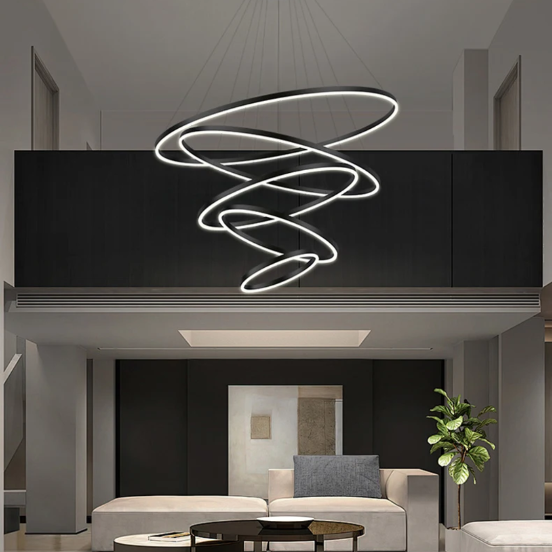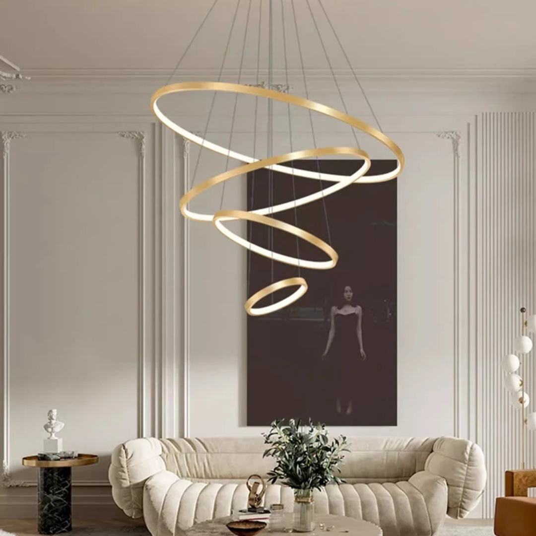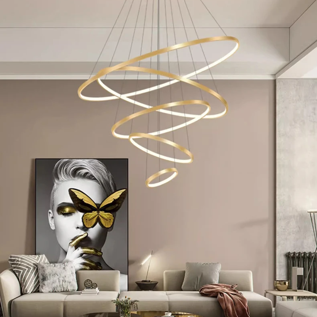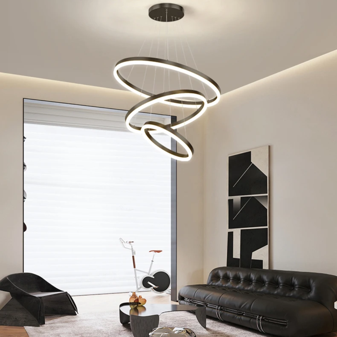Floating LED rings create a warm, modern ambiance with sculptural elegance for high ceilings and open living spaces.