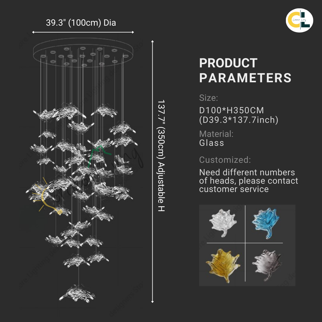 The Aurelia Maple Leaf Glass Chandelier is a breathtaking statement piece that blends artistry with illumination. Designed with delicately crafted glass maple leaves in golden and glass tones, this chandelier cascades elegantly, creating a dazzling display of light and shadow.