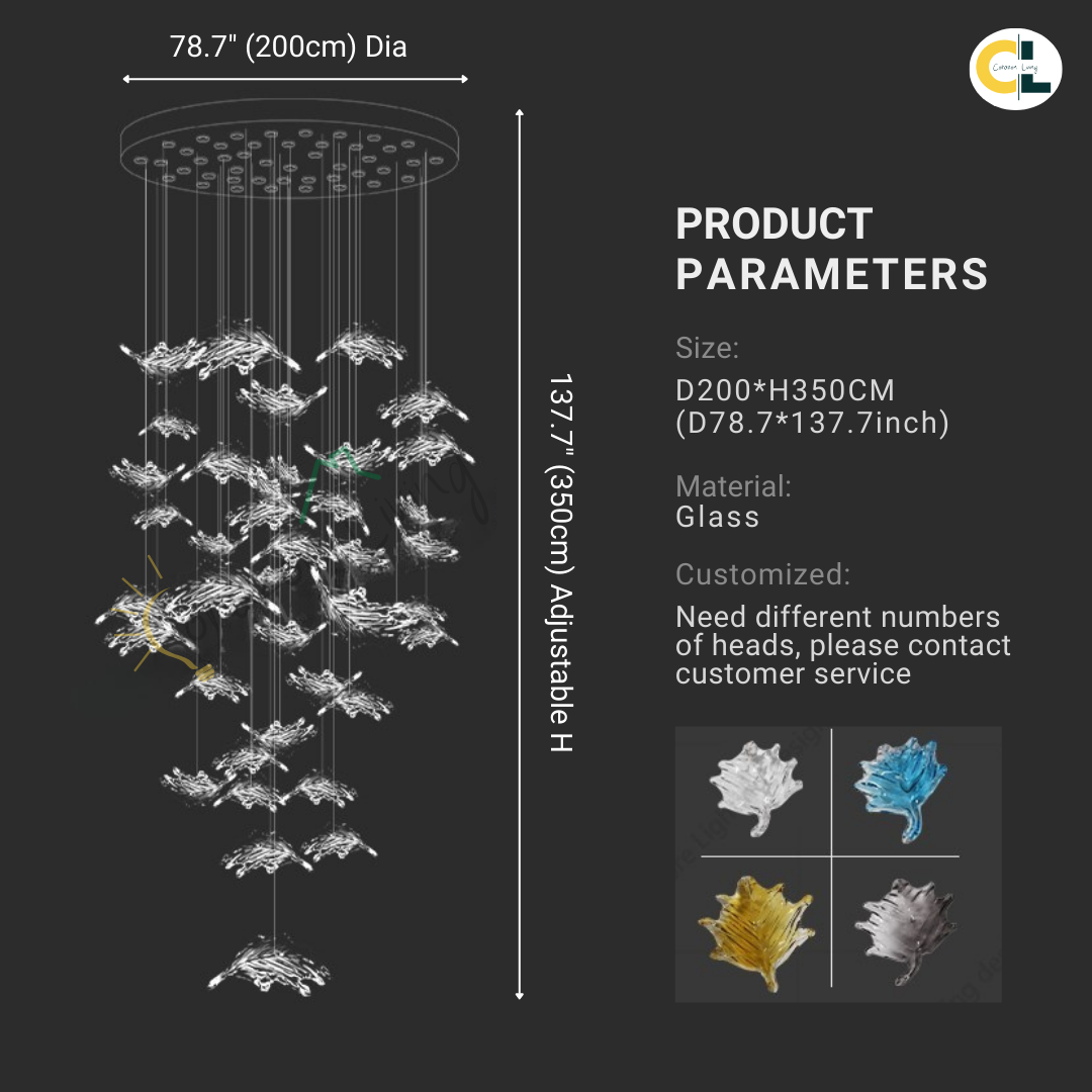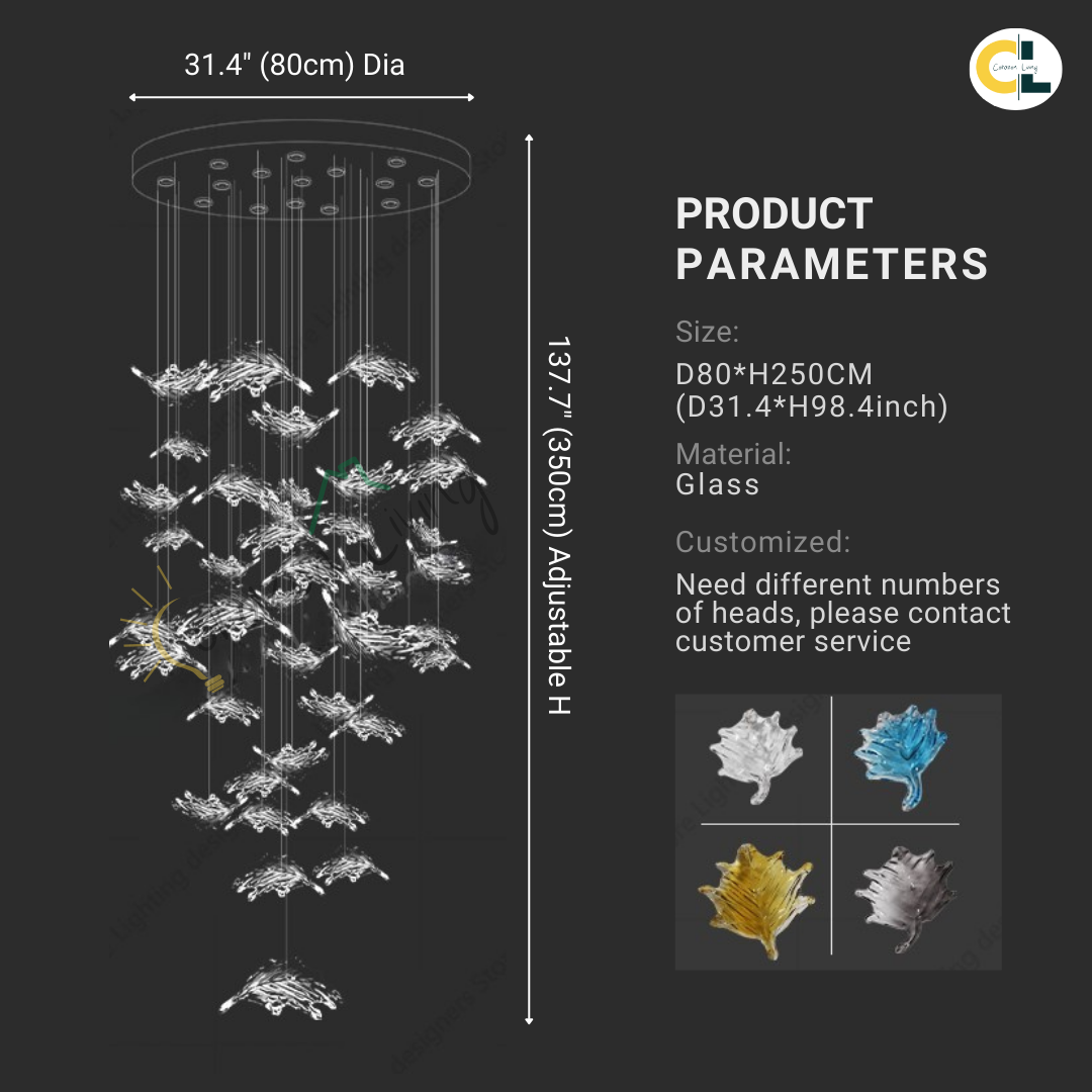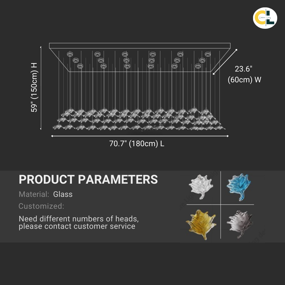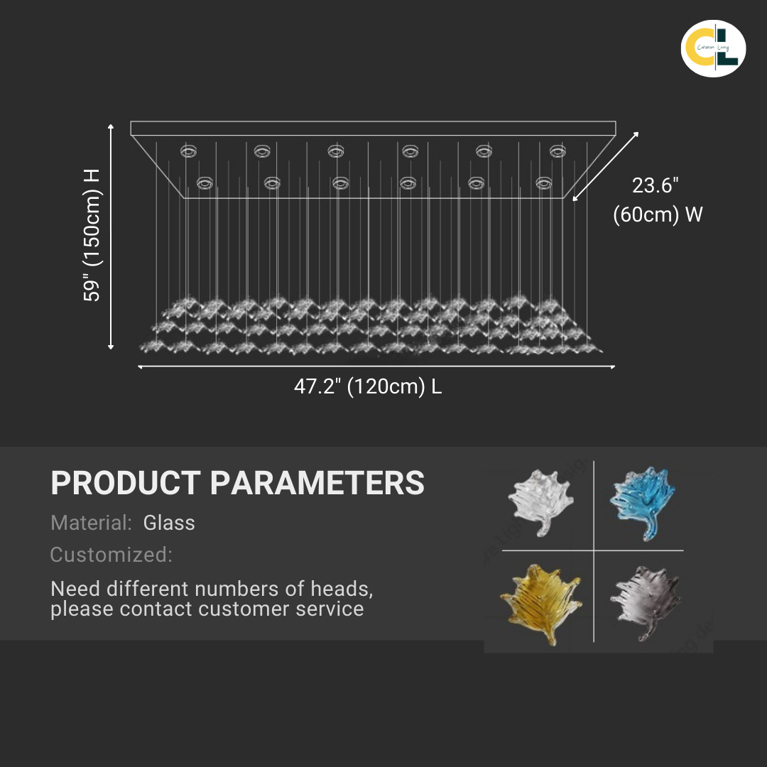 A stunning fusion of art and light, this chandelier features delicately crafted glass maple leaves that cascade gracefully, adding elegance and brilliance to any space.