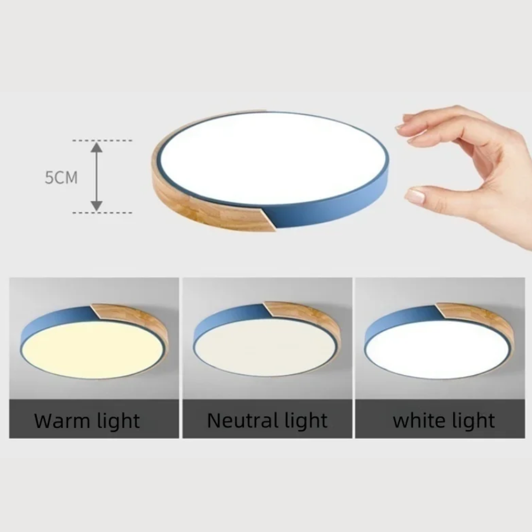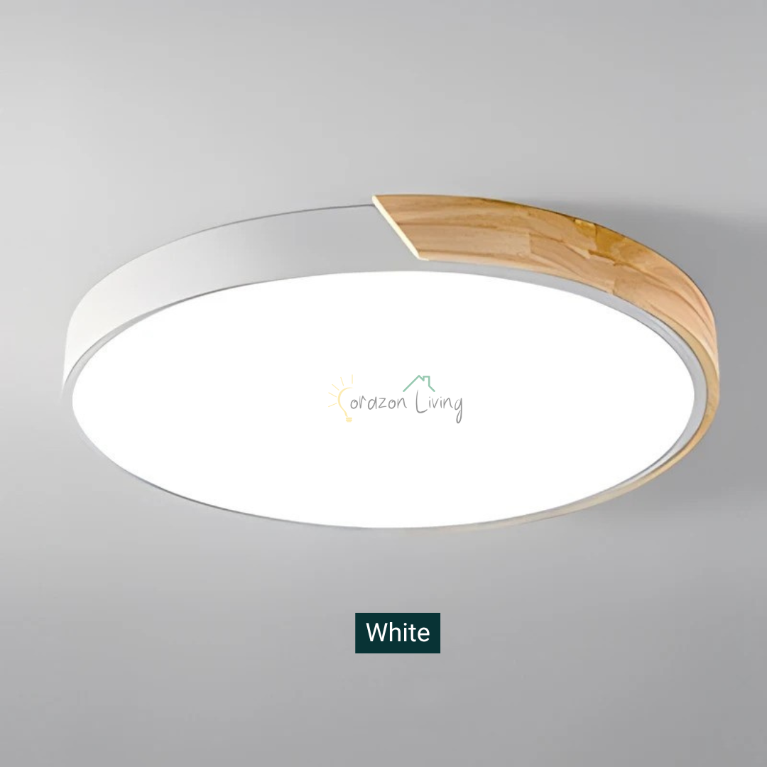 Enhance your room with this post modern wood and acrylic round ceiling light, combining stylish design with energy-efficient, warm lighting.