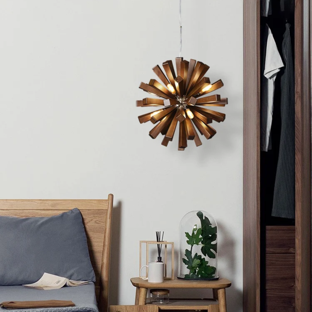 This rustic yet refined wooden pendant light features a satellite-style silhouette that diffuses light softly, creating a cozy, ambient glow. The perfect statement lighting for lovers of creative, handcrafted décor, it complements both modern and traditional interiors.