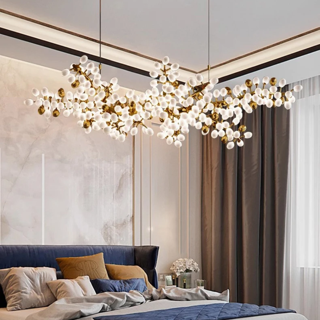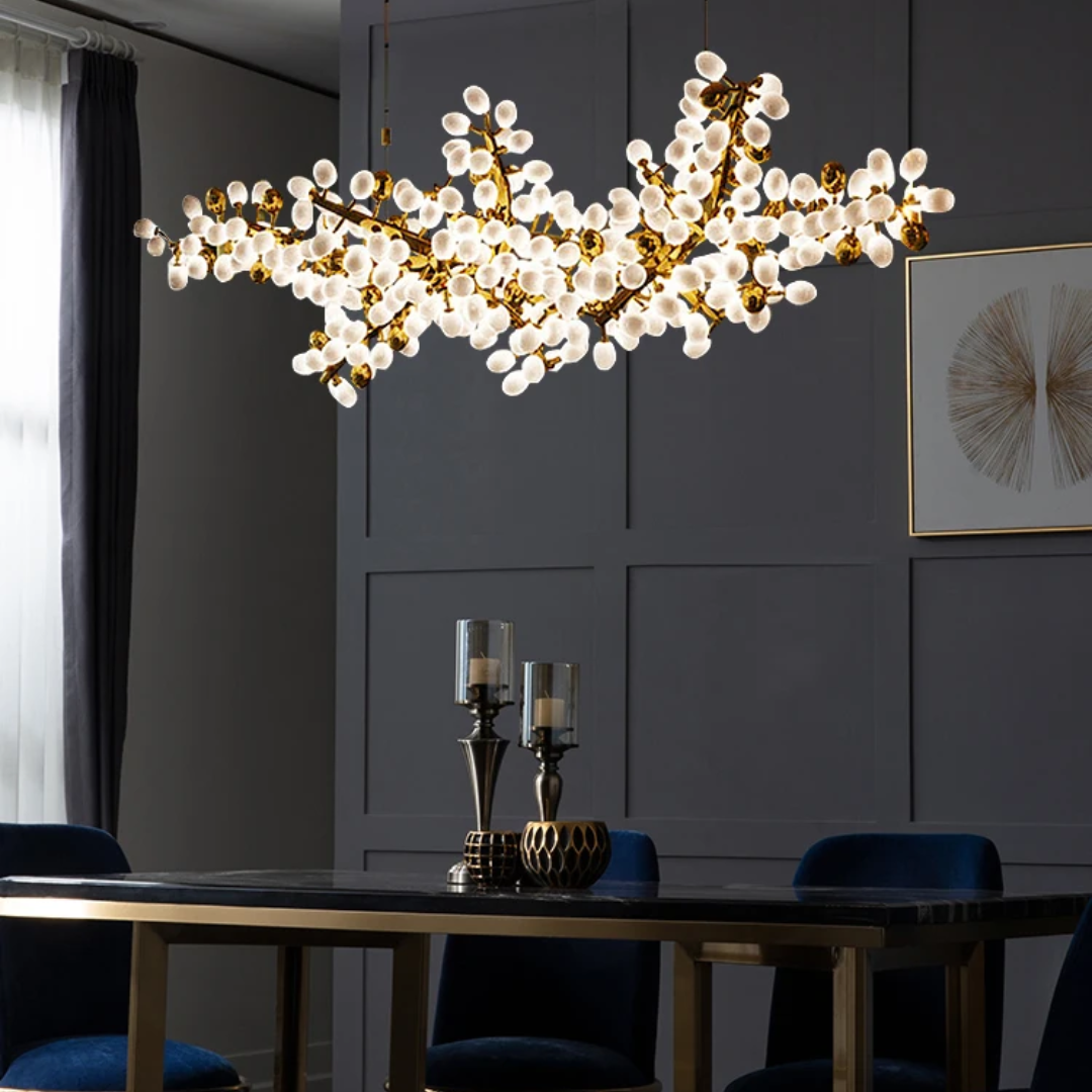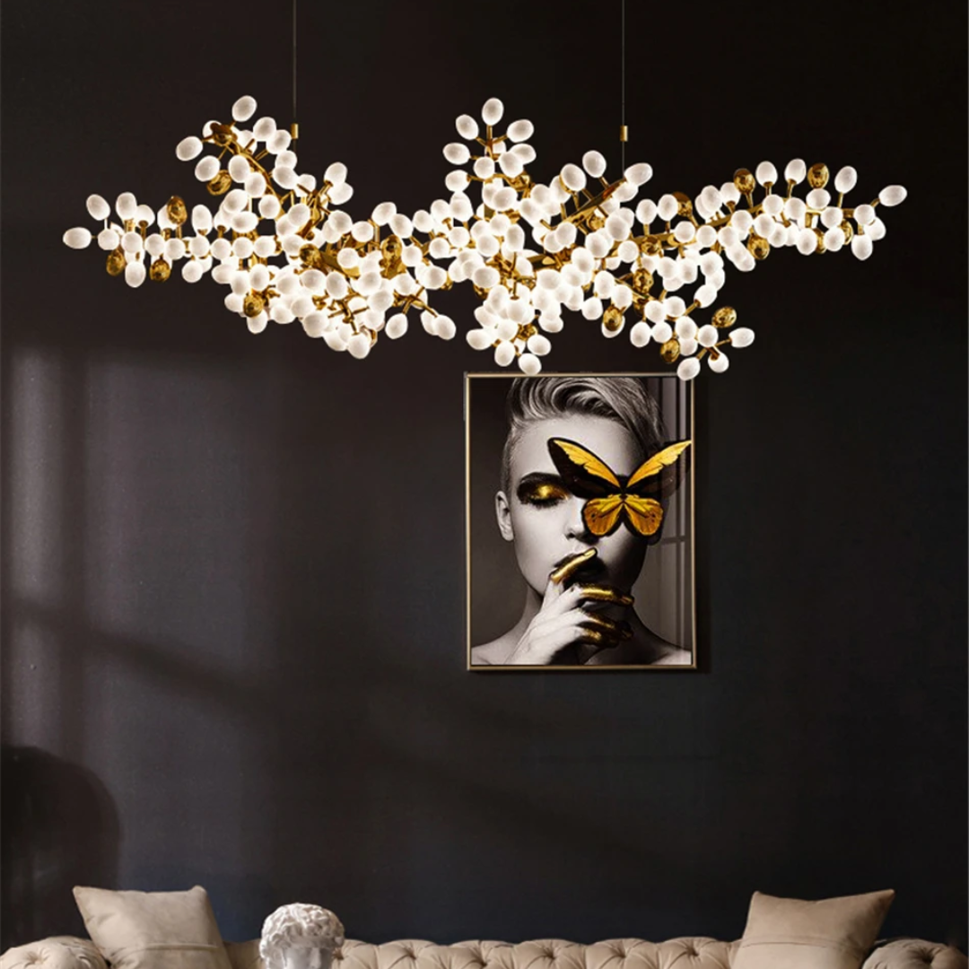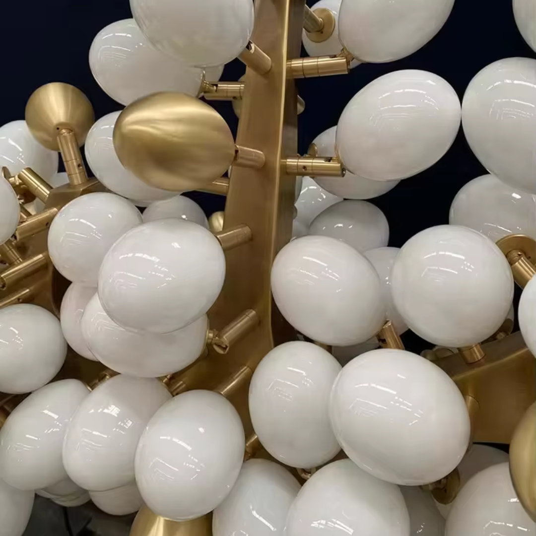 Each sculptural branch is meticulously handmade, ensuring every Lenora chandelier is a one-of-a-kind piece. Clusters of milk-white and gold grape-shaped glass globes add both sophistication and softness, echoing the charm of nature in bloom.