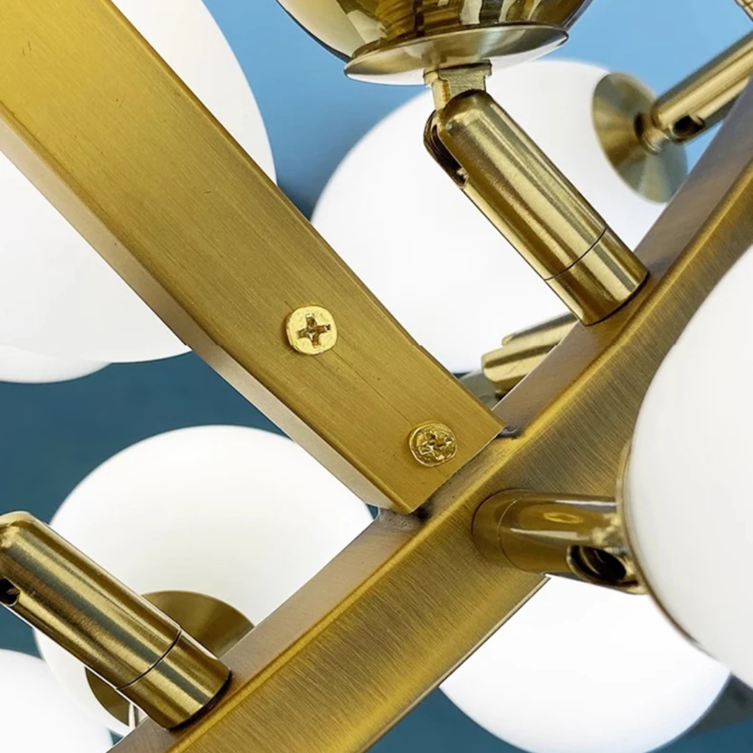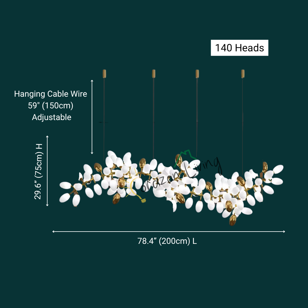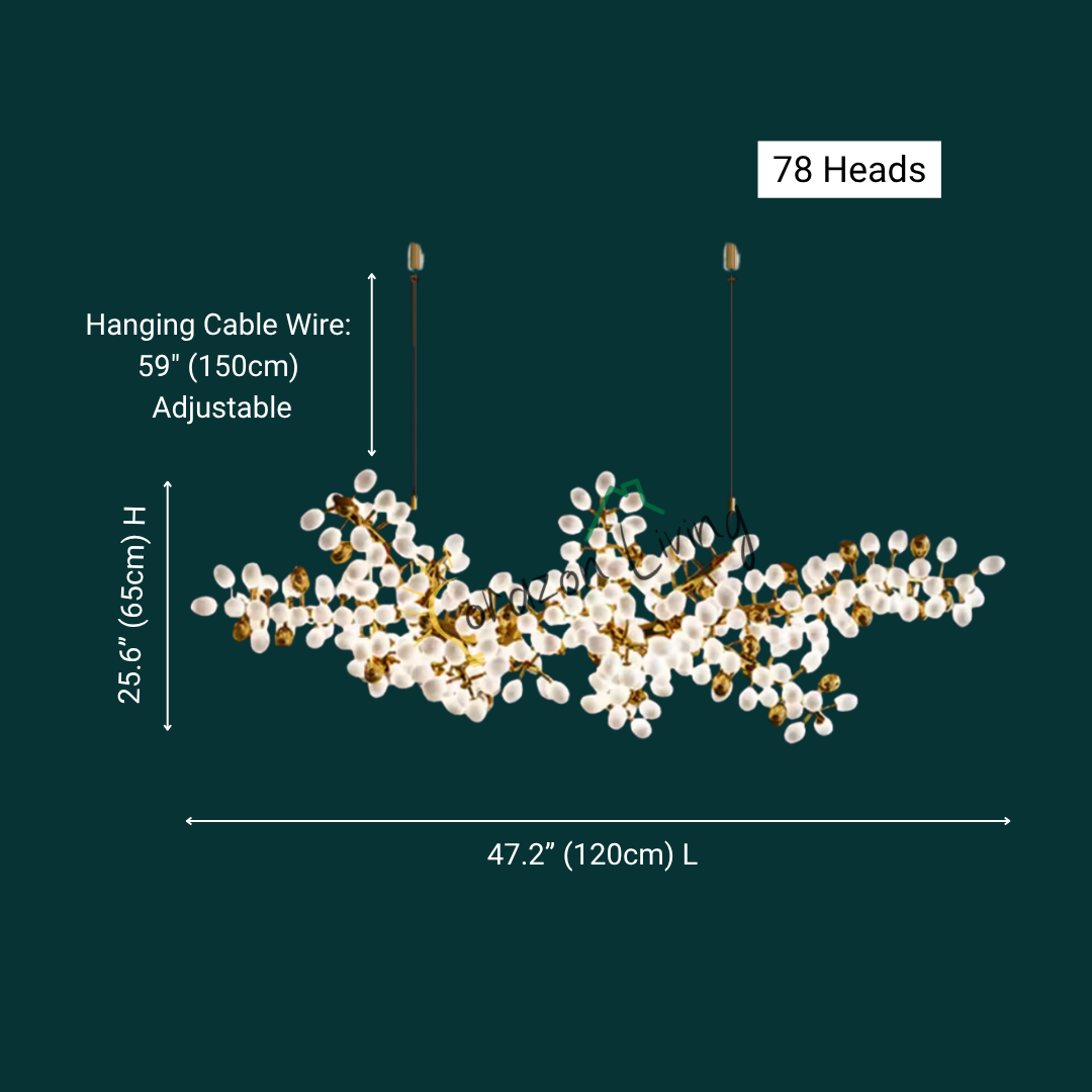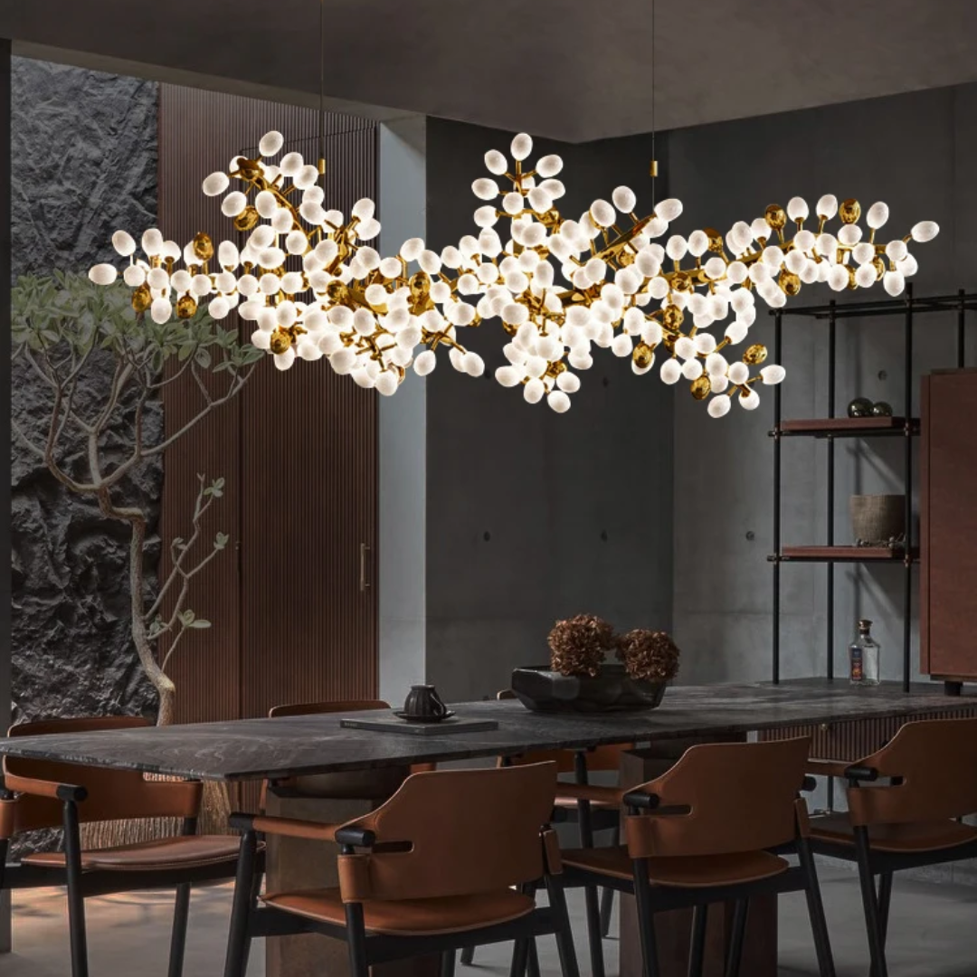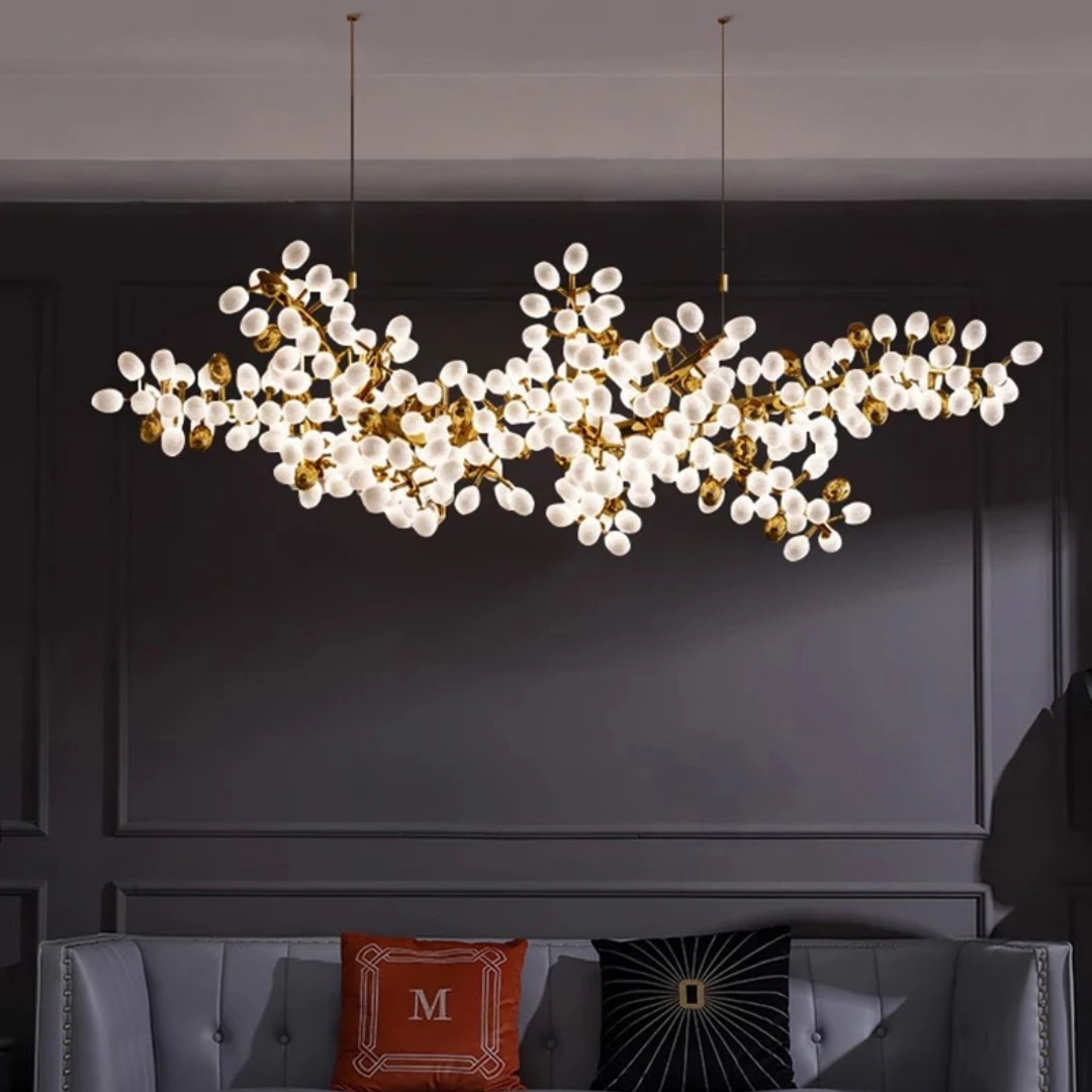 Each sculptural branch is meticulously handmade, ensuring every Lenora chandelier is a one-of-a-kind piece. Clusters of milk-white and gold grape-shaped glass globes add both sophistication and softness, echoing the charm of nature in bloom.