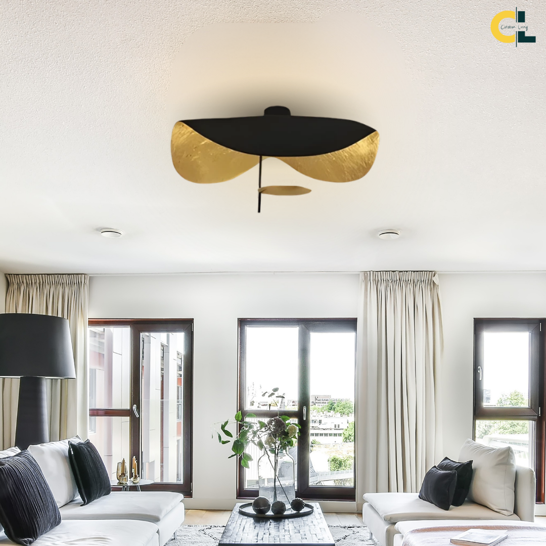 Elevate your interior with the Lumiere Creative Hat Inspired LED Ceiling Lamp, a striking fusion of contemporary minimalism and artistic design. Inspired by the shape of a flying shuttle or lotus leaf, this ceiling light delivers both functionality and visual elegance. The sleek exterior, combined with a warm gold inner finish, creates an ambient glow ideal for living rooms, bedrooms, coffee shops, hotels, and other stylish indoor settings. Available in three elegant color combinations – Black & Gold, White & Gold, and White & White – this mounted LED lamp adds a bold yet refined statement to any space.