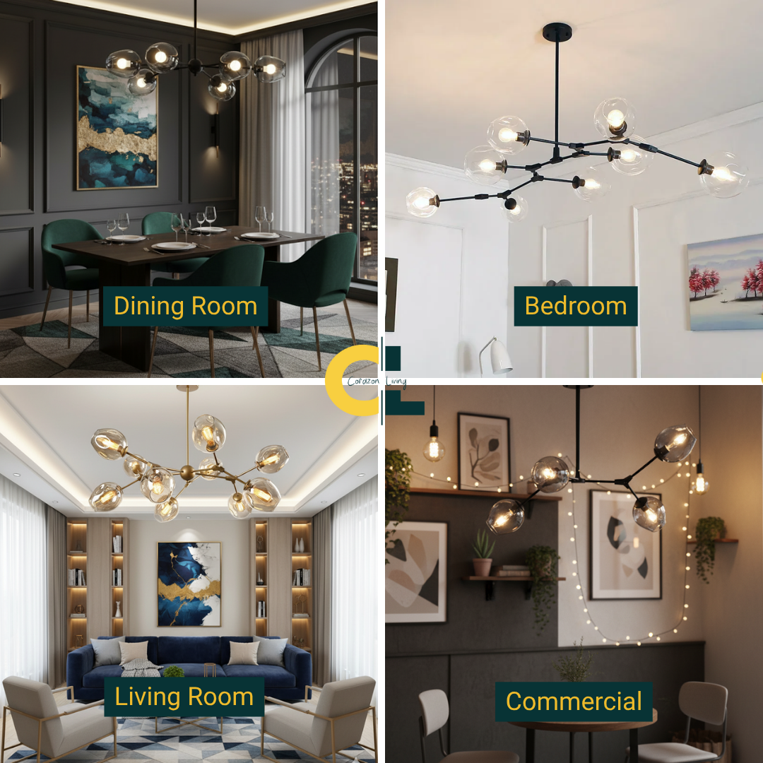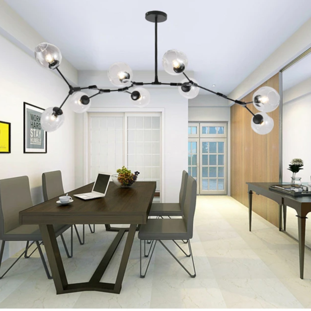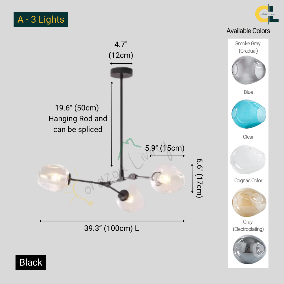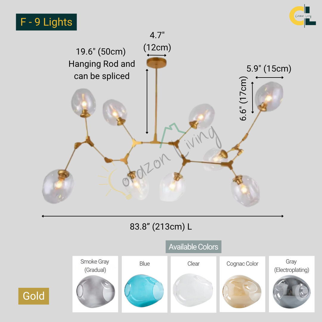 Crafted from durable anodized aluminum in your choice of sleek black or radiant gold, Michaela draws inspiration from the work of renowned UK architects known for luxury apartment interiors. Its artistic glass globes are available in a range of distinctive hues and configurations, from 3 to 12 heads β allowing you to tailor the design to your space.
