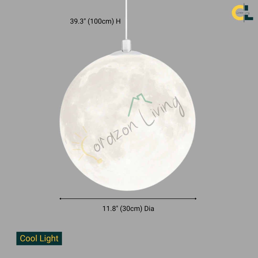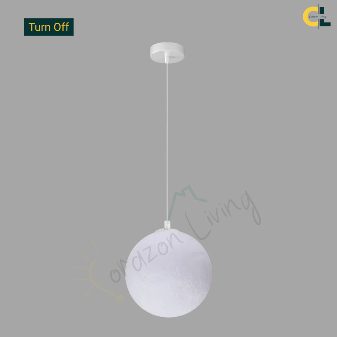 A modern 3D-printed moon pendant that casts soft, ambient LED light, blending artistic detail with cozy, elegant illumination for any interior