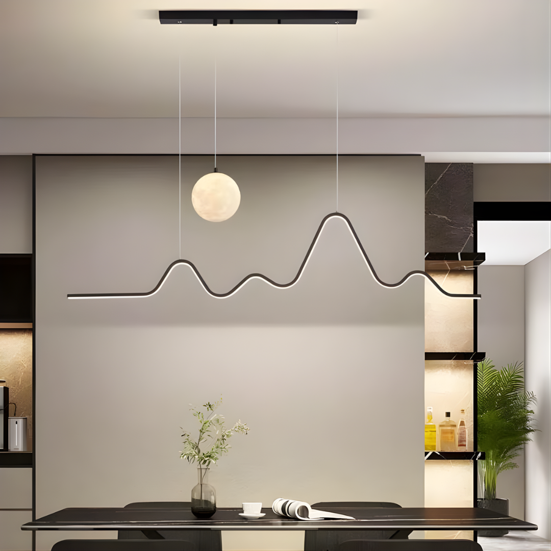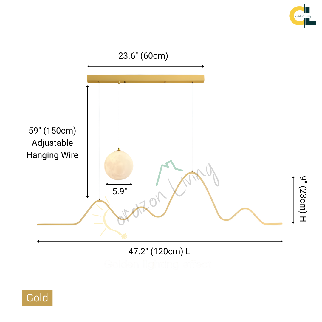 Elevate your interiors with the Moonstone LED Pendant Light, a modern lighting solution inspired by the moon rising above mountains. Its graceful design, premium materials, and versatile illumination create a serene and artistic focal point. Available in black, gold, and white, this fixture enhances living rooms, bedrooms, dining areas, and offices. Crafted from iron, aluminum, PLA, and silica gel, it combines durability, lightweight elegance, and soft, diffused lighting.