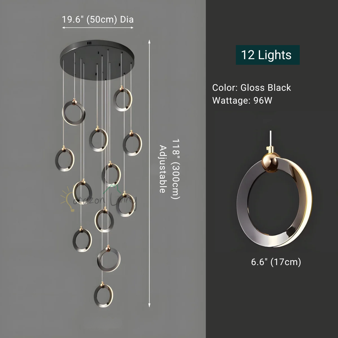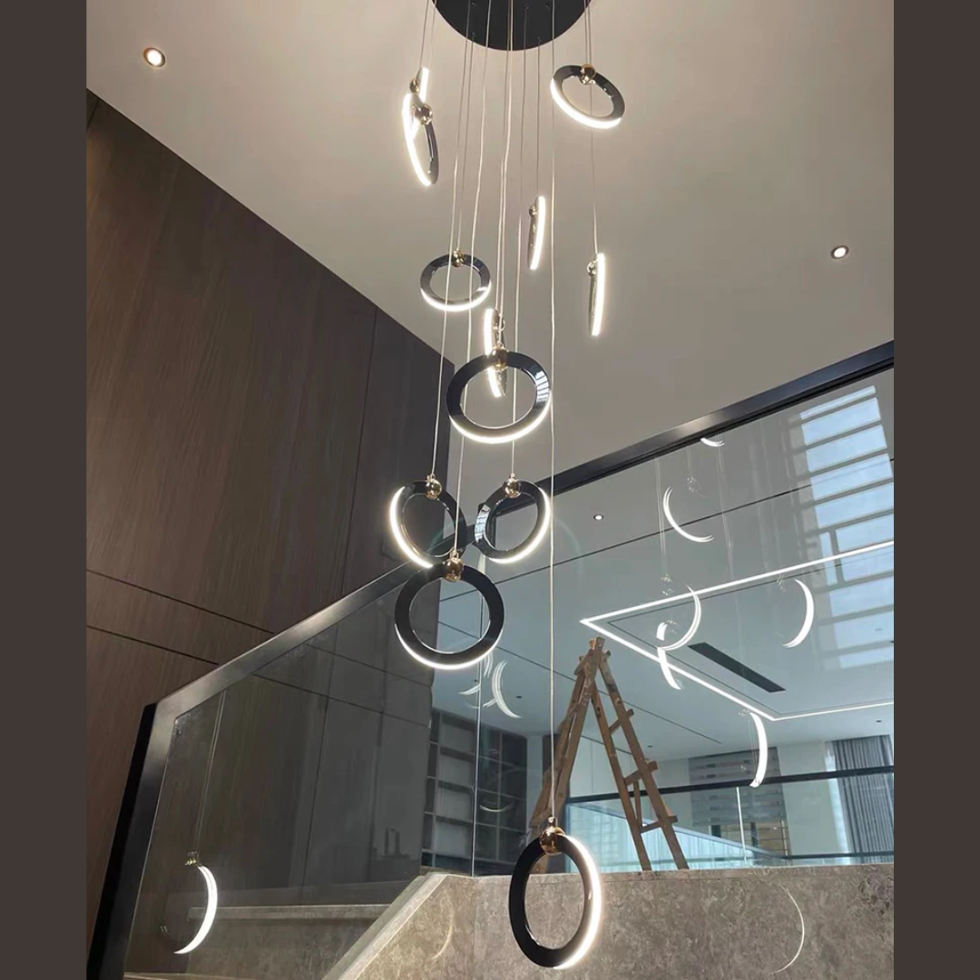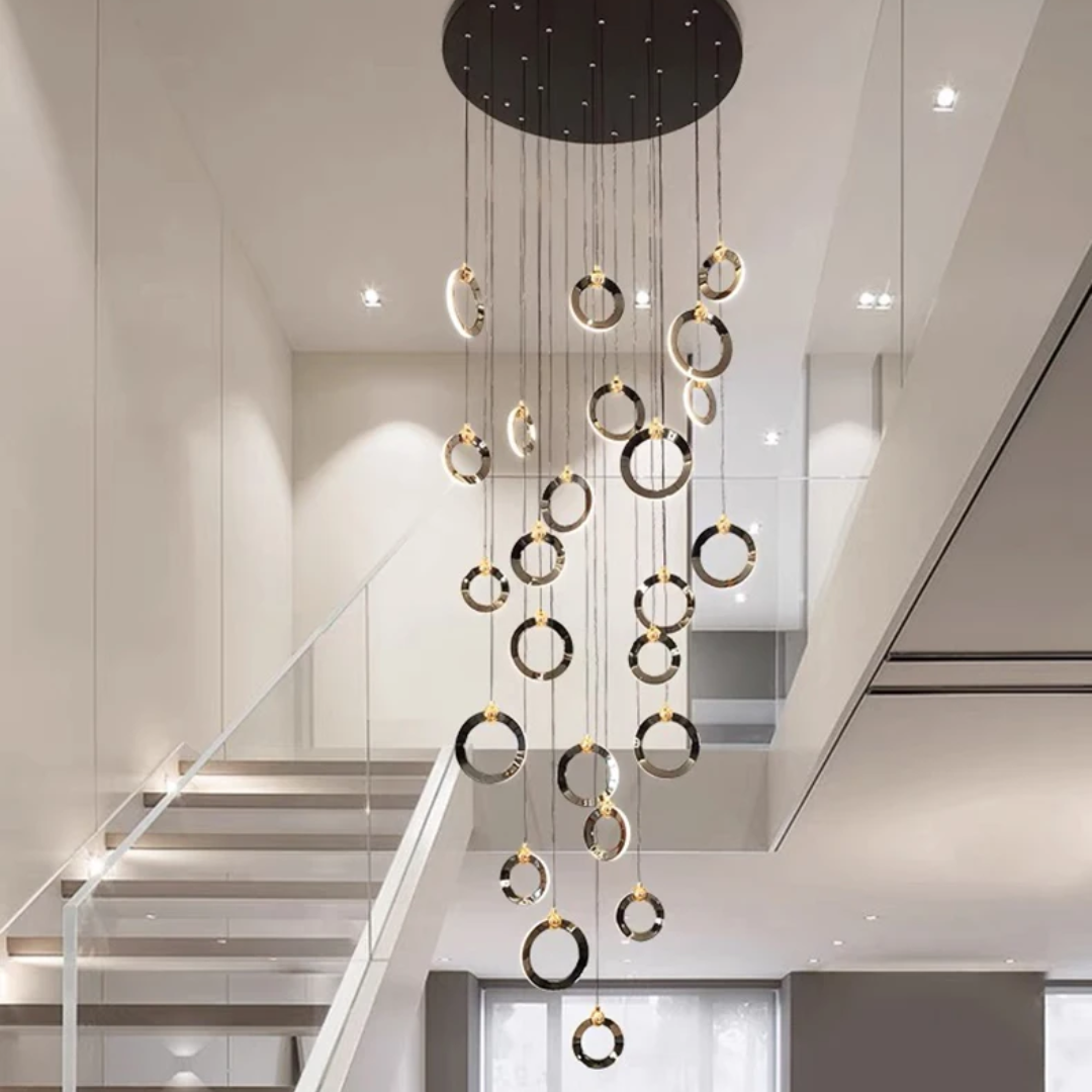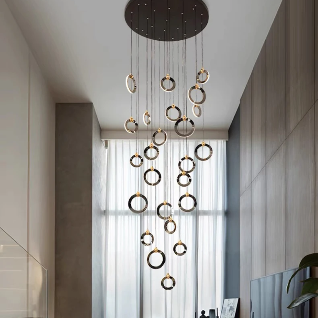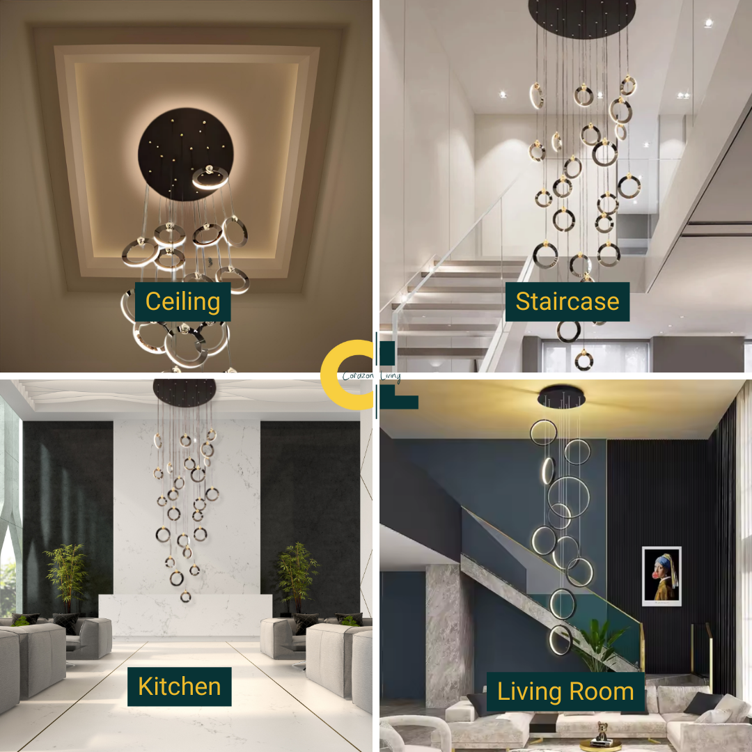 Immerse yourself in the futuristic elegance of Nimbra- a lighting masterpiece where post modern design meets celestial inspiration. Sculpted metal rings, adorned with integrated LED acrylic lights, emit a soft, ethereal glow that transforms stairwells, living rooms, lobbies, and entrances into mesmerizing showcases of light and style.