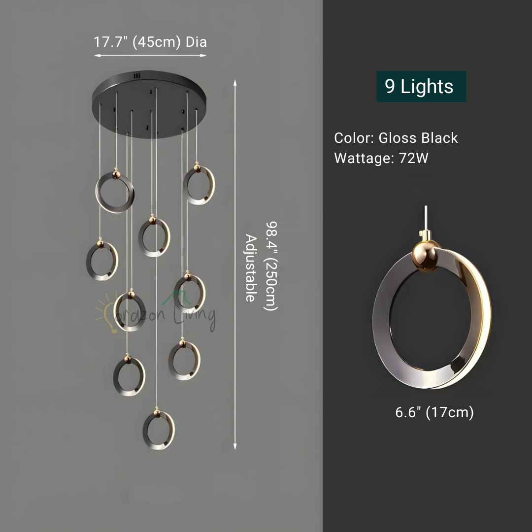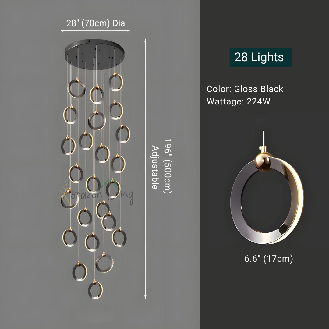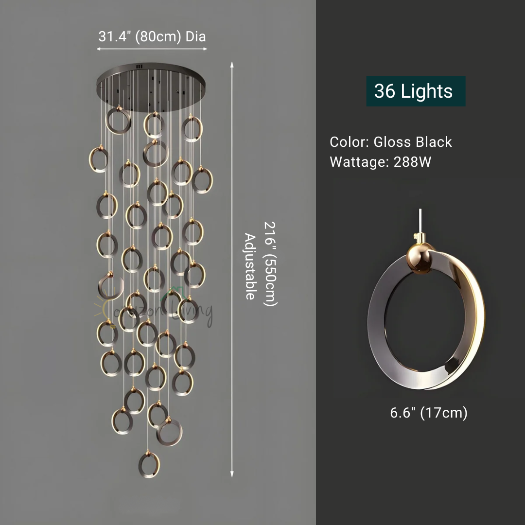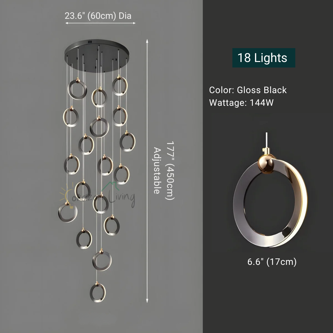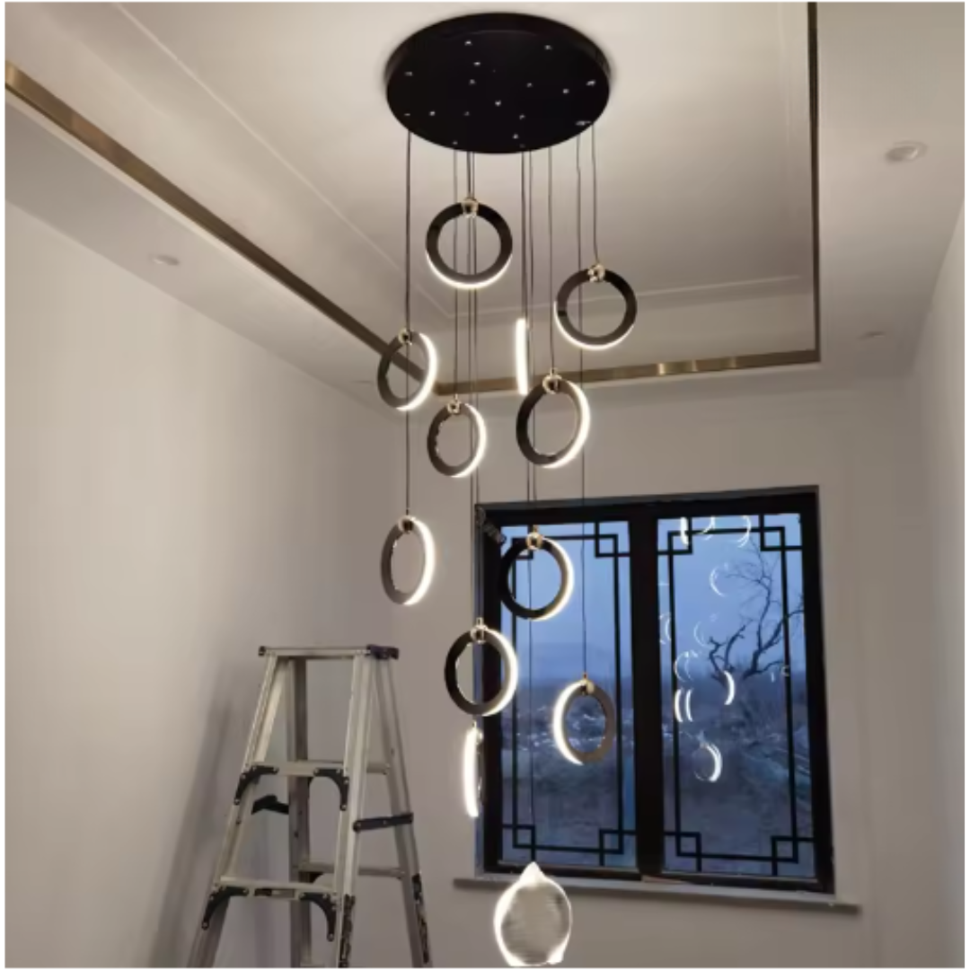 Immerse yourself in the futuristic elegance of Nimbra- a lighting masterpiece where post modern design meets celestial inspiration. Sculpted metal rings, adorned with integrated LED acrylic lights, emit a soft, ethereal glow that transforms stairwells, living rooms, lobbies, and entrances into mesmerizing showcases of light and style.