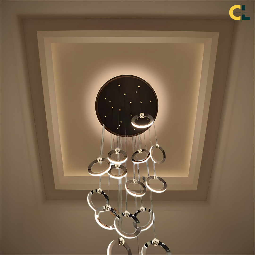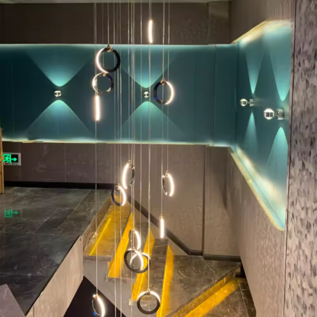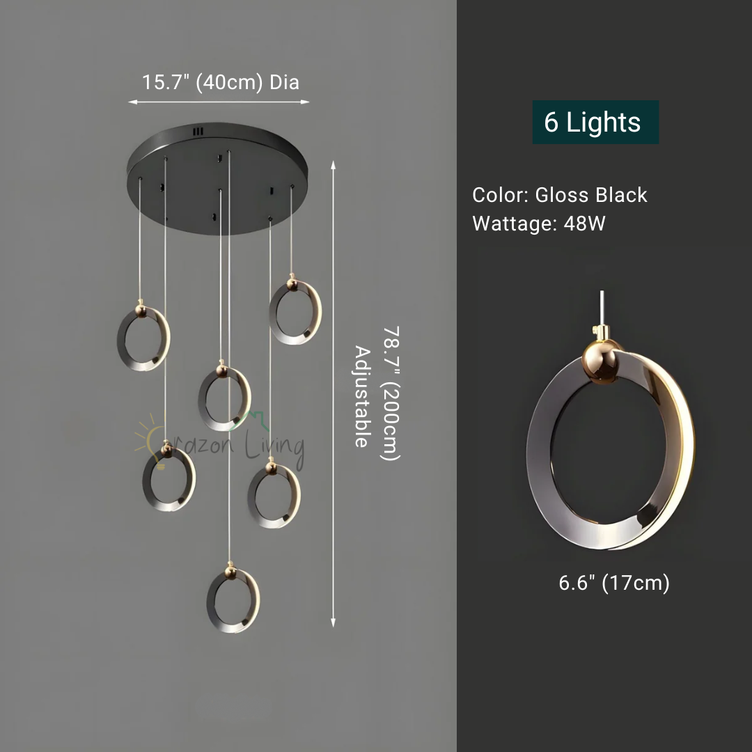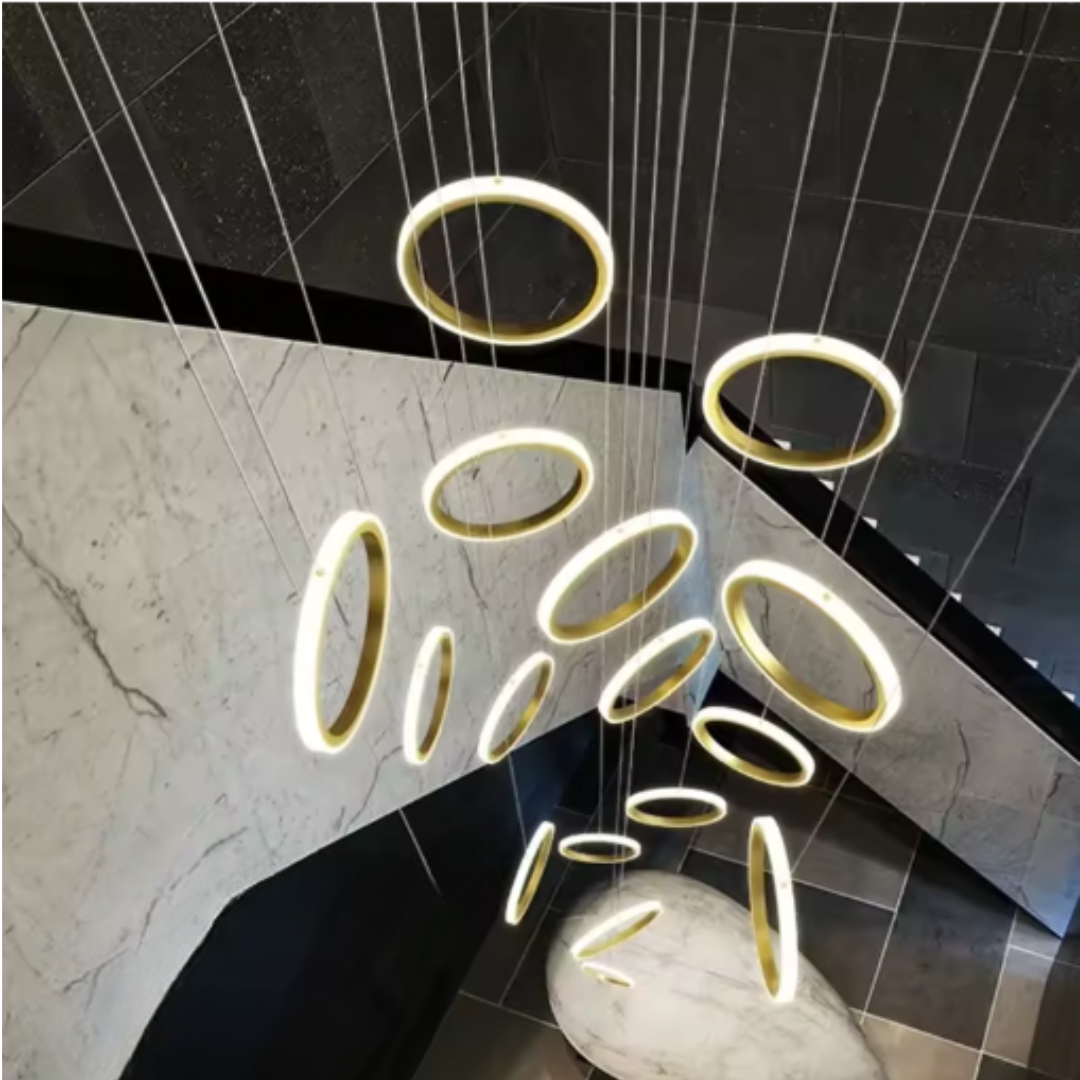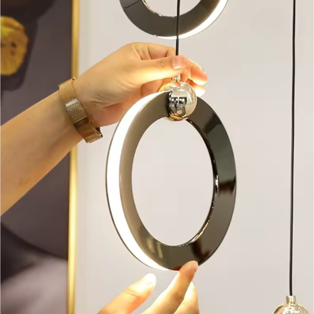 Immerse yourself in the futuristic elegance of Nimbra- a lighting masterpiece where post modern design meets celestial inspiration. Sculpted metal rings, adorned with integrated LED acrylic lights, emit a soft, ethereal glow that transforms stairwells, living rooms, lobbies, and entrances into mesmerizing showcases of light and style.