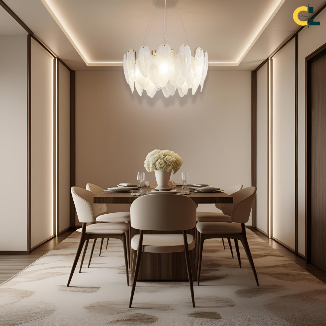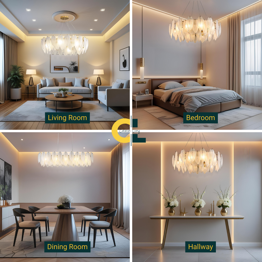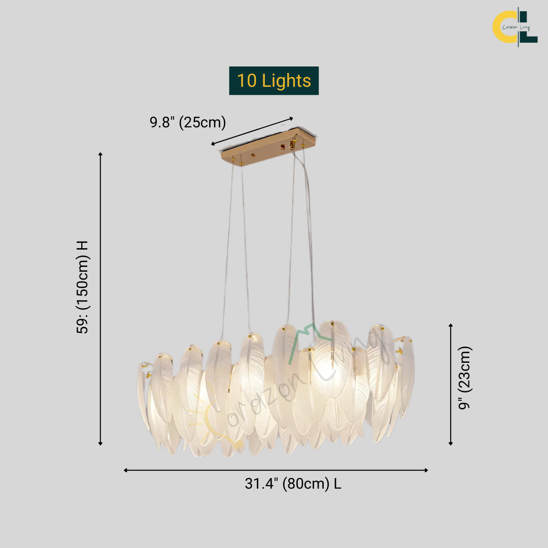 The Odette Modern Feather Crystal Chandelier brings a touch of refined artistry to your home. Featuring hand-crafted glass feather panels arranged in a circular and rectangular design, this chandelier diffuses a warm, inviting glow while adding sophistication to any modern interior.