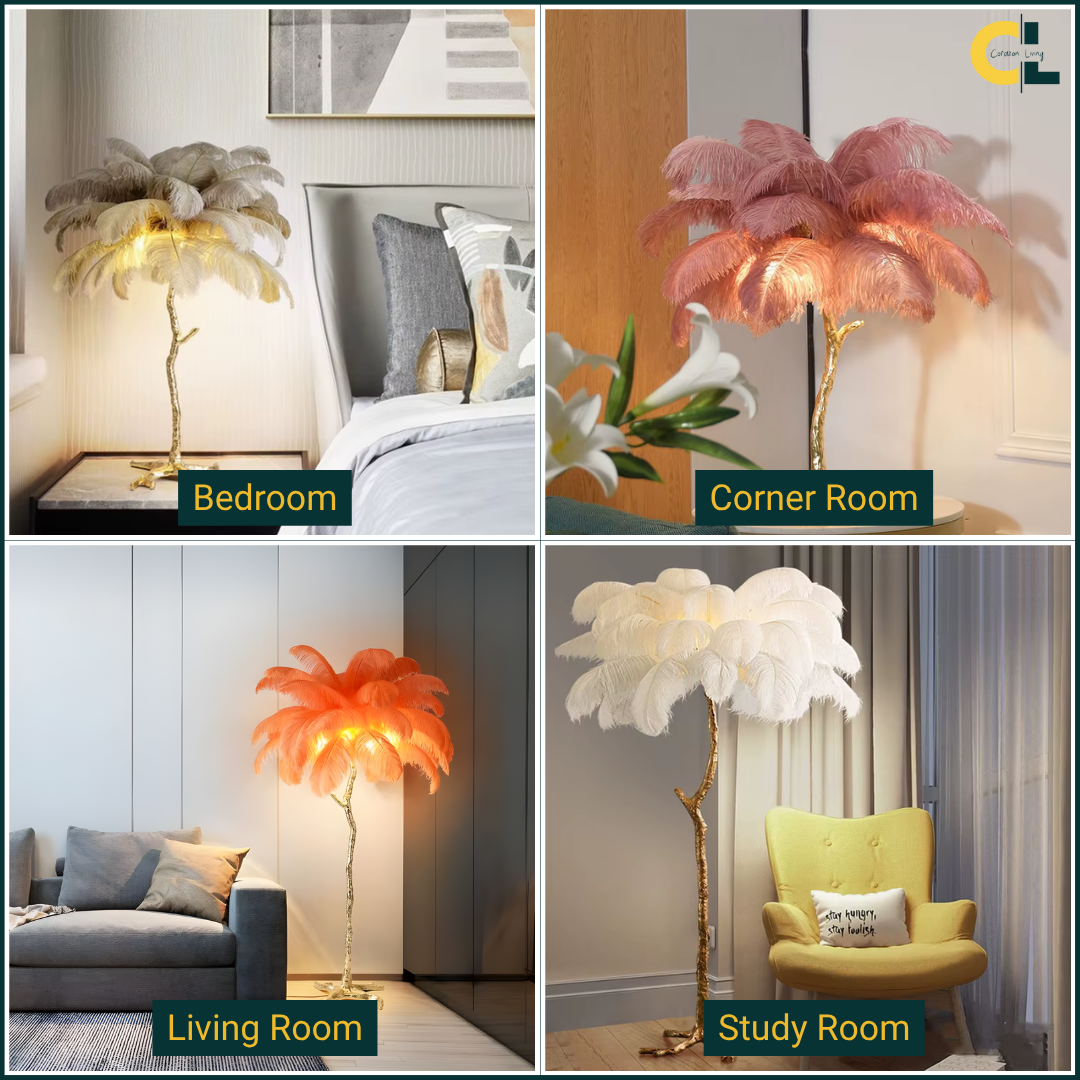 Add a touch of tropical luxury with this palm-inspired ostrich feather floor lamp, offering whimsical style and gentle illumination.al Palm-Inspired Ostrich Feather Floor Lamp