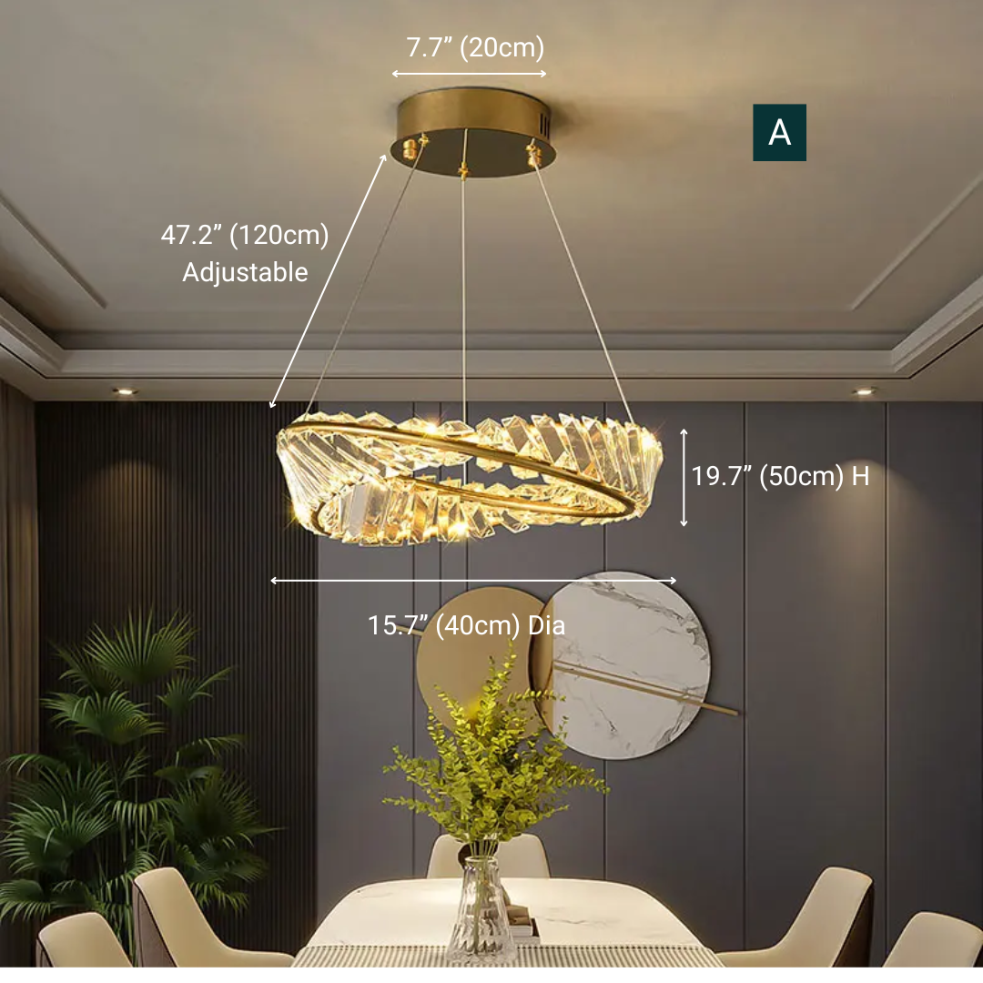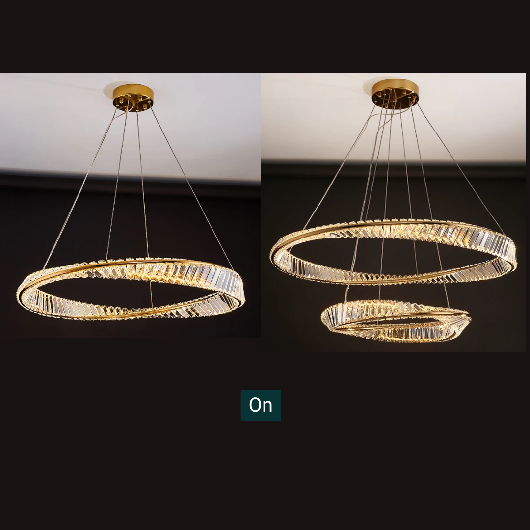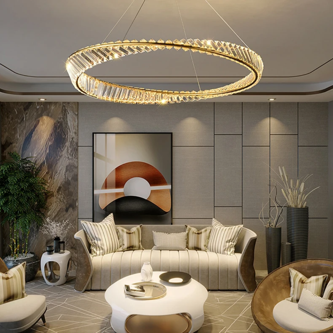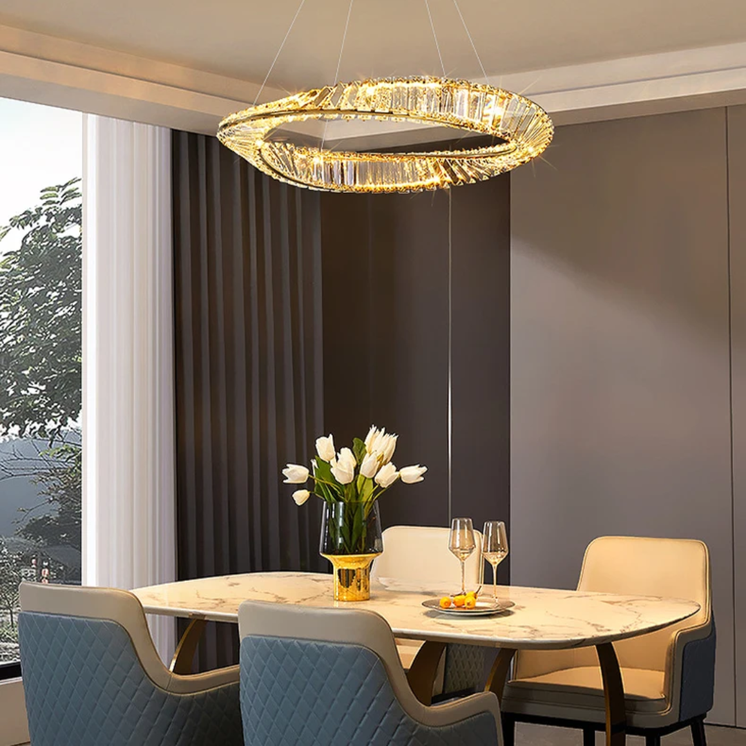 The Elegant Ring-Shaped Crystal LED Chandelier features a modern circular design adorned with sparkling crystals for a luxurious glow.