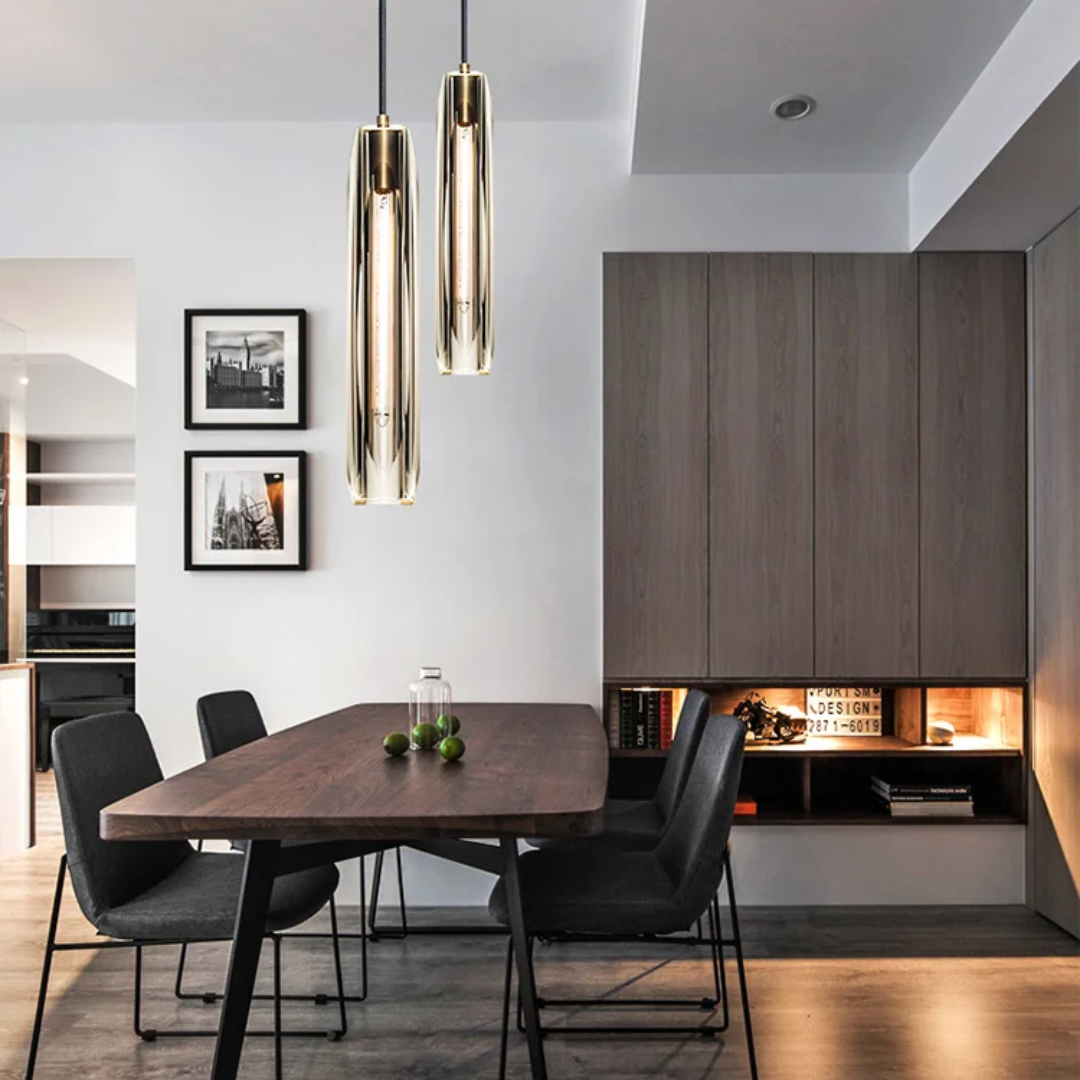 A sleek pendant light combining lustrous K9 crystals with a refined brass finish for a sophisticated glow.