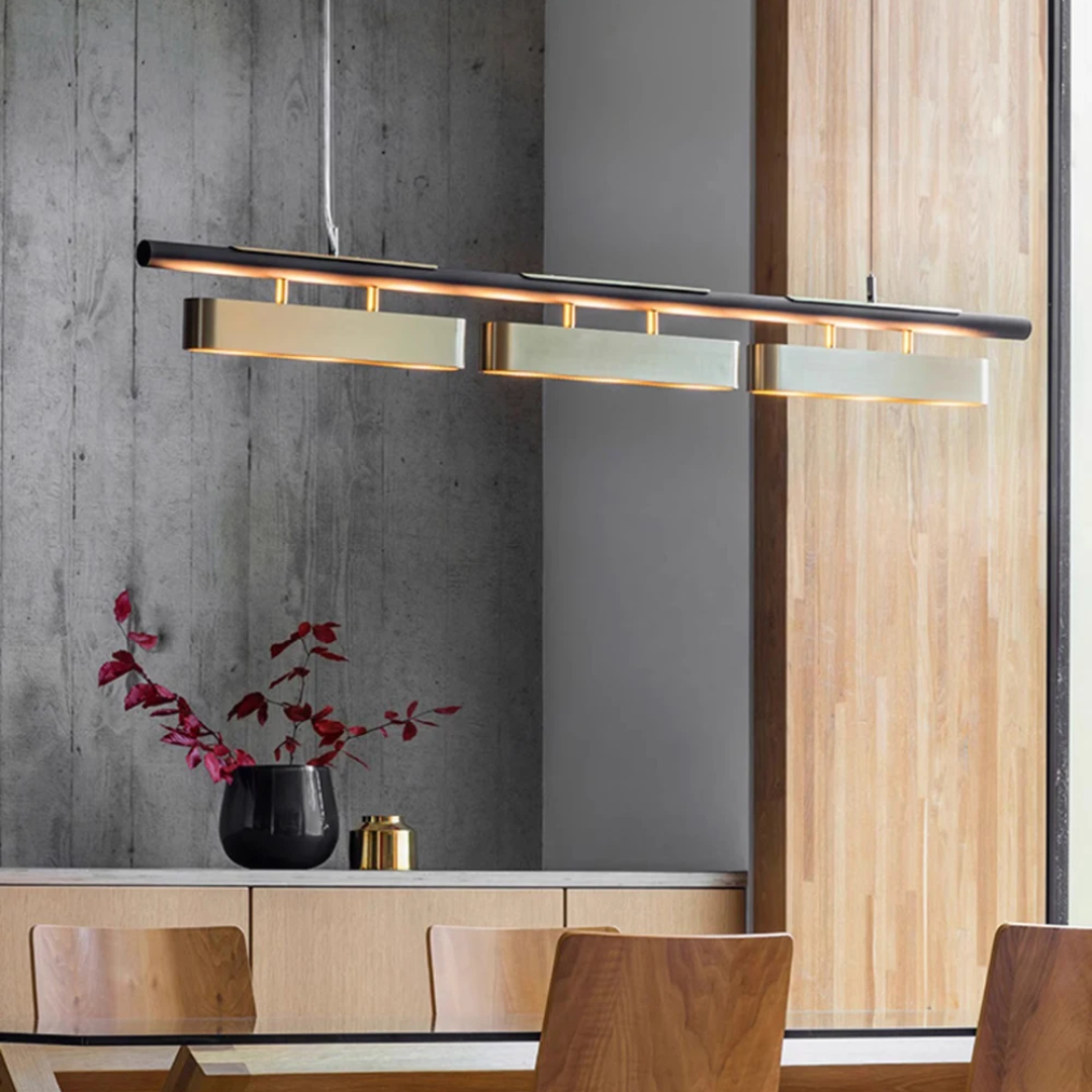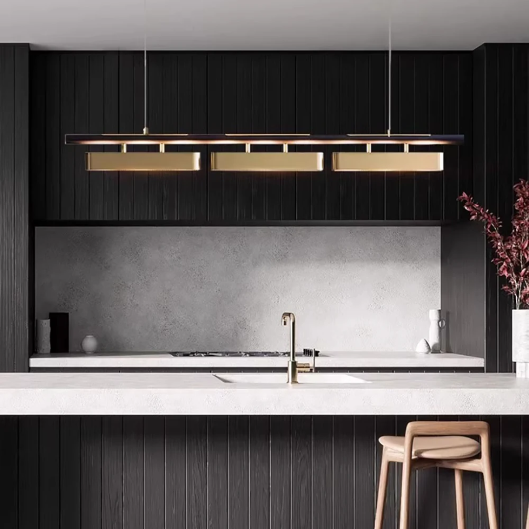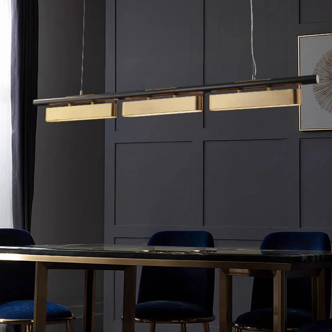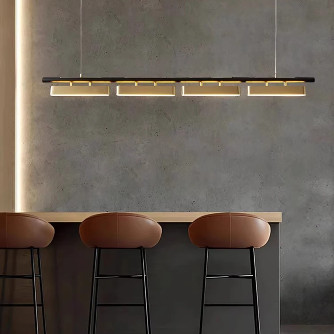 A statement lighting piece that embodies postmodern sophistication with a golden stainless steel finish, refined craftsmanship, and adjustable luminous elegance.