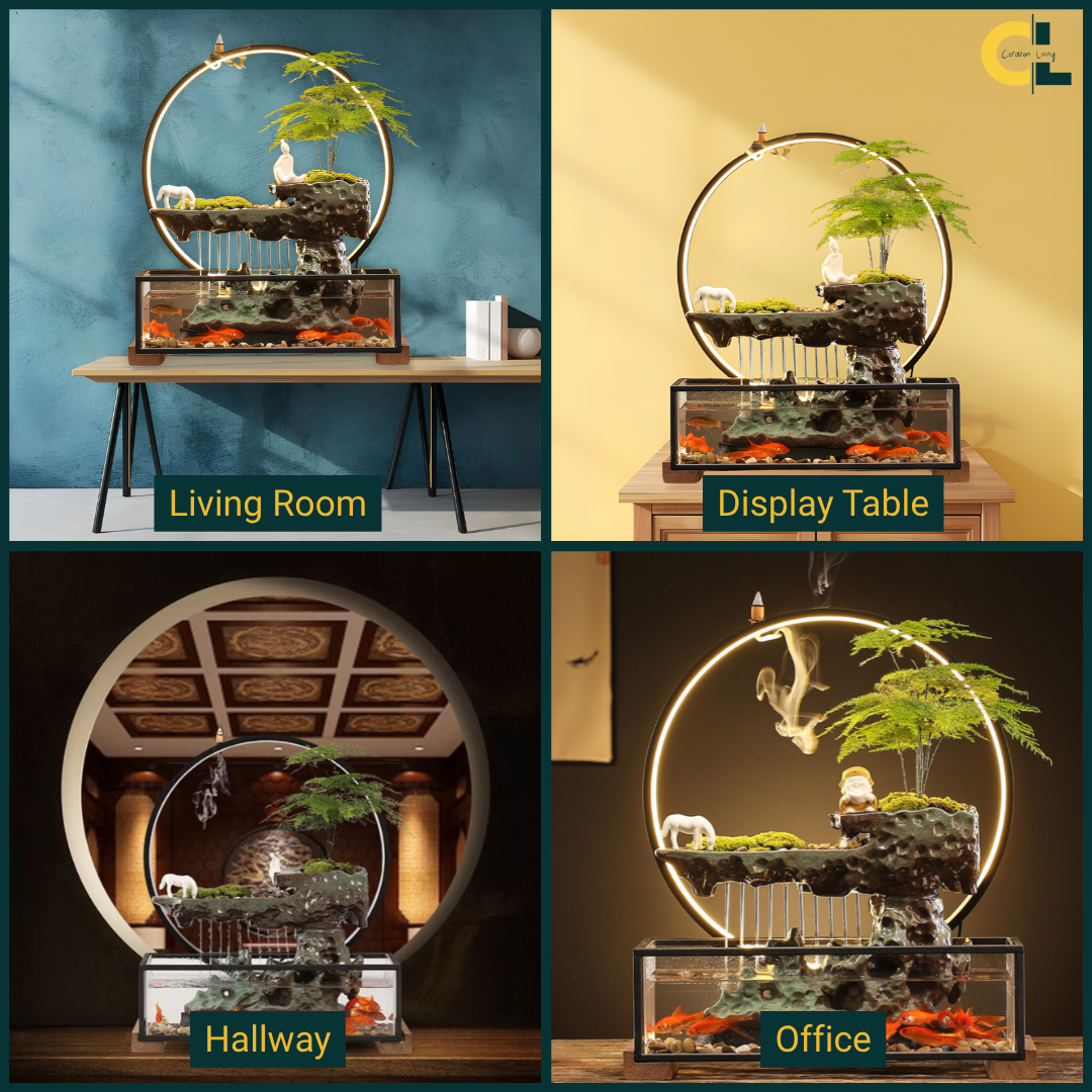 Introduce serenity and elegance into your space with the Zenara Aquarium Tabletop Fountain. This beautifully crafted ceramic fountain combines the calming flow of circulating waterfalls with a built-in aquarium, creating a harmonious balance of nature and art. Designed with Feng Shui principles, it promotes positive energy while serving as a functional humidifier with soothing mist. Perfect for your living room, office, or meditation space, Zenara transforms any surface into a tranquil retreat with its soft water sounds, gentle illumination, and artistic design.